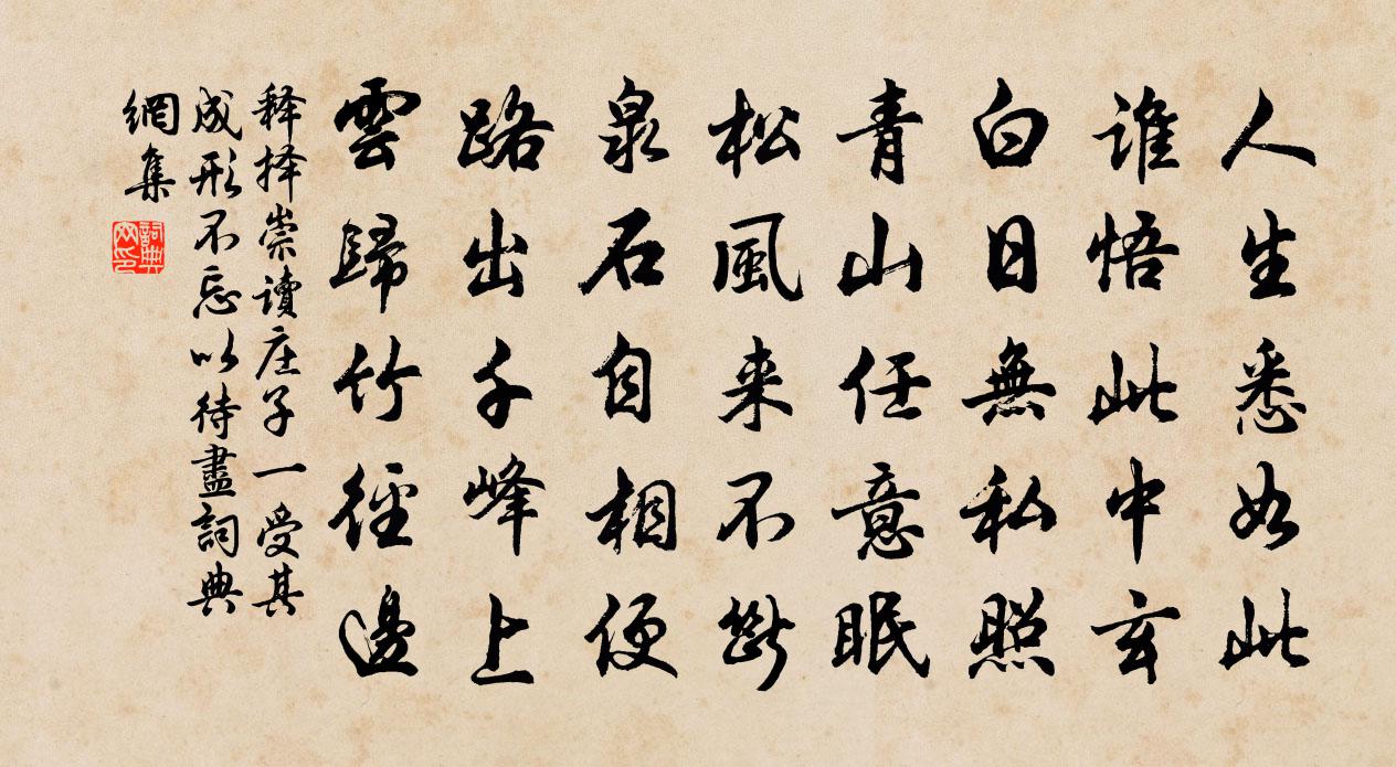詩詞名句歷史字典書法欣賞書法字典國語詞典說文解字康熙字典古漢語字典標 題 作 者 詩 句 讀莊子一受其成形不忘以待盡作者:釋擇崇 朝代:宋代原文人生悉如此,誰悟此中玄。白日無私照,青山任意眠。松風來不斷,泉石自相便。路出千峰上,雲歸竹徑邊。詩詞問答問:《讀莊子一受其成形不忘以待盡》的作者是誰?答:釋擇崇問:該詩寫於哪個朝代?答:宋代書法欣賞讀莊子一受其成形不忘以待盡書法作品詩詞推薦偈釋心道〔宋代〕契丹打破波斯寨,奪得寶珠村里賣。十字街頭窮乞兒,腰間掛個風流袋。讀明妃引陳僩〔宋代〕驪山舉燧因褒姒,蜀道蒙塵為太真。能遣明妃嫁夷狄,畫工原是漢忠臣。洪都病中口占吳泳〔宋代〕去年輿疾上洪州,百感嬰懷又怕秋。病體不因衰後覺,宦情誰向死前休。乞身已晚荒三徑,葬子無期負一丘。造物已亥雜詩 297龔自珍〔清代〕蒼生氣類古猶今,安用冥鴻物外吟。不是九州同急難,尼山誰識憮然心。海鹽鹿苑寺聞人宇〔宋代〕郡邑相望路半停,屹然香剎從林坰。罷參釋子忘情久,供胡伴僧入夢靈。東去無情波繚繞,西來有意柏蔥青。定知寄題趙德成東岩方岳〔宋代〕人間無處著我輩,只可飛泉蘚石邊。習氣猶餘子虛賦,苦令猿鶴怨風煙。丁亥生日紀事五首方回〔宋代〕千世謀生百念捐,窮空肯復受人憐。九還未悟長生訣,七袠初開本命年。寡慾自來甘淡薄,忘機時或放狂顛。歸舟試院春晴陳與義〔宋代〕今日天氣佳,忽思賦新詩。春光挾晴色,併上桃花枝。白雲浩浩去,天色青陸離。余霏遇晚日,彩翠紛新奇。天公荒城趙葵〔宋代〕城荒葉落風颼颼,淮水茫茫古渡頭。回首不堪行樂地,黃花點點是離愁。別聰道人歸縉雲楊億〔宋代〕二年假守栝蒼城,郡榻唯師即送迎。擣藥幾憐春漏永,調琴長待夜蟾生。心猿已伏都無念,海鳥相逢自不驚。送別澄碧堂唐珙〔元代〕黃河一清三千年,行潦滅沒崑崙源。我當濯足萬里外,卻怪塵土生青天。何如曹溪一滴水,太阿削平如礪砥。三江浪淘沙王觀〔宋代〕素手水晶盤。壘起仙丸。紅綃剪碎卻成團。逗得安排金粟遍,何似雞冠。味勝玉漿寒。只被宜酸。莫將荔子一般看丙午普覺看梅劉植〔宋代〕寂寂西岩寺,何人訪靜來。重尋舊遊地,惟有道師梅。樹蠹應留雪,香清不受埃。可堪玄鬢改,春已隔年催。郡治西廳錦被花不為治架每花開覆地而紅或緣鄭剛中〔宋代〕栽花傍庭砌,立木為花屋。小戶虛一偏,橫窗置其腹。分竹接桑蔓,尺寸引勾曲。春工直解事,夜雨頻澆沃。枝條臥病葛紹體〔宋代〕欹枕小春雨,虛屏半夜風。病驚身是客,愁恐鬢成翁。窗曙逗微白,燈寒帶淺紅。歸期倩誰卜,心掛浙江東。用翁雪舟送春韻三首蒲壽宬〔宋代〕底事黃鸝喚不休,出門欣見綠陰稠。殘花滿地無人掃,芳草連天起客愁。淚落田間聞牧笛,醉歸江上問漁舟。杜鵑再用前韻贈高司理共八首陳造〔宋代〕衰宗如此況他揚,碌碌諸雛欠肯堂。薄宦幽憂殊未醒,故園歸夢可勝長。杯盤頓頓家雞嫩,翁媼鳴鳴社酒香。猶記送宣武徐巡官羅隱〔唐代〕傲睨公卿二十年,東來西去只悠然。白知關畔元非馬,玄覺壺中別有天。漢帝詔銜應異日,梁王風雪是初筵。臨行西子妝慢·湖上清明薄游吳文英〔宋代〕流水麴塵,艷陽醅酒,畫舸游情如霧。笑拈芳草不知名,乍凌波、斷橋西堍。垂楊漫舞。總不解、將春系住。燕歸戰城南汪遵〔唐代〕風沙刮地塞雲愁,平旦交鋒晚未休。白骨又沾新戰血,青天猶列舊旄頭。名句推薦過雨西風,數葉井梧愁舞。吳文英《荔枝香近·七夕》 四十三年,望中猶記,烽火揚州路。辛棄疾《永遇樂·京口北固亭懷古》 廢一善,則眾善衰。賞一惡,則眾惡歸。黃石公《三略·下略》 見未真,勿輕言。知未的,勿輕傳。李毓秀《弟子規·信》 今日漢宮人,明朝胡地妾。李白《王昭君二首》 禮者,人道之極也。荀子《荀子·禮論》 今夕不登樓,一年空過秋。高觀國《菩薩蠻·何須急管吹雲暝》 不是花中偏愛菊,此花開盡更無花。元稹《菊花》 魯酒不可醉,齊歌空復情。李白《沙丘城下寄杜甫》 拜迎長官心欲碎,鞭撻黎庶令人悲。高適《封丘作》