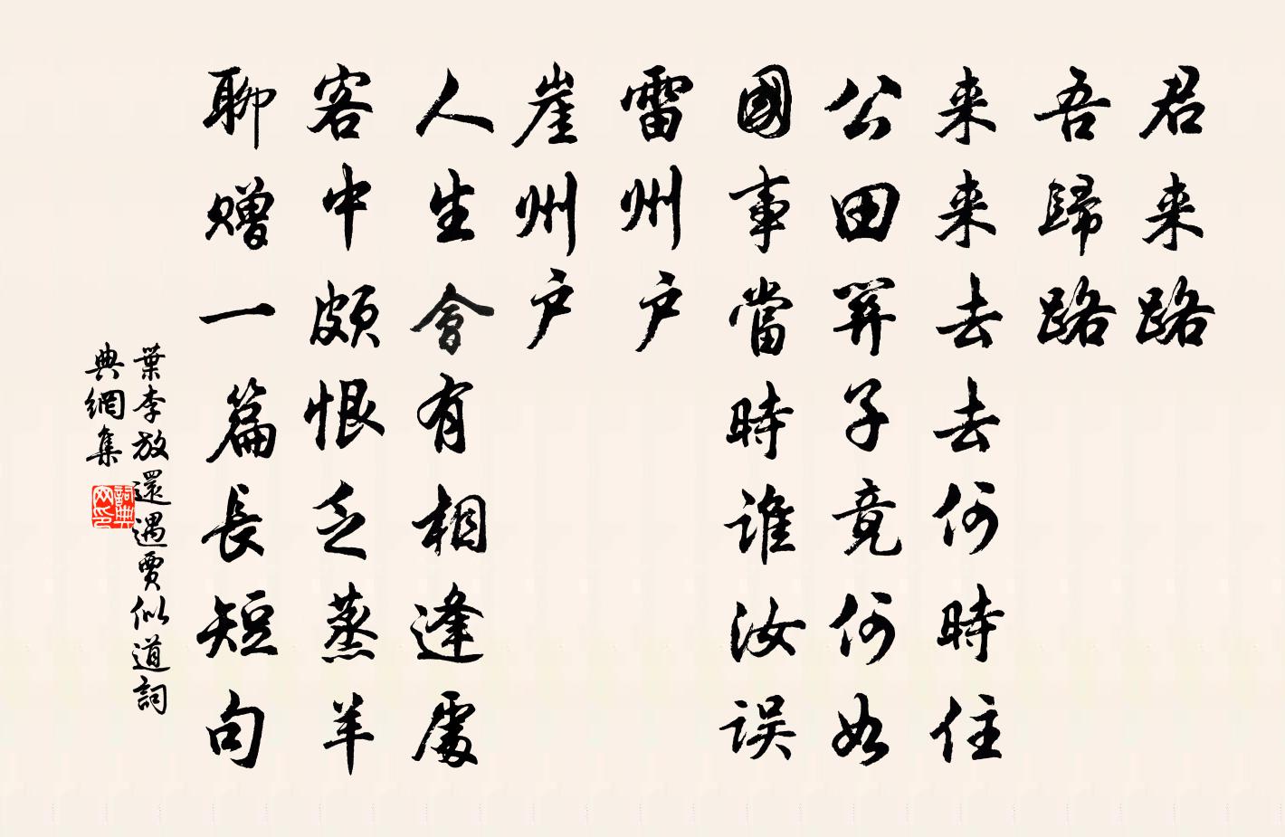詩詞名句歷史字典書法欣賞書法字典國語詞典說文解字康熙字典古漢語字典標 題 作 者 詩 句 放還遇賈似道作者:葉李 朝代:宋代放還遇賈似道原文君來路,吾歸路,來來去去何時住。公田關子竟何如,國事當時誰汝誤。雷州戶,崖州戶,人生會有相逢處。客中頗恨乏蒸羊,聊贈一篇長短句。詩詞問答問:放還遇賈似道的作者是誰?答:葉李問:放還遇賈似道寫於哪個朝代?答:宋代葉李放還遇賈似道書法欣賞放還遇賈似道書法作品詩詞推薦小重山(紅木樨次謝先輩韻)趙以夫〔宋代〕一種分香自月宮。人間清絕處,小山叢。誰將仙米擲虛空。丹砂碎,糝遍碧雲中。好是竇家風。年年秋色里,又香孟子隘與人恭陳普〔宋代〕異端豈必皆邪說,執一之偏或過中。隘與恭如失正,到頭流弊亦皆同。春暮半塘小泊陳維崧〔清代〕水榭枕官河,朱欄倚粉娥。記早春、欄畔曾過。開著綠紗窗一扇,吹鈿笛,是伊麽?無語注橫波,裙花信手搓。悵寫懷龍輔〔宋代〕初聽鶯聲又燕聲,年華不待使人驚。桂花開遍門還掩,風自清時月自明。蒙河南劉大夫見示與吏部張公喜雪酬唱,輒敢攀和許渾〔唐代〕風度龍山暗,雲凝象闕陰。瑞花瓊樹合,仙草玉苗深。欲醉梁王酒,先調楚客琴。即應攜手去,將此助商霖。句高似孫〔宋代〕月洗黃蘆雪,天生紫蟹秋。聞野有飢殍感嘆舒邦佐〔宋代〕豌豆斬新綠,櫻桃爛熟紅。一年春色過,大半雨聲中。仆野傷飢殍,祈天願歲豐。有誰捐白粲,相伴減青銅。腳婆子虞儔〔宋代〕著瓦霜威重,侵窗月色昏。相依紙帳夢,猶勝火爐蹲。伸腳三更穩,回頭一笑溫。溫柔非老事,付與少年論。鷓鴣天(九日登赤松絕頂)韓元吉〔宋代〕老去休驚節物催。菊花端的為君開。攜壺幸有齊山客,懷古還如單父台。松掩映,水縈迴。使君強健得重來。不須雜興六言十首劉克莊〔宋代〕昔從西山授業,屢言後村當仁。伯紀蓋同學子,履常真對掌人。李德秀致政以其生日前一日約士友至長慶院訪魏了翁〔宋代〕流年苦被雪霜催,以有山中自四時。寒色憗花妝歲晚,曉陰挾霧放春遲。似嫌俗客不同調,留與高人共勝期。但原衡門陸游〔宋代〕小聚風煙外,衡門水竹間。疏溝分北澗,翦木見南山。人笑謀生拙,天教到死閒。猶存拄杖子,遇興即躋攀。天辰歐陽修〔宋代〕天形如車輪,晝夜常不息。三辰隨出沒,曾不差分刻。北辰居其所,帝座嚴尊極。眾星拱而環,大小各有職。不動再送先之晁說之〔宋代〕君家父子真國器,棄逐那知上苑春。嵐障城中尤自樂,浦珍市里本來貧。曾憐濁俗排閶闔,蹔屈清江縱羽鱗。我老南歌子(呈葉憲)洪适〔宋代〕多病都緣老,寒陰可惜春。栽桃種竹怕因循。移轉藍輿藤杖、未開門。真率須如約,安排欲效顰。莫將箏笛損精神予己未十月二十有二日去涪上越明年八月二十晁公溯〔宋代〕重來閒曳杖藜行,白帽依前似管寧。風雨只如當日恨,江山不改故時青。天寒未夕窗先暝,霜晚無聲葉自零。詩罷釣台吳可幾〔宋代〕君王取天下,有人將甲兵。君王得天下,有人相昇平。我欲介其間,區區安取成。莫若歸養高,高臥嵓之扃。直使偈傾一百六十九首釋智朋〔宋代〕放下身心,仁義禮智。黃面瞿曇,撈天摸地。四月十五,喚作結制,東行不見西行利。題張道寒綠軒項安世〔宋代〕君家雪窗小溪曲,溪綠窗寒當家足。如何拋卻老師兄,別向天隨參杞菊。杞經言暖不言寒,菊譜聞黃未聞綠。君從江神子/江城子郭仲宣〔宋代〕臘寒猶重見年芳。為花忙。倚雕牆。準擬巡檐,一笑但清狂。冷蕊疏枝渾不奈,憑摺取,泛清觴。揚州春夢兩微茫名句推薦紅葉黃花秋意晚,千里念行客。晏幾道《思遠人·紅葉黃花秋意晚》 荷芰風輕簾幕香,繡衣鸂鶒泳回塘,小屏閒掩舊瀟湘。顧敻《浣溪沙·荷芰風輕簾幕香》 跬步而不休,跛鱉千里;累土而不輟,丘山崇成。荀子《荀子·修身》 卷盡愁雲,素娥臨夜新梳洗。吳文英《點絳唇·試燈夜初晴》 夢裡不知身是客,一晌貪歡。李煜《浪淘沙令·簾外雨潺潺》 不肯畫堂朱戶,春風自在楊花。王安國《清平樂·春晚》 城裡夕陽城外雪,相將十里異陰晴。王守仁《次韻陸僉憲元日春晴》 行到小溪深處,有黃鸝千百。秦觀《好事近·夢中作》 此身行作稽山土,猶吊遺蹤一泫然。陸游《沈園二首》 行坐深閨里。懶更妝梳,自知新來憔悴。杜安世《鶴沖天·清明天氣》