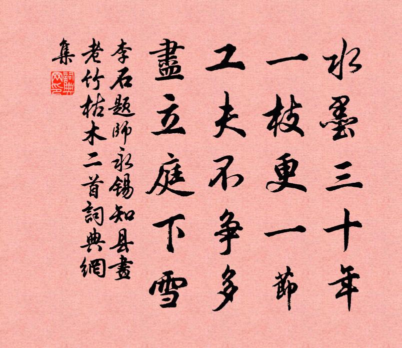 詩詞名句歷史字典書法欣賞書法字典國語詞典說文解字康熙字典古漢語字典標 題 作 者 詩 句 題師永錫知縣畫老竹枯木二首作者:李石 朝代:宋代原文水墨三十年,一枝更一節。工夫不爭多,盡立庭下雪。詩詞問答問:《題師永錫知縣畫老竹枯木二首》的作者是誰?答:李石問:該詩寫於哪個朝代?答:宋代書法欣賞題師永錫知縣畫老竹枯木二首書法作品詩詞推薦偈頌一百六十首釋宗杲〔宋代〕國清才子貴,家富小兒嬌。大家出只手,彼此不相饒。志峽船具詩。百丈王周〔唐代〕少嘗侍先君,餘閒誦白氏。始得入峽詩,深味作詩旨。雲有萬仞山,雲有千丈水。自念坎壈時,尤多兢慎理。山束松修睦〔唐代〕細韻颼颼入骨涼,影兼巢鶴過高牆。盤根一種依平地,自是梧桐不久長。依韻奉和來篇李至〔宋代〕紅塵赤日欲相燃,賴向蓬丘少事牽。明月動搖紈扇室,亂雲重疊火□天。幽屏看雪思寒景,小簟橫風戀晝眠。安得漁父蘇泂〔宋代〕漁翁年幾雪垂肩,釣罷歸來月一船。明日酒醒尋伴侶,賣魚依舊禹祠前。偶題項安世〔宋代〕暗水斜穿橘塢涼,回波直下藕塘香。似牙如背牡羊岸,已疊又灣青草傍。閘里放船思槜李,石間行酒認天章。一時平塘三首次子輝韻陶夢桂〔宋代〕平築三塘共一園,箇中宜著老癯仙。隨緣妝點非難事,粗果閒花不值錢。雜劇·風雨像生貨郎旦佚名〔元代〕第一折(外旦扮張玉娥上,雲)妾身長安京兆府人氏,喚做張玉娥,是個上廳行首。如今我這在城有個員外李彥和西湖竹閣寺姜竹野〔宋代〕來此琅玕影里吟,更於何處覓山林。千年清事無人管,獨有香山領此心。八月十五夜月二首曾幾〔宋代〕雲日晶熒固自佳,幽人有待至昏鴉。遠分岩際松楓樹,復亂洲前蘆荻花。曳履商聲憐此老,倚樓長笛問誰家。霜螯李參政約至井監偶得三絕魏了翁〔宋代〕不乘轞轞上公車,軋軋肩輿兩僕夫。世道險夷隨所遇,車中只是舊時吾。林為之送筆戲贈黃庭堅〔宋代〕閻生作三副,規摹宣城葛。外貌雖銑澤,毫心或麤糲。功將希栗尾,拙乃成棗核。李慶縛散卓,含墨能不泄。病在京兆府初赴同天節宴詩二首強至〔宋代〕四月薰風轉,三天瑞景舒。歌從歸啟後,壽起祝堯初。詩喜南山對,身甘北闕疏。九韶音未作,朝野自歡如。句李郁〔唐代〕身死為修劉稹表,名高因讓陸洿書。【雙調】喬牌兒關漢卿〔元代〕世情推物理,人生貴適意。想人間造物搬興廢,吉藏凶,凶暗吉。【夜行船】富貴那能長富貴,日盈昃月滿虧蝕。送彬座主赴龍安請講齊己〔唐代〕兩論久研精,龍安受請行。春城雨雪霽,古寺殿堂明。白髮老僧聽,金毛師子聲。同流有誰共,別著國風清。冬日放言二十一首張耒〔宋代〕日暮歸飲酒,兒女戲我前。須臾徑三酌,據榻已欣然。老妻坐我傍,餚胾已炮煎。大勝劉伶婦,區區為酒錢。和張文潛有所嘆韻虞儔〔宋代〕老驥困鹽車,四足若有絆。鶯鳩搶榆枋,控地不能遠。我本田家子,釋耒事遊宦。少壯恥乾請,老大誰推挽。撫字念奴嬌·賦雨岩辛棄疾〔宋代〕近來何處有吾愁,何處還知吾樂。一點淒涼千古意,獨倚西風寥郭。並竹尋泉,和雲種樹,喚做真閒客,此心閒處春園醉醒閒臥小齋楊發〔唐代〕酣醉送餘春,醒來恨更頻。花殘蜂蠹物,葉暗鳥欺人。簾閉高眠貴,齋空浩氣新。從今北窗蝶,長是夢中身。名句推薦佳人應怪我,別後寡信輕諾。柳永《尾犯·夜雨滴空階》 知足不辱,知止不殆,可以長久。老子《老子·德經·第四十四章》 彌傷孤舟夜,遠結萬里心。權德輿《月夜江行 / 旅次江亭》 漁舟逐水愛山春,兩岸桃花夾古津。王維《桃源行》 存亡在虛實,不在於眾寡。韓非及後人《韓非子·安危》 胭脂洗出秋階影,冰雪招來露砌魂。曹雪芹《薛寶釵詠白海棠》 千淘萬漉雖辛苦,吹盡狂沙始到金。劉禹錫《浪淘沙九首》 明月如霜,好風如水,清景無限。蘇軾《永遇樂·彭城夜宿燕子樓》 寒鴉飛數點,流水繞孤村。楊廣《失題》 剛待不思量,吹一片、簫聲過牆。項鴻祚《太常引·客中聞歌》