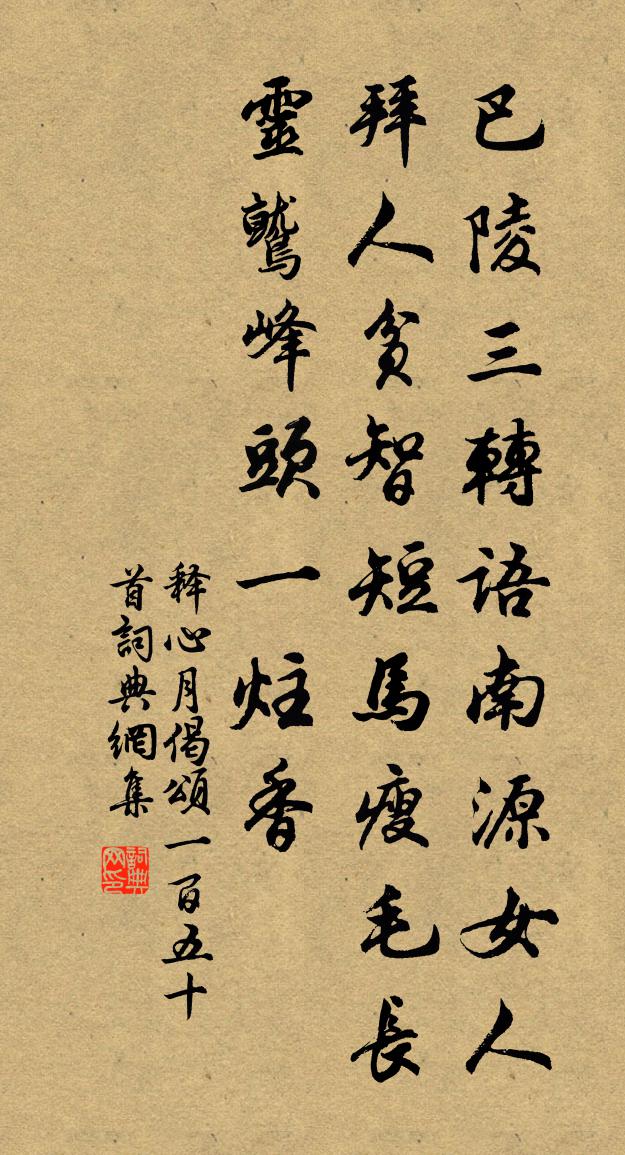 詩詞名句歷史字典書法欣賞書法字典國語詞典說文解字康熙字典古漢語字典標 題 作 者 詩 句 偈頌一百五十首作者:釋心月 朝代:宋代偈頌一百五十首原文巴陵三轉語,南源女人拜。人貧智短,馬瘦毛長,靈鷲峰頭一炷香。詩詞問答問:偈頌一百五十首的作者是誰?答:釋心月問:偈頌一百五十首寫於哪個朝代?答:宋代釋心月偈頌一百五十首書法欣賞偈頌一百五十首書法作品詩詞推薦菩薩蠻佚名〔宋代〕寶刀迎面搖寒雪。瓊梳掠鬢橫新月。紅頰駐長春。綠鬟輕綰雲。解飄並括斂。到處題名遍。飛詔待追還。榮居供奉書憤五首·其一陸游〔宋代〕早歲那知世事艱,中原北望氣如山。樓船夜雪瓜州渡,鐵馬秋風大散關。塞上長城空自許,鏡中衰鬢已先斑。出師代妻答詩(一作女郎葛鴉兒作)河北士人〔唐代〕蓬鬢荊釵世所稀,布裙猶是嫁時衣。胡麻好種無人種,正是歸時不見歸。次韻酬宋伯潛三首廖行之〔宋代〕詩壇得雋敵無強,獨立南豐一瓣香。我欲句中聞妙法,君應肘後出神方。陶鎔景色春長好,流轉風光物自忙。珍重桂州北望秦驛,手開竹徑至釣磯,留待徐容州柳宗元〔唐代〕幽徑為誰開,美人城北來。王程倘餘暇,一上子陵台。別侍御嚴凝沈佺期〔唐代〕七澤雲夢林,三湘洞庭水。自古傳剽俗,有時逋惡子。令君出使車,行邁方靡靡。靜言芟枳棘,慎勿傷蘭芷。讀後漢逸人傳二首張謂〔唐代〕子陵沒已久,讀史思其賢。誰謂潁陽人,千秋如比肩。嘗聞漢皇帝,曾是曠周旋。名位苟無心,對君猶可眠。東過送宋常丞知閬州魏了翁〔宋代〕十年痼丘壑,厭食青山薇。不作時世妝,短褐懷明璣。出門歌一曲,聽者魂為飛。方騎將軍馬,旋闖師氏闈。清名故相國燕國公於司空輓歌二首劉禹錫〔唐代〕雕弓封舊國,黑弰繼前功。十年鎮南雍,九命作司空。池台樂事盡,簫鼓葬儀雄。一代英豪氣,曉散白楊風。陰山和楊秀才二首胡寅〔宋代〕林下何所樂,放懷天地中。青山供客眼,明月與君同。靜聽蕉窗雨,閒披芰沼風。未忘蒿目意,時一夢周公。四月清明西湖蔡襄〔宋代〕千頃平湖一遭,空城遊樂自奢豪。畫船爭勝飛江鶻,翠巘都浮載海鰲。芳草堤邊裙帶短,柔桑陌上髻鬟高。樓前盡題時遁澤畫卷十首王柏〔宋代〕虎嘯風生壑,龍藏氣吐雲。草廬勿高臥,天地正絪緼。放鷓鴣陳宓〔宋代〕有生惟萬類,好惡與人參。以彼刳腸苦,為吾悅口甘。蔬餐人所尚,肉食我誠慚。放汝飛翔去,騰雲更宿嵐。雲杜牧〔唐代〕東西那有礙,出處豈虛心。曉入洞庭闊,暮歸巫峽深。渡江隨鳥影,擁樹隔猿吟。莫隱高唐去,枯苗待作霖。沉黎四首李石〔宋代〕古屋雲棲洞,深湖水拍橋。吏閒知學稼,民樂自歌樵。官監頻添牧,蕃商不費招。老夫便午睡,風惡任飄搖。漁村晚照薛嵎〔宋代〕舊遊憶得瀟湘路,今喜煙波似舊時。澤畔怕逢漁父問,桃源已被世人知。數家草市添新戶,一樹寒鴉傍古祠。蘭杜偈八首釋慧遠〔宋代〕好是仲春漸暖,那堪寒食清明。萬疊雲山聳翠,一天風月為鄰。在處華紅柳綠,湖天浪穩風平。山禽枝上語諄諄,【商調】秦樓月張可久〔元代〕尋芳屨,出門便是西湖路。西湖路,旁花行到,舊題詩處。瑞芝峰下楊梅塢,看松未了催歸去。催歸去,吳山雲暗食菜張耒〔宋代〕大雨困淋漓,小雨傷霢霈。哀哉南畝人,日夜塗手足。入倉無一粒,敢望祈報福。余功歸老圃,畦菜青滿目。長官贈密直張諫議王禹偁〔宋代〕先皇憂蜀輟樞臣,獨冒兵戈出劍門。萬里辭家堪下淚,四年歸闕似還魂。弟兄齒序元投分,兒女情親又結婚。且喜名句推薦世情看冷暖,人面逐高低。施耐庵《水滸傳·第三十七回》 陌上深深,依舊年時轍。王國維《蝶戀花·滿地霜華濃似雪》 終日望君君不至,舉頭聞鵲喜。馮延巳《謁金門·風乍起》 遙憐小兒女,未解憶長安。杜甫《月夜》 天有陰陽風雨晦明之氣,人有喜怒哀 樂好惡之情。魏徵《隋書·志·卷二十九》 絕代有佳人,幽居在空谷。杜甫《佳人》 十年一覺揚州夢,贏得青樓薄倖名。杜牧《遣懷》 風蕭蕭兮易水寒,壯士一去兮不復還。佚名《荊軻歌 / 渡易水歌》 此後錦書休寄,畫樓雲雨無憑。晏幾道《清平樂·留人不住》 何當擊凡鳥,毛血灑平蕪。杜甫《畫鷹》