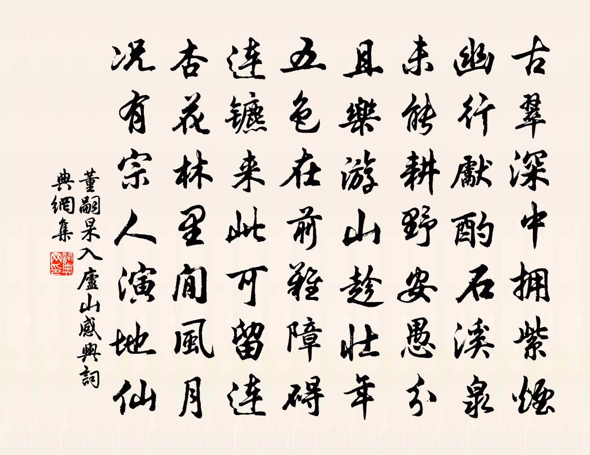 詩詞名句歷史字典書法欣賞書法字典國語詞典說文解字康熙字典古漢語字典標 題 作 者 詩 句 入廬山感興作者:董嗣杲 朝代:宋代入廬山感興原文古翠深中擁紫煙,幽行先酌石溪泉。未能耕野安愚分,且樂游山趁壯年。五色在前難障礙,連鑣來此可留連。杏花林里閒風月,況有宗人演地仙。詩詞問答問:入廬山感興的作者是誰?答:董嗣杲問:入廬山感興寫於哪個朝代?答:宋代董嗣杲入廬山感興書法欣賞入廬山感興書法作品詩詞推薦成都運司西園亭詩水閣許將〔宋代〕飛閣出方池,修竹見空莽。低臨花塢近,平覺春波長。返景澄餘暉,夕陰帶浮爽。從容觀魚樂,不減游濠上。晚步舍東陸游〔宋代〕籬槿花開柿葉丹,土溝東去過牛欄。草煙漠漠天將暮,布褐蕭蕭客正寒。出塞蔣吉〔唐代〕瘦馬羸童行背秦,暮鴉撩亂入殘雲。北風吹起寒營角,直至榆關人盡聞。題淵明愛菊圖吳梅卿〔宋代〕秋菊由來美,願言愛者誰。聞道陶彭澤,嗜彼獨孜孜。嗟嗟兮秋菊,何入淵明思。我今忽解得,不肯告人知。漢武帝雜歌三首韋應物〔唐代〕漢武好神仙,黃金作台與天近。王母摘桃海上還,感之西過聊問訊。欲來不來夜未央,殿前青鳥先迴翔。綠鬢縈雲挽陳東湖趙必象〔宋代〕吾善養吾存,衡茅道更尊。書聲響三世,詩派禪諸孫。今古自秦晉,山林有綺園。臨風涕如雨,一些試招魂。天申節致語口號陸游〔宋代〕廣殿遙聞警蹕音,觚稜曉色尚沈沈。半空瑞靄爐香馥,一點紅雲黼座深。夷夏驩聲歸羽舞,乾坤和氣入薰琴。欲知偈頌一百六十首釋宗杲〔宋代〕觀音妙智力,能救世間苦。百華開爛漫,覷見沒可睹。答求譜朱淑真〔宋代〕雨好解開花百結,風括扶起柳三眠。春醲釅處多傷感,那得心情事管弦。送王伯董入總幕李流謙〔宋代〕昔為萬里別,歸送北征鴻。近接何曾數,深期本自同。遠眸眵霧嶂,短箠滑霜風。更說無窮樂,懷中雙橘紅。蔣志父李曾伯〔宋代〕蔣志父,名不詳。理宗嘉熙間與李曾伯為江東轉運司府同僚,多有唱和。【雙調】風入松_翠樓紅袖倒佚名〔元代〕翠樓紅袖倒金壺,春色滿皇都。夜闌地燒銀燭,那其間多少歡娛。薄利虛名間阻,俏風格以此消疏。 【喬牌踏雲行馬鈺〔元代〕自在閒人,逍遙烈士。清貧快樂忘塵事。風前月下撫心琴,龍吟虎嘯來參侍。或隱山林,或居*市。勸人回首頭頭金線泉曾鞏〔宋代〕玉甃常浮灝氣鮮,金絲不定路南泉。雲依美藻爭成縷,月照寒漪巧上弦。已繞渚花紅灼灼,更索沙竹翠娟娟。無風贈楊尉純甫強至〔宋代〕君家茂族出關西,壯氣長乾萬丈霓。斥鷃羨鵬舒海翼,駑駘觀驥騁霜蹄。詩才多慕謫仙逸,宦緒猶嫌梅福低。千里浣溪沙王哲〔元代〕一個詞兒十二金。修行謹按日時尋。急將猿馬緊牢擒。五戶自然開闡盡,玉花叢里洞門深。舊來那個是知音。古意陳陶〔唐代〕 * 井邊一株杏,花開不如古時紅。西鄰蔡家十歲女,年年二月賣東風。用韻約宋宰諸公為尋梅之行虞儔〔宋代〕澹煙寒雨洗輕埃,千樹江頭探借工。莫倚風流貪畫柳,直須火急去尋梅。可能卯酒三杯罷,索取冰姿一笑回。好手大雪不止再交前蔡戡〔宋代〕玄冥一怒天地黑,巽二前驅聲摵摵。須臾白帝振軒裳,龍鳳幡旂交委積。舊傳洛邑深丈余,今比常山才數尺。天公風流子(行樂)謝懋〔宋代〕少年多行樂,方豪健、何處不嬉遊。記情逐艷波,暖香斜徑,醉搖鞭影,撲絮青樓。難忘是,笑歌偏婉娩,鄉號得名句推薦秦中已久烏頭白,卻是君王未備知。李商隱《人慾》 蠟炬風搖簾不下,竹影半牆如畫。項鴻祚《清平樂·池上納涼》 江頭宮殿鎖千門,細柳新蒲為誰綠?杜甫《哀江頭》 綺席凝塵,香閨掩霧。晏殊《踏莎行·碧海無波》 直道相思了無益,未妨惆悵是清狂。李商隱《無題·重幃深下莫愁堂》 楊花落,燕子橫穿朱閣。李清臣《謁金門·楊花落》 想牧之、千載尚神遊,空山冷。吳潛《滿江紅·齊山繡春台》 非得賢之難,用 之難。非用之難,信之難。房玄齡《晉書·列傳·第二十二章》 識時務者為俊傑,昧先幾者非明哲。程登吉《幼學瓊林·卷三·人事》 臣強則死,念妄則亡。來俊臣《羅織經·事上卷第二》