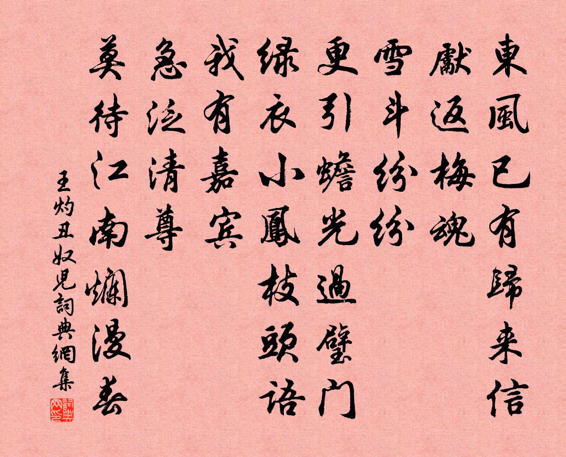 詩詞名句歷史字典書法欣賞書法字典國語詞典說文解字康熙字典古漢語字典標 題 作 者 詩 句 醜奴兒/採桑子作者:王灼 朝代:宋代醜奴兒/採桑子原文東風已有歸來信,先返梅魂。雪斗紛紛。更引蟾光過璧門。綠衣小鳳枝頭語,我有嘉賓。急泛清尊。莫待江南爛漫春。詩詞問答問:醜奴兒/採桑子的作者是誰?答:王灼問:醜奴兒/採桑子寫於哪個朝代?答:宋代問:醜奴兒/採桑子是什麼體裁?答:詞王灼醜奴兒/採桑子書法欣賞醜奴兒/採桑子書法作品詩詞推薦亨方翥〔宋代〕洛邑舟中萬里均,舟車白浪與紅塵。微掀衣角涼生面,不是清風動白苹。題畫廿四首唐寅〔明代〕春驢仙客到詩家,為賞臨溪好杏花。山佃馱柴出換酒,鄰翁陪坐自撈蝦。題唐執中書樓陸游〔宋代〕吾州 * 他州無,閉戶偏讀家藏書。志氣頗聞已山立,神仙固自多樓居。終日坐忘對燕几,有時出遊騎蹇驢。人生至上基祖墳衛宗武〔宋代〕小逕入山村,行行及墓門。豐林俱易種,古木失常尊。重悵松楸地,多為荊棘原。青青一抔土,馬鬣喜猶存。句繆瑜〔宋代〕亭台十二眼雙明,一幅畫圖開水墨。雨腳趙蕃〔宋代〕雨腳才能駐,風頭倏又高。未成曾點服,猶衣仲由袍。斗食塵埃愧,束書燈火勞。丁丁幾樵斧。泛泛一漁舠。建溪新茗梅堯臣〔宋代〕南國溪陰暖,先春發茗芽。采從青竹籠,蒸自白雲家。粟粒烹甌起,龍文御餅加。過茲安得比,顧渚不須夸。句楊蟠〔宋代〕三峽江聲流筆下,六朝山影滿樽前。題郁孤台文天祥〔宋代〕城郭春聲闊,樓台晝影遲。並天浮雪界,蓋海出雲旗。風雨十年夢,江湖湖城思。倚闌時北顧,空翠濕朝曦。湘江怨范成大〔宋代〕苹芷 * 路,蓮舟忘卻歸。夜寒江水黑,風雨夢如飛。雜詩 其七陶淵明〔魏晉〕日月不肯遲,四時相催迫。寒風拂枯條,落葉掩長陌。弱質與運頹,玄鬢早已白。素標插人頭,前途漸就窄。家為送雲岩老住天寧寺陳造〔宋代〕道人兀坐雲岩山,雲岩之雲是知己。風噓岫吸漫不知,道人之心亦如此。從地湧出煥金碧,信手拈來自奇偉。門施醉中聞甘州薛逢〔唐代〕老聽笙歌亦解愁,醉中因遣合甘州。行追赤嶺千山外,坐想黃河一曲流。日暮豈堪征婦怨,路傍能結旅人愁。左綿挽寧谷居士何公三首何夢桂〔宋代〕英雄千古入泉台,八十餘齡死更哀。隱谷雲歸龍已老,吟壇月墮鶴空回。黃花滿地詩人老,青檟成阡弔客來。白髮鷓鴣天佚名〔宋代〕此夕薰風息舜弦。明朝早振蓐收權。鵲饒喜舌喧華屋,燭富祥光耀綺筵。宣玉旨,敕炎官。月宮催誕跨鸞仙。福如小車行邵雍〔宋代〕喜醉豈無千日酒,惜春遠有四時花。小車行處人歡喜,滿洛城中都似家。三月十四夜觀月思南湖張鎡〔宋代〕期會紛然不到詩,拙哉前計只心知。縱當吏散庭空後,爭似山行水泛時。柳影半籠明處路,葦聲輕窣暗邊籬。波神雨晴偶作示禪者釋正覺〔宋代〕快雨快晴寒食近,崢嶸芳事趁佳辰。弄風柳絮疑成雪,滿地榆錢買得春。雷吐英英茶爪露,暖班茁茁蕨拳伸。桃華送謝師直南陽上墳梅堯臣〔宋代〕躍馬清明前,行將拜孤壠。松吹送悲聲,緣纓淚如涌。三歲宰南方,奠斝阻親捧。山下獨徘徊,雨來雲蓊蓊。偈頌一百零一首釋慧性〔宋代〕搖唇鼓舌,展事投機。千拂出世,不通懺悔。焦巴,有葉丫。長天秋水,孤鶩落霞。名句推薦古今多少事,都付笑談中。楊慎《臨江仙·滾滾長江東逝水》 一朵芙蕖,開過尚盈盈。蘇軾《江神子·江景》 瑤草一何碧,春入武陵溪。黃庭堅《水調歌頭·遊覽》 愁因薄暮起,興是清秋發。孟浩然《秋登蘭山寄張五》 居必擇鄉,游必就士。荀子《荀子·勸學》 不知命,無以為君子也;不知禮,無以立也;不知言,無以知人也。孔子弟子《論語·堯曰篇》 紅葉晚蕭蕭,長亭酒一瓢。許渾《秋日赴闕題潼關驛樓 / 行次潼關逢魏扶東歸》 仁也者,人也。合而言之,道也。孟子《孟子·盡心章句下·第十六節》 出塞入塞寒,處處黃蘆草。王昌齡《塞下曲四首》 仁者愛萬物而智者備禍於未形,不仁不智,何以為國?司馬遷《史記·趙世家》