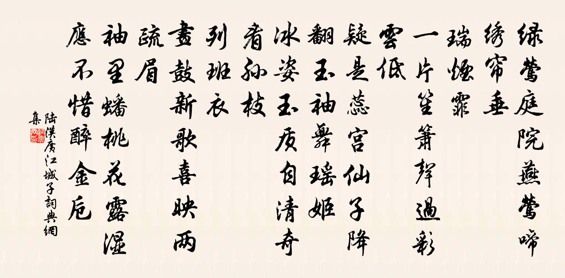 詩詞名句歷史字典書法欣賞書法字典國語詞典說文解字康熙字典古漢語字典標 題 作 者 詩 句 江城子作者:陸漢廣 朝代:宋代江城子原文綠鶯庭院燕鶯啼。繡簾垂。瑞煙霏。一片笙簫,聲過彩雲低。疑是蕊宮仙子降,翻玉袖,舞瑤姬。冰姿玉質自清奇。看孫枝。列班衣。畫鼓新歌,喜映兩疏眉。袖裡蟠桃花露濕,應不惜,醉金卮。詩詞問答問:江城子的作者是誰?答:陸漢廣問:江城子寫於哪個朝代?答:宋代問:江城子是什麼體裁?答:詞陸漢廣江城子書法欣賞江城子書法作品詩詞推薦高南仲自雲間歸退軒蓋明府以四詩送之末章專孫應時〔宋代〕清鏡朝容減,寒燈夜影孤。身曾諳作客,情亦念攜孥。寶劍千金重,晴虹萬丈舒。功名生感慨,有路莫辭迂。臨江仙王以寧〔宋代〕此理循環如引鋸,春來百草菲菲。道人一笑悟前非。功名真長物,夕靄與朝霏。夢褥清孫今綠隱,漫郎自許風期。初入峽有感白居易〔唐代〕上有萬仞山,下有千丈水。蒼蒼兩崖間,闊狹容一葦。瞿唐呀直瀉,灩澦屹中峙。未夜黑岩昏,無風白浪起。大石丁寓田家有贈王維〔唐代〕君心印尚棲隱,印久欲傍歸印路。在朝印每為言,解印果成趣。晨雞鳴鄰里,群動從所務。農夫行餉田,閨妾起縫夏日陸游〔宋代〕齒髮凋零奈爾何!年光暗裡易消磨。街槐正喜清陰密,巷柳還驚蠹葉多。過湖偶題書於鄔子之津趙蕃〔宋代〕洞庭厥大九州間,此地吞瀦未覺慳。一抹遠青為四望,亦云仿佛似君山。題劉君鼎臣盤谷圖史彌寧〔宋代〕岩壁開張半幅慳,權名人見若為顏。那知別有具丘壑,不在區區紙上山。四老堂詩仲並〔宋代〕便勝從來三戟門,良金如友玉如昆。天邊鴻雁空千里,堂上壎箎共一樽。自昔披榛扶社稷,幾人衣錦向邱園。商山江城子 村居沈泓〔明代〕長堤細柳隱虹橋,弄笙簫,伴漁樵。醉倚楓林,仰面掛詩飄。釋卷正逢秋水漲,臨古渡,放輕舠。夕陽西下暗窗綃題琴台韓絳〔宋代〕車騎擁客安在哉,綺琴何事有遺台。當時卒困臨邛辱,異日寧知諭蜀才。園令官閒多病後,茂陵書奏{左亻右多}嘆花杜牧〔唐代〕自恨尋芳到已遲,往年曾見未開時。如今風擺花狼藉,綠葉成陰子滿枝。:狂風落盡深紅色,綠葉成陰子滿枝。東方未明佚名〔先秦〕東方未明,顛倒衣裳。顛之倒之,自公召之。東方未晞,顛倒裳衣。倒之顛之,自公令之。折柳樊圃,狂夫瞿瞿。畫壁鄧深〔宋代〕松柏雙雙夾竹青,來遊仙客稱閒情。一時幻出誰能爾,四者依然太瘦生。鬱郁相交堪掬翠,昂昂自得若聞聲。如何偈頌七十二首釋祖欽〔宋代〕殺活縱橫得自由,懸崖撒手覓冤讎。瞎驢滅卻 * 眼,射斗寒光夜不收。偈頌二百零五首釋正覺〔宋代〕阿那是祖,位崇家譜。二仆之根,萬象之母。建化門未要轉機,實際地如何進步。青山一線路相通,月落寒猿啼斷黃嬰兒侯善淵〔元代〕呆老呆老。幻夢惑迷,一生顛倒。甚每日皺著眉兒,把身心作惱。勸汝回頭歸大道。搜玄微幽奧。煉丹光混入中元感春二首張耒〔宋代〕為問閒茅客,窮愁何所歡。焚香延晝睡,酤酒過春寒。歲月顛毛換,古今行路難。浮生付造物,留滯復何嘆。尤美軒汪應辰〔宋代〕巉然絕壑臨招擔,爺視疑欲乾晴霓。林戀獻狀還左右,煙雲變相隨高低。少日登高不憚遠,喘汗赬顏如夏畦。卻憑霜晴陸游〔宋代〕萬瓦新霜白,一窗朝日晴。破裘身亦暖,細字眼猶明。耄喜譫諄語,衰常踸踔行。登封書不草,力穡報時平。日本覺心禪人遠來炷香請益注詩迅筆贈之釋慧開〔宋代〕心即是佛即是心,心佛元同亘古今。覺悟古今心是佛,不須向外別追尋。名句推薦門前行樂客,白馬嘶春色。牛嶠《菩薩蠻·風簾燕舞鶯啼柳》 春風知別苦,不遣柳條青。李白《勞勞亭》 人而無信,不知其可也。孔子弟子《論語·為政篇》 君子不畏虎,獨畏讒夫之口。王充《論衡·卷二十三·言毒篇》 日暖桑麻光似潑,風來蒿艾氣如薰。蘇軾《浣溪沙·軟草平莎過雨新》 既熟慣,則更覺親密;既親密,則不免一時有求全之毀,不虞之隙。曹雪芹《紅樓夢·第五回》 但見淚痕濕,不知心恨誰。李白《怨情》 萬里平湖秋色冷,星辰垂影參然。牛希濟《臨江仙·洞庭波浪颭晴天》 春山煙欲收,天淡星稀小牛希濟《生查子·春山煙欲收》 形勝三分國,波流萬世功。潘大臨《江間作四首·其三》