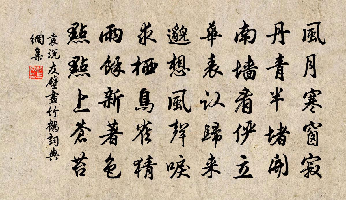 詩詞名句歷史字典書法欣賞書法字典國語詞典說文解字康熙字典古漢語字典標 題 作 者 詩 句 壁畫竹鶴作者:袁說友 朝代:宋代壁畫竹鶴原文風月寒窗寂,丹青半堵開。南牆看儼立,華表認歸來。邈想風聲唳,求棲鳥雀猜。雨余新著色,點點上蒼苔。詩詞問答問:壁畫竹鶴的作者是誰?答:袁說友問:壁畫竹鶴寫於哪個朝代?答:宋代袁說友壁畫竹鶴書法欣賞壁畫竹鶴書法作品詩詞推薦送楊皞東歸盧綸〔唐代〕登樓掩泣話歸期,楚樹荊雲發遠思。日裡揚帆聞戍鼓,舟中酹酒見山祠。西江風浪何時盡,北客音書欲寄誰。若說題舅氏耕隱圖廖行之〔宋代〕詩書事業可公卿,垂上青冥卻反耕。舍己芸人吾弗爾,種田得飽我何營。一犁春雨寧論力,萬里秋雲會享成。堂上減字木蘭花歐陽修〔宋代〕歌檀斂袂。繚繞雕梁塵暗起。柔潤清圓。百琲明珠一線穿。櫻唇玉齒。天上仙音心下事。留往行雲。滿坐 * 酒半霜夜陸游〔宋代〕土床紙帳臥幽寂,枕上細聽城上更。榾柮燒殘地爐冷,喔咿聲斷天窗明。風霜欲透草茨屋,鹽酪不下薺糝羹。猶恨奉和中書常舍人晚秋集賢院即事寄贈徐薛二侍御獨孤及〔唐代〕漢家金馬署,帝座紫微郎。圖籍凌群玉,歌詩冠柏梁。陰陰萬年樹,肅肅五經堂。揮翰忘朝食,研精待夕陽。晴空丹陽苦寒再賦方回〔宋代〕凍雪猶凝滯,陰風欲怒號。樹梢棲鳥墮,船底積冰膠。孰匪焦先室,誰能范叔袍。竟無沾醉策,足與苦寒鏖。挽司直兄王柏〔宋代〕典重班諸老,聲名始璧流。開尊口佳士,襆被闖前修。月冷金閨籍,塵生玉杖鳩。梅岩傷目處,雁影正賓秋。王氏園置燭觀梅李復〔宋代〕堂前梅樹花初遍,露坐看花對夕風。苦恨夜收春色去,故移燈入素光中。亂爭短髮愁邊白,清映衰顏酒後紅。醉眼贈送崔子向嚴維〔唐代〕旅食來江上,求名赴洛陽。新詩蹤謝守,內學似支郎。行怯秦為客,心依越是鄉。何人作知己,送爾淚浪浪。殘絲曲李賀〔唐代〕垂楊葉老鶯哺兒,殘絲欲斷黃蜂歸。綠鬢年少金釵客,縹粉壺中沈琥珀。花台欲暮春辭去,落花起作迴風舞。榆莢聞歌二絕葛立方〔宋代〕初唱城堙雁影寒,玉喉窈窱嚲雲簪。小叢底處傳歌樣,供奉梨園人姓南。謝江東漕楊廷秀秘監送江東集並索近詩二首范成大〔宋代〕遠道悠悠日暮雲,愁眉今日為君軒。殘燈獨照江東集,短夢相尋白下門。即事想多梅蕊句,有誰堪共桂花樽。斯文幽居春晚陸游〔宋代〕老廢讎書病廢詩,晝閒惟與睡相宜。未尋內史流觴地,又近龐公上冢時。花發游蜂喧院落,筍長馴鹿入藩籬。石帆偈頌一百四十一首釋師範〔宋代〕春色依依,花木芳菲。滿眼滿耳,絕毫絕厘。惟有子規知我意,一聲聲道不如歸。甲子初冬宿直玉堂淒風小雨次日即承先帝晏駕馬廷鸞〔宋代〕無限都人哭鼎龍,年多澤久似仁宗。愁來一樣黃昏雨,天上人間自不同。酬楊司業十二兄早秋述情見寄元稹〔唐代〕白髮故人少,相逢意彌遠。往事共銷沉,前期各衰晚。昨來遇彌苦,已復雲離巘。秋草古膠庠,寒沙廢宮苑。知心偈頌四十一首釋普寧〔宋代〕出現在楊州,留錫於此地。寶塔凌高空,聲光動萬里。利物應群機,如月分眾水。我來爇瓣香,一瞻一頂禮。從教玉照堂觀梅二十首張鎡〔宋代〕映竹依松望最宜,如無似有乍開時。思量切比幽人語,不著工夫格自奇。中春宴遊劉兼〔唐代〕二月風光似洞天,紅英翠萼簇芳筵。楚王雲雨迷巫峽,江令文章媚蜀箋。歌黛入顰春袖斂,舞衣新繡曉霞鮮。酒闌裴侍御見贈斑竹杖李嘉祐〔唐代〕騷人夸竹杖,贈我意何深。萬點湘妃淚,三年賈誼心。願持終白首,誰道貴黃金。他日歸愚谷,偏宜綠綺琴。名句推薦幾多情,無處說,落花飛絮清明節。魏承班《漁歌子·柳如眉》 一枝紅艷露凝香,雲雨巫山枉斷腸。李白《清平調·其二》 佳人相對泣,淚下羅衣濕。李師中《菩薩蠻·子規啼破城樓月》 向河梁、回頭萬里,故人長絕。辛棄疾《賀新郎·別茂嘉十二弟》 不是誠齋無月,隔一林修竹。楊萬里《好事近·七月十三日夜登萬花川谷望月作》 禍褔無不自己求之者。孟子《孟子·公孫丑章句上·第四節》 窈窕淑女,君子好逑。佚名《關雎》 一言足以召大禍,故古人守口如瓶,惟恐其覆墜也王永彬《圍爐夜話·第四八則》 夜吟敲落霜紅,船傍楓橋系。吳文英《荔枝香近·送人游南徐》 烹羊宰牛且為樂,會須一飲三百杯。李白《將進酒》