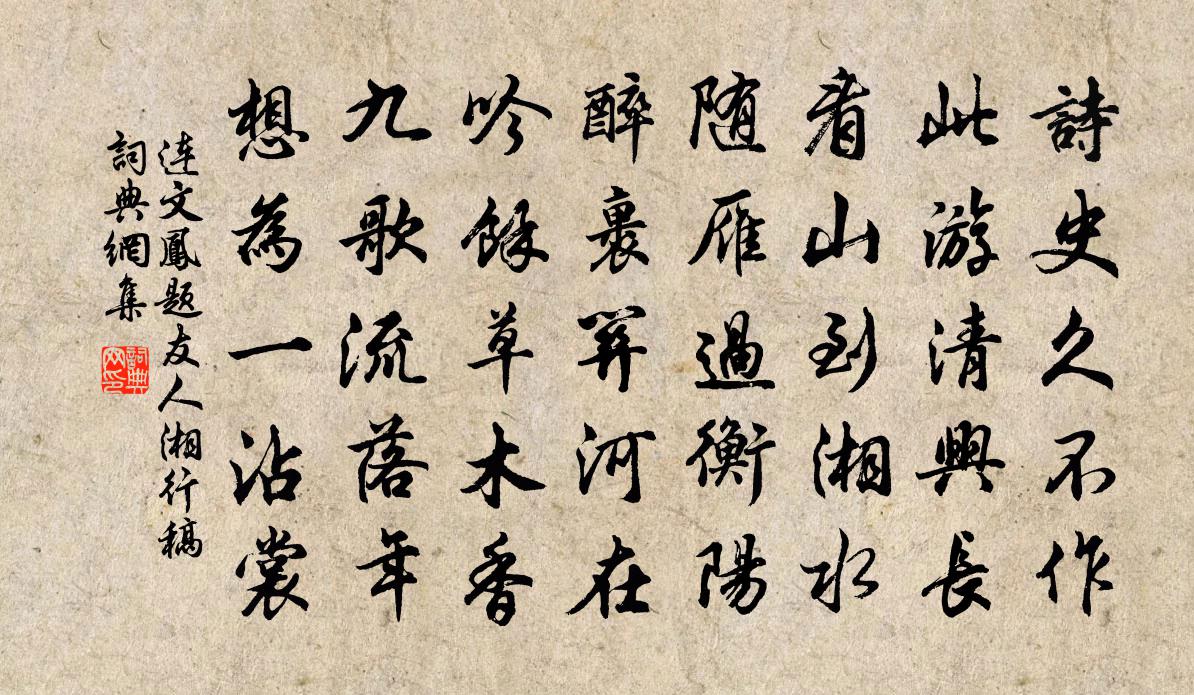 詩詞名句歷史字典書法欣賞書法字典國語詞典說文解字康熙字典古漢語字典標 題 作 者 詩 句 題友人湘行稿作者:連文鳳 朝代:宋代題友人湘行稿原文詩史久不作,此游清興長。看山到湘水,隨雁過衡陽。醉裹關河在,吟余草木香。九歌流落年,想為一沾裳。詩詞問答問:題友人湘行稿的作者是誰?答:連文鳳問:題友人湘行稿寫於哪個朝代?答:宋代連文鳳題友人湘行稿書法欣賞題友人湘行稿書法作品詩詞推薦獻盧常侍曹生〔唐代〕拜玉亭前閒送客,此時孤恨感離鄉。尋思往歲絕纓事,肯向朱門泣夜長。鄒子引古語佚名〔先秦〕截趾適屨。孰雲其愚。何與斯人。追欲喪軀。漢宮春周紫芝〔宋代〕香滿箱奩,看沈犀弄水,濃麝含薰。荀郎一時舊事,盡屬王孫。殘膏剩馥,須傾囊、乞與蘭蓀。金獸暖,雲窗霧閣陶種柑橙,令山童買之貫休〔唐代〕高步南山南,高歌北山北。數載買柑橙,山資近又足。聽琴黃庚〔宋代〕一曲猗蘭按玉徽,高山流水少知。紛紛耳聽非心聽,安得人間有子期。次韻張守秋懷四首劉子翬〔宋代〕失計縈塵網,棲棲厭不情。興隨鳧舄遠,官比綺曹清。大案韋編古,深房紙瓦明。聖賢聊晤對,事業只平平。商山旅中作邵雍〔宋代〕殘火香燈夜正沉,默思前事擁寒衾。霜天皎月雖千里,不抵傷時一寸心。依韻和吳七丈詠雪二首強至〔宋代〕江邊玉樹渾無地,世上銀河自有橋。宿凍即交山口路,冷波應減海門潮。當年右席辭空在,今日扁舟興轉遙。寬褐又次韻司空彥修送行李若水〔宋代〕僕夫已飯車已巾,再拜別君愁始新。一事未成雙鬢禿,百年能幾半生貧。雲山不斷駸駸暮,花柳無邊在在春。它日詠史下曹爽陳普〔宋代〕四聰八達免官時,仲達含香拜玉墀。二鬼不來同壑谷,未愁寡婦與孤兒。寒食前一日西湖閒泛三首張鎡〔宋代〕衰鬢爭如竹際苔,鞦韆猶記玉驄回。短籬數尺花成簇,一日春悰不往來。元日觀郭將軍早朝靈澈〔唐代〕欲曙九衢人更多,千條香燭照星河。今朝始見金吾貴,車馬縱橫避玉珂。賀樂丈先生南郭新居范成大〔宋代〕新堂燕雀喜,竹籬掛藤蘿。崩奔風濤里,得此巢龜荷。西山效爽氣,南浦供清波。會心不在遠,容膝何須多。先生過江游靈泉寺李新〔宋代〕徐卿才力已無雙,幾日飛書約渡江。岸石有紋欺錦繡,野蘆無數認旌幢。酒投渤澥難招偶,詩築長城欲受降。玉塵句陳堯佐〔宋代〕部吏百函通爵里,從兵千騎屬鞦韆右健}櫜。和楊公維二首廖行之〔宋代〕子云家無儋石儲,日有載酒過門閭。道豐澤衍今甫大,天理報施寧欺予。我慚投李得珍貺,俗眼快翫真璠璵。何當雨夜贈元十八白居易〔唐代〕卑濕沙頭宅,連陰雨夜天。共聽檐溜滴,心事兩悠然。把酒循環飲,移床曲尺眠。莫言非故舊,相識已三年。別秀亭五首方回〔宋代〕秀亭亭上果何似,兩水萬山圖畫開。霜入川原疏草木,煙銷城市出樓台。半空鷺點客悉破,何許笛吹詩句來。異日禪人寫師真請贊釋慧遠〔宋代〕大道廓然,真空泯跡。金裹淘砂,玉中辨石。衲僧用處脫羅籠,熨斗煎茶銚不同。一聲師子吼,遍界絕狐蹤。琴二首王令〔宋代〕不獨區區操縵間,要期追逐古風還。吾民有慍何當解,學得南風不敢彈。名句推薦不成拋擲,夢裡終相覓。王國維《點絳唇·屏卻相思》 醉里秋波,夢中朝雨,都是醒時煩惱。時彥《青門飲·寄寵人》 年年春日異鄉悲,杜曲黃鶯可得知。韋莊《江外思鄉》 嘆息此人去,蕭條徐泗空李白《經下邳圯橋懷張子房》 佇立傷神。無奈輕寒著摸人。朱淑真《減字木蘭花·春怨》 嘆年光過盡,功名未立,書生老去,機會方來。劉克莊《沁園春·夢孚若》 見善而怠,時至而疑,知非而處,此三者,道之所止也。姜子牙《六韜·文韜·明傳》 花落家童未掃,鶯啼山客猶眠。王維《田園樂七首·其六》 餘霞散成綺,澄江靜如練。謝朓《晚登三山還望京邑》 怨別自驚千里外,論交卻憶十年時。高適《東平別前衛縣李寀少府 / 送前衛縣李宷少府》