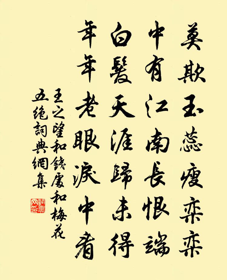詩詞名句歷史字典書法欣賞書法字典國語詞典說文解字康熙字典古漢語字典標 題 作 者 詩 句 和錢處和梅花五絕作者:王之望 朝代:宋代和錢處和梅花五絕原文莫欺玉蕊瘦欒欒,中有江南長恨端。白髮天涯歸未得,年年老眼淚中看。詩詞問答問:和錢處和梅花五絕的作者是誰?答:王之望問:和錢處和梅花五絕寫於哪個朝代?答:宋代王之望和錢處和梅花五絕書法欣賞和錢處和梅花五絕書法作品詩詞推薦商山道中張喬〔唐代〕春去計秋期,長安在夢思。多逢山好處,少值客行時。雲起爭峰勢,花交隱澗枝。停驂一惆悵,應只嶺猿知。送呂夏卿歐陽修〔宋代〕始吾尚幼學弄筆,群兒爭誦公初文。嗟我今年已白髮,公初相見猶埃塵。傳家尚喜有二子,始知靈珠出淮濱。去年方響歌李沇〔唐代〕敲金扣石聲相凌,遙空冷靜天正澄。寶瓶下井轆轤急,小娃弄索傷清冰。穿絲透管音未歇,迴風繞指驚泉咽。季倫出自薊門行汪元量〔宋代〕出自薊門行,行行望天北。何處愁 * ,黑風走沙石。華裾者誰子,意氣萬人敵。金鞍鞁白馬,馬奮飛虎生翼。書青氈帳二十韻白居易〔唐代〕合聚千羊毳,施張百子弮。[司馬遷書云:張空弮。]骨盤邊柳健,色染塞藍鮮。北制因戎創,南移逐虜遷。汰風至道宮葉林〔宋代〕猶存巨鑊記熙豐,翠藹春深古路通。千百舂鋤一株樹,野田飛下雪花風。次韻范參政書懷陸游〔宋代〕春寒還似暮冬天,敗絮重披有虱緣。雖欠高僧分白,偶蒙暴客恕青氈。濁醪盎盎貧猶醉,倦枕昏昏晝亦眠。年少從水龍吟(淮西重午)盧祖皋〔宋代〕會昌湖上扁舟,幾年不醉西山路。流光又是,宮衣初試,安榴半吐。千里江山,滿川菸草,薰風淮楚。念離騷恨遠招山乃詩人劉叔擬故居朱清之得其地清之赴南戴復古〔宋代〕有錢可買滄浪景,無術能還夢幻身。一段江山寄愁絕,百年不見兩詩人。晝臥口占三首張耒〔宋代〕康濟朝飢進湯餅,誰何午睡屬新茶。讀書隱几聊復爾,謝客扃門豈不佳。閒中書適陸游〔宋代〕棋廢機心息,書捐美睡多。客來時淡話,酒後亦高歌。甚欲江湖去,無如老病何!平羌半輪月,依舊照漁蓑。過疏山題一覽亭梁溪公所書也二首胡寅〔宋代〕林梢斜月墮金盆,接影蒼茫日霧翻。欲倚小欄收遁景,試憑長嘯卷遐昏。寒山濯濯空堆皺,野水瀰瀰不待源。莫道使光亭陶弼〔宋代〕亭上三峰臂五湖,皇華人到此躇躕。鄉民看取黃龍節,郡吏聽宣赤鳳書。南下威如霜落後,撫邊恩似雨來初。離筵地黃蘇軾〔宋代〕地黃餉老馬,可使光監人。吾聞樂天語,喻馬施之身。我衰正伏櫪,垂耳氣不振。移栽附沃壤,蕃茂爭新春。沉水偈傾一百六十九首釋智朋〔宋代〕不知月之大小,不管歲之餘閏。黑牛臥死水,癩馬系枯椿。三年一閏,五年載閏。衲僧須經得與么時節過,方可成欲銷雲盧殷〔唐代〕欲隱從龍質,仍余觸石文。霏微依碧落,仿佛誤非雲。度月光無隔,傾河影不分。如逢作霖處,當為起氤氳。赴元老劉園之集呈十二朝請十五推官二叔父兼晁補之〔宋代〕故鄉等作異鄉愁,常笑吾生不自謀。百日狂風春草草,十年歸夢客悠悠。倦遊情話陪諸父,老罷親鋤學故侯。得坎送杜少府赴華陰趙湘〔唐代〕行路華山前,之官發黑年。移家擬拔宅,作尉已呼仙。近縣雲隨鶴,當門樹著蟬。吟詩因夜坐,毛女落秋天。雜詩葛天民〔宋代〕下竺山前打一遭,丁寧門子看溪橋。恐驚繞磵梅花落,莫遣行人語笑高。登五龍尖晚歸鼓琴趙友直〔宋代〕絕巘凌風駕白雲,登臨興後鼓南薰。朱弦一到無心處,自覺人間無可聞。名句推薦除腹心之疾,而置諸股肱,何益?左丘明《左傳·哀公·哀公六年》 離恨做成春夜雨。添得春江,劃地東流去楊炎正《蝶戀花·別范南伯》 第四橋邊,擬共天隨住。姜夔《點絳唇·丁未冬過吳松作》 竹憐新雨後,山愛夕陽時。錢起《谷口書齋寄楊補闕》 晨興理荒穢,帶月荷鋤歸。陶淵明《歸園田居·其三》 繞遍迴廊還獨坐。月籠雲暗重門鎖。蘇軾《蝶戀花·雨霰疏疏經潑火》 犬吠水聲中,桃花帶露濃。李白《訪戴天山道士不遇》 滿眼韶華,東風慣是吹紅去。幾番煙霧,只有花難護。陳子龍《點絳唇·春日風雨有感》 狗馬飾雕文,土木被緹繡。范曄《後漢書·列傳·宦者列傳》 浩蕩離愁白日斜,吟鞭東指即天涯。龔自珍《己亥雜詩·其五》