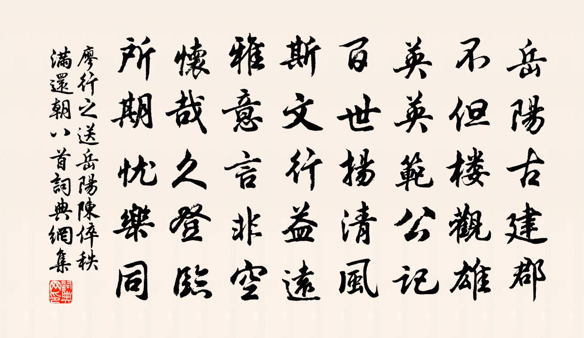 詩詞名句歷史字典書法欣賞書法字典國語詞典說文解字康熙字典古漢語字典標 題 作 者 詩 句 送岳陽陳倅秩滿還朝八首作者:廖行之 朝代:宋代送岳陽陳倅秩滿還朝八首原文岳陽古建郡,不但樓觀雄。英英范公記,百世揚清風。斯文行益遠,雅意言非空。懷哉久登臨,所期憂樂同。詩詞問答問:送岳陽陳倅秩滿還朝八首的作者是誰?答:廖行之問:送岳陽陳倅秩滿還朝八首寫於哪個朝代?答:宋代廖行之送岳陽陳倅秩滿還朝八首書法欣賞送岳陽陳倅秩滿還朝八首書法作品詩詞推薦拜明招二先生墓有感王柏〔宋代〕束髮家庭識所宗,平生心在瓣香中。白頭始下券台拜,的的精誠自感通。叱馭橋李石〔宋代〕鸞鳳飛緣壁,虹蜺下飲溪。一家蠻瘴里,九折夕陽西。望江南/憶江南陳朴〔宋代〕內外遍,八轉始還元。地帶長垂生坎戶,周行胎息貫天門。太始道方存。純一體,黑赤氣常噴。丹火發來燒內境,有客致木綿椅坐為山齋之用鄭剛中〔宋代〕桃歇冬花蕉葉乾,寒到廣東真是寒。山齋竹椅冷如水,欲以薦坐無 * 。鄰翁未必藉華罽,顧此流落心所憐。臨溪上元趙葵〔宋代〕翡翠簾開舞袖輕,寒星萬點下蓬瀛。清尊對月酌不已,也向蓬窗坐到明。金水河春興 其二王冕〔元代〕金水河邊柳色新,玉山館外少沙塵。琵琶未必能愁客,鸚鵡如何錯喚人?翠袖錦襜馱白馬,落花飛絮斗朱輪。人間與山巨源絕交書嵇康〔魏晉〕康白:足下昔稱吾於潁川,吾常謂之知言。然經怪此意尚未熟悉於足下,何從便得之也?前年從河東還,顯宗、阿門外劉克莊〔宋代〕平生孤立懶隨群,未愛標名附五君。投老病身甘碓□,無窮世事等輪雲。牛衣尚許尋初服,蠶室何堪續舊聞。玉座金山寺與柳子玉飲大醉臥寶覺禪榻夜分方醒書蘇軾〔宋代〕惡酒如惡人,相攻劇刀箭。頹然一榻上,勝之以不戰。詩翁氣雄拔,禪老語清軟。我醉都不知,但覺紅綠眩。醒時滿江紅(中秋)辛棄疾〔宋代〕美景良辰,算只是、可人風月。況素節揚輝,長是十分清徹。著意登樓瞻玉兔,何人張幕遮銀闕。倩飛簾、得得為葉少蘊生朝三首張元乾〔宋代〕元戎玉帳凜霜威,談笑何妨羽扇揮。平日丹心馳象闕,長年彩服奉慈闈。誰無五馬人生貴,獨有三奇命世稀。志在答葛公綽蔡襄〔宋代〕山堂爭似草堂清,俗事隨人百種名。賴有四窗春茗在,甌中時看白雲生。雜曲歌辭。伊川歌第二佚名〔唐代〕彤闈曉辟萬鞍回,玉輅春遊薄晚開。渭北清光搖草樹,州南嘉景入樓台。郊居歲暮因書所懷權德輿〔唐代〕養拙方去喧,深居絕人事。返耕忘帝力,樂道疏代累。翛然衡茅下,便有江海意。寧知肉食尊,自覺儒衣貴。煙霜素梅 三五王冕〔元代〕千年萬年老梅樹,三花五花無限春。不比尋常桃樹李,只將顏色媚時人。鶴會三首劉克莊〔宋代〕投不貲軀火宅中,須臾鬢雪換顏紅。暮年頗欲從翁去,共過蓬萊聽水鳳。詠史孫應時〔宋代〕絳帳何人拜馬融,已應羞面見兒童。早知自照頭顱醜。枉用文章殺李公。贊三十六祖頌釋印肅〔宋代〕婆修盤頭尊,曾禮大光明。以杖畫佛面,悔達復天真。曉發齊州道中二首歐陽修〔宋代〕東州幾日倦征軒,千騎驂驔白草原。鴈入寒雲驚曉角,雞鳴蒼海浴朝暾。國恩未報身先老,客思無憀歲已昏。誰得如意令/如夢令佚名〔宋代〕炎暑尚餘八日。火老金柔時節。聞道間生賢,儲秀降神崧極。無敵。無敵。當代人倫準的。射策當為第一。高躍龍名句推薦過橋分野色,移石動雲根。賈島《題李凝幽居》 道人庭宇靜,苔色連深竹。柳宗元《晨詣超師院讀禪經》 不求金玉重重貴,但願兒孫個個賢。佚名《增廣賢文·上集》 女為君子儒,無為小人儒。孔子弟子《論語·雍也篇》 臨行挽衫袖,更嘗折殘菊。蘇軾《送頓起》 窗含西嶺千秋雪,門泊東吳萬里船。杜甫《絕句》 窗白一聲雞,枕函聞馬嘶。顧貞觀《菩薩蠻·山城夜半催金柝》 故國神遊,多情應笑我,早生華髮。蘇軾《念奴嬌·赤壁懷古》 綠波春浪滿前陂,極目連雲稏肥。韋莊《稻田》 以德就列,以官服事,以勞殿賞,量功而分祿。墨子《墨子·08章 尚賢(上)》