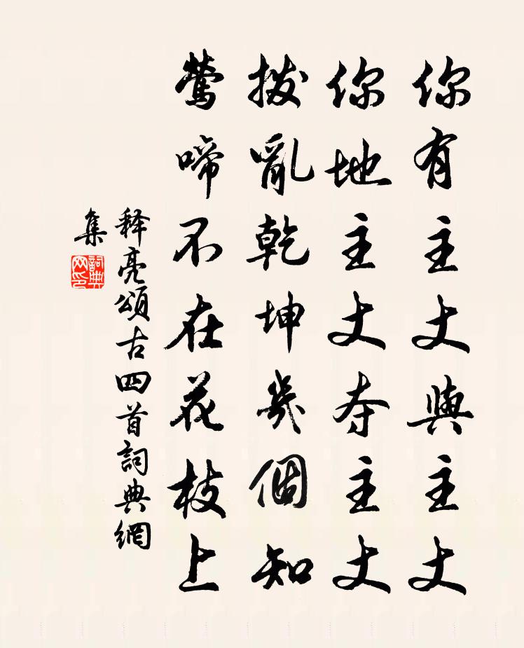 詩詞名句歷史字典書法欣賞書法字典國語詞典說文解字康熙字典古漢語字典標 題 作 者 詩 句 頌古四首作者:釋亮 朝代:宋代頌古四首原文你有主丈與主丈,你地主丈奪主丈。撥亂乾坤幾個知,鶯啼不在花枝上。詩詞問答問:頌古四首的作者是誰?答:釋亮問:頌古四首寫於哪個朝代?答:宋代釋亮頌古四首書法欣賞頌古四首書法作品詩詞推薦好女兒仇遠〔宋代〕恨結眉峰。兩抹青濃。不忺人、昨夜曾中酒,甚小蠻綠困,太真紅醉,肯嫁東風。無奈遊絲墮蕊,盡日□逐花蓬。句趙師秀〔宋代〕況多秋蘚色。渡黃河宋琬〔明代〕倒瀉銀河事有無,掀天濁浪只須臾。人間更有風濤險,翻說黃河是畏途。與微之同賦梅花得香字三首王安石〔宋代〕漢宮嬌額半塗黃,粉色凌寒透薄妝。好借月魂來映燭,恐隨春夢去飛揚。風亭把盞酬孤艷,雪徑回輿認暗香。不為食虀有作曹勛〔宋代〕點化八珍爽,須煩一品虀。付寒求瓮下,面法記山西。宮徵難忘味,膏梁勿遽迷。終然調鼎手,深旨出扶犁。次韻行甫小集平山方岳〔宋代〕客愁聊以酒防閒,非復春風桃李顏。北望未忘諸老在,中興已是百年間。非無煙雨無奇語,自有乾坤有此山。楊柳石鐘寺黃彥平〔宋代〕秀髮九華晴景,摧頹五老蒼顏。暮雨朝雲佳處,小姑依約煙鬟。寄梓岩西堂和尚釋如珙〔宋代〕每問往來興寢事,惟言閉戶自安禪。西丘壽到八十四,住院都盧無十年。和人游嵩山十二題其八天門泉范仲淹〔宋代〕天門有靈泉,埃塵未嘗至。日月自高照,雲霞亦輝庇。惟抱夷齊心,飲之可無愧。賀新郎(別竹西)呂渭老〔宋代〕斜日封殘雪。記別時、檀槽按舞,霓裳初徹。唱煞陽關留不住,桃花麵皮似熱。漸點點、珍珠承睫。門外潮平風席胭脂井楊維楨〔元代〕井無水,荒龍倚。不知如,巴馬子。仰天夜見黃姑星,水底嘍嘍話紅鬼,長繩捲起天河水。井中人,不殉死,宮人題大安寺通禪師院貫休〔唐代〕應行諸岳遍,象屣半無綱。一法尋常說,此機仍未忘。窗閒藤影老,衲厚瀑痕荒。寄語迷津者,來茲問不妨。溪中月下寄楊子尉封亮李益〔唐代〕蘅若奪幽色,銜思恍無悰。宵長霜霧多,歲晏淮海風。團團山中月,三五離夕同。露凝朱弦絕,觴至蘭玉空。清光望江南/憶江南邵伯溫〔宋代〕百尺長藤垂到地,千株喬木密參天。只在郡城邊。宣城見杜鵑花 / 子規李白〔唐代〕蜀國曾聞子規鳥,宣城還見杜鵑花。一叫一迴腸一斷,三春三月憶三巴。送周縣尉滿秩歸姚勉〔宋代〕鄉戶生愁役破家,買田助義息紛嘩。從今閭里皆安業,男課犁鋤女績麻。楊梅岳珂〔宋代〕渰歷三家市,梅垂萬顆酸。烽池看火樹,嶁室試金丹。風露盈籃重,冰霜透齒寒。它楊應不類,留與子云看。滿庭芳 贈福昌縣趙殿試譚處端〔元代〕儒業尊高,文章顯貴,算來世路榮奢。苦心勞志,求望步雲霞。假使登科攀桂,黃粱夢、空悟咨嗟。無常到,相如環碧園餞信守趙蘭皋分韻得燕字趙汝績〔宋代〕開窗俯平湖,折柳舉離宴。五馬遲未發,暗雨雜飛霰。江東古名州,廣信今近甸。兵驕費紀律,民瘠易咨怨。磽田陪戴祖禹泛湖分韻得天字仇遠〔宋代〕冉冉夕陽紅隔雨,悠悠野水碧連天。山分秋色歸紅葉,風約苹香入釣船。鐘鼓園林已如此,衣冠文物故依然。當歌名句推薦胭脂雪瘦熏沉水,翡翠盤高走夜光。蔡松年《鷓鴣天·賞荷》 記取江湖泊船處,臥聞新雁落寒汀。陸游《夜泊水村》 樹挪死,人挪活。佚名《增廣賢文·下集》 千錘萬鑿出深山,烈火焚燒若等閒。于謙《石灰吟》 一片春愁待酒澆。江上舟搖,樓上簾招。蔣捷《一剪梅·舟過吳江》 私視使目盲,私聽使耳聾,私慮使心狂。呂不韋《呂氏春秋·紀·季冬紀》 綴文者情動而辭發,觀文者披文以入情劉勰《文心雕龍·知音》 雲開遠見漢陽城,猶是孤帆一日程。盧綸《晚次鄂州》 燕歌未斷塞鴻飛,牧馬群嘶邊草綠。李益《塞下曲·其一》 春風只在園西畔。薺菜花繁胡蝶亂。嚴仁《玉樓春·春思》