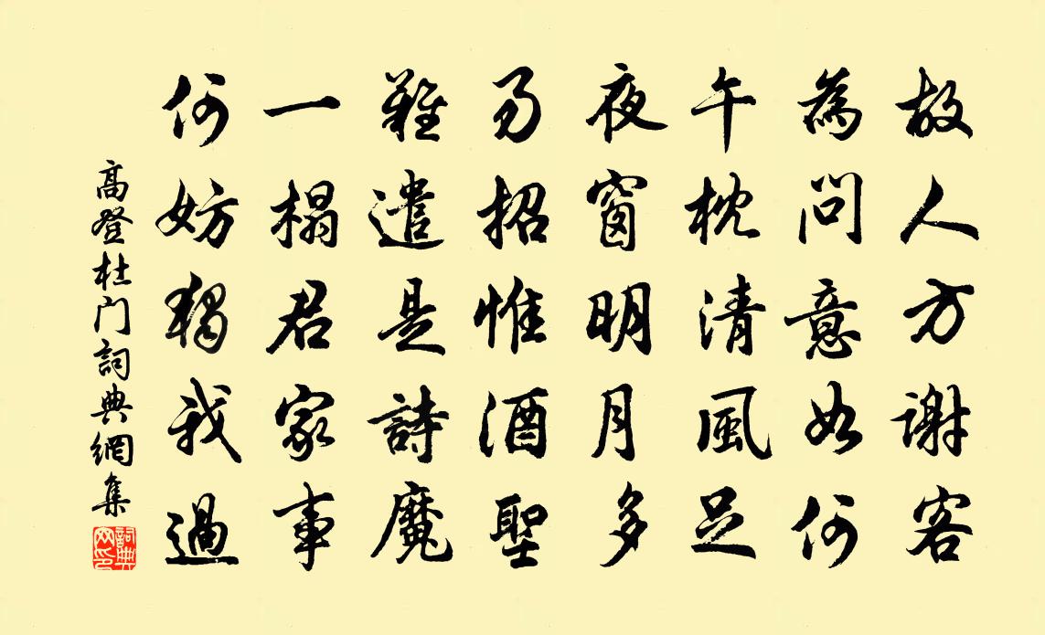 詩詞名句歷史字典書法欣賞書法字典國語詞典說文解字康熙字典古漢語字典標 題 作 者 詩 句 杜門作者:高登 朝代:宋代杜門原文故人方謝客,為問意如何。午枕清風足,夜窗明月多。易招惟酒聖,難遣是詩魔。一榻君家事,何妨獨我過。詩詞問答問:杜門的作者是誰?答:高登問:杜門寫於哪個朝代?答:宋代高登杜門書法欣賞杜門書法作品詩詞推薦金盞子史達祖〔宋代〕獎綠催紅,仰一番膏雨,始張春色。未踏畫橋煙,江南岸、應是草穠花密。尚憶濺裙苹溪,覺詩愁相覓。光風外,新晴項安世〔宋代〕幸甚乾逢甲,皤然雨變霜。彩衣雲漸衣,紋線日初長。預想慈懷動,先憑喜信將。背人三數鵲,飛去覺匆忙。獻從叔當塗宰陽冰李白〔唐代〕金鏡霾六國,亡新亂天經。焉知高光起,自有羽翼生。蕭曹安山兒屼,耿賈摧欃槍。吾家有季父,傑出新地英。雖瑞鶴仙(贈道女陳華山內夫人)吳文英〔宋代〕彩雲棲翡翠。聽鳳笙吹下,飛軿天際。晴霞剪輕袂。澹春姿雪態,寒梅清泚。東皇有意。旋安排、闌乾十二。早不贈龍興觀主吳崇岳周渭〔唐代〕楮為冠子布為裳,吞得丹霞壽最長。混俗性靈常樂道,出塵風格早休糧。枕中經妙誰傳與,肘後方新自寫將。百尺頌古五十七首釋道昌〔宋代〕撲落非他,安排不多。蓋覆自在,隱顯包羅。抬頭失卻舊時路,牛篙便上雖人渡。轉易作難,拔貧成富千人萬恁魔秋日懷國仲觀樓鑰〔宋代〕四明聳秀一溪流,曾記經行十里秋。行李今從何處住,宦遊自笑幾時休。兒時故舊今誰在,老去光陰不借留。贏得和程泰之閣學詠雪十二題煮雪袁說友〔宋代〕春芽初趁六花光,嫩火新烹喚客嘗。政藉瓊漿浮點乳,浪雲勝雪詫余香。喜劉元煇至二首方回〔宋代〕荒園槁葉飄,薺菜已堪挑。頗訝煎茶緩,元知汲水遙。日暄花迸蕾,霜過土生硝。小待謀新醞,詩朋一一招。頑獨連文鳳〔宋代〕頑獨齊前翠色交,倏然一榻掩衡茅。禪心久作高僧悟,方術寧從道士教。曉日短牆花弄影,晚風斜檻鶴歸巢。老懷玉關寄長安李主簿岑參〔唐代〕東去長安萬里餘,故人何惜一行書。玉關西望堪腸斷,況復明朝是歲除。句張釜〔宋代〕軒窗小憩俗塵清。江雨有懷鄭典設杜甫〔唐代〕春雨暗暗塞峽中,早晚來自楚王宮。亂波分披已打岸,弱雲狼藉不禁風。寵光蕙葉與多碧,點注桃花舒小紅。谷口廣箕子操金履祥〔宋代〕炎方之將,大地之洋。波湯湯,翠華重省方,獨立回天天無光。此志未就,死矣死南荒。不作田橫,橫來者王。不賀新郎祝穆〔宋代〕此木生林野。自唐家、絲綸置閣,托根其下。長伴詞臣揮帝制,因號紫微堪詫。常縹緲、紫微仙駕。料想紫微垣降和趙宮管看梅三首蘇泂〔宋代〕水邊山下懶尋伊,折放瓶中看一枝。一片飛來沾硯滴,似嗔老子不題詩。秋洞宿施肩吾〔唐代〕夜深秋洞裡,風雨報龍歸。何事觸人睡,不教胡蝶飛。嶺梅張道洽〔宋代〕到處皆詩境,隨時有物華。應酬都不暇,一嶺是梅花。游廬山山陽七詠其一開先瀑布蘇轍〔宋代〕山上流泉自作溪,行逢石缺瀉虹霓。定知雲外波瀾闊,飛到峰前本末齊。入海明河驚照曜,倚天長劍失提攜。誰來送邵馬勾二首李新〔宋代〕芳菊江蘺泣冷煙,秋風秋雨老行鞭。嘗依故國橫經笥,猶憶南堂乞炎仙。月瘴稍昏斜谷路,漁竿空倚北豀船。有錢名句推薦是故天地不昭昭,大水不潦潦,大火不燎燎,王德不堯堯者,乃千人之長也。墨子《墨子·01章 親士》 自昔佳人多薄命,對古來、一片傷心月。辛棄疾《賀新郎·用前韻送杜叔高》 人閒桂花落,夜靜春山空。王維《鳥鳴澗》 閒夢江南梅熟日,夜船吹笛雨蕭蕭。皇甫松《夢江南·蘭燼落》 月傍苑樓燈影暗,風傳閣道馬蹄回。王守仁《元夕二首》 長恨此身非我有,何時忘卻營營。蘇軾《臨江仙·夜飲東坡醒復醉》 聖人之救危國也,以忠拂耳。韓非及後人《韓非子·安危》 王粲登臨寥落際。雁飛不斷天連水。王庭筠《鳳棲梧·衰柳疏疏苔滿地》 車轔轔,馬蕭蕭,行人弓箭各在腰。杜甫《兵車行》 時危見臣節,世亂識忠良。鮑照《代出自薊北門行》