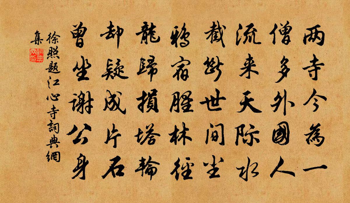 詩詞名句歷史字典書法欣賞書法字典國語詞典說文解字康熙字典古漢語字典標 題 作 者 詩 句 題江心寺作者:徐照 朝代:宋代題江心寺原文兩寺今為一,僧多外國人。流來天際水,截斷世間塵。鴉宿腥林徑,龍歸損塔輪。卻疑成片石,曾坐謝公身。詩詞問答問:題江心寺的作者是誰?答:徐照問:題江心寺寫於哪個朝代?答:宋代徐照題江心寺書法欣賞題江心寺書法作品詩詞推薦翰林讀書言懷,呈集賢諸學士李白〔唐代〕晨趨紫禁中,夕待金門詔。觀書散遺帙,探古窮至妙。片言苟會心,掩卷忽而笑。青蠅易相點,白雪難同調。本是永夕高蟾〔唐代〕雲鴻宿處江村冷,獨狖啼時海國陰。不會殘燈無一事,覺來猶有向隅心。點絳唇鄧有功〔宋代〕卷上珠簾,晚來一陣東風惡。客懷蕭索。看盡殘花落。自把銀瓶,買酒成孤酌。傷漂泊。知音難托。悶倚闌乾角。孟子知言陳普〔宋代〕識見超然地位高,人言情偽察秋毫。一些疾病生心腹,明鑑當台不可逃。微之敦詩晦叔相次長逝,巋然自傷,因成二絕白居易〔唐代〕並失鵷鸞侶,空留麋鹿身。只應嵩洛下,長作獨遊人。長夜君先去,殘年我幾何。秋風滿衫淚,泉下故人多。青衣道人羅尚簡論予命宜退不宜進甚契鄙心連周必大〔宋代〕亦知磨蝎直身宮,懶訪星官與歷翁。豈有虛名望蘇子,謾令簸惡似韓公。時清早退人誰肯,命薄當閒我自通。破戒紫微山富臨〔宋代〕鑿石誅茅四十年,稜層寶構出諸天。更逢地勝驚遊客,不負身披壞衲田。別郡坐看雲散後,平湖下壓鳥飛前。還知梁城贈一二同幕韓翃〔唐代〕五營河畔列旌旗,吹角鳴鼙日暮時。曾是信陵門下客,雨回相吊不勝悲。贈歐陽奇父偕弟卿赴省徐元傑〔宋代〕中朝耆舊半淪亡,憂愛胡為畎畝忘。我病不禁心痛折,天災惟有涕流滂。救時議論須知體,醫國文章要識方。期子發新安後途中寄盧中丞二首趙嘏〔唐代〕樓上風流庾使君,笙歌曾醉此中聞。目前已是陵陽路,回首叢山滿眼雲。晚樹蕭蕭促織愁,風簾似水滿床秋。千山頌古一百首釋智愚〔宋代〕以玉抵鵲,以鼠為璞。眇然視之,太虛寥廓。贈明州霍員外黃滔〔唐代〕惠化如施雨,鄰州亦可依。正衙無吏近,高會覺人稀。海日旗邊出,沙禽角外歸。四明多隱客,閒約到岩扉。訪孟守汪莘〔宋代〕紫陽佳山水,帝室雄垣藩。桑枯若雲屯,梨棗如星環。邇來十載,有失漢詔寬。坐令隴畝上,面作百摺酸。侯來自自衡陽移桂十餘本植零陵所住精舍柳宗元〔唐代〕謫官去南裔,清湘繞靈岳。晨登蒹葭岸,霜景霽紛濁。離披得幽桂,芳本欣盈握。火耕困煙燼,薪采久摧剝。道旁夜飛鵲蔣冽〔唐代〕北林夜方久,南月影頻移。何啻飛三匝,猶言未得枝。贈草堂宗密上人白居易〔唐代〕吾師道與佛相應,念念無為法法能。口藏傳宣十二部,心台照耀百千燈。盡離文字非中道,長住虛空是小乘。少有再和寇十一二首陳師道〔宋代〕南山樓觀插穹蒼,林杪青燈出上方。形勝自如諸老逝,功名隨盡二流長。馬游從昔哀吾老,王粲當年賦異鄉。少日雙調壽陽曲盧摯〔元代〕窗間月,檐外鐵,這淒涼對誰分說。剔銀燈欲將心事寫,長吁把燈吹滅。依韻奉和司徒侍中元城埽行河強至〔宋代〕一鼓千夫下揵聲,缺堤漏穴幾時平。盤渦倒吸湍流住,巨浸疑浮厚地行。舉鍤每年勞眾力,治河無策貢愚誠。賴公錢張宣慰三首王義山〔宋代〕種了甘棠打疊回,遮留競湊轍轅來。只存詩檐作行李,若問歸囊清過梅。抵為運籌咨漢傑,傳聞近日築燕台。為言名句推薦遠牧牛,繞村四面禾黍稠。李涉《牧童詞》 世事浮云何足問,不如高臥且加餐。王維《酌酒與裴迪》 兄弟之際,異於他人,望深則易怨,地親則易弭。顏之推《顏氏家訓·兄弟篇》 長呼人,即代叫。人不在,己即到。李毓秀《弟子規·出則弟》 高館張燈酒復清,夜鍾殘月雁歸聲。高適《夜別韋司士》 重足而立,側目而視。司馬遷《史記·汲鄭列傳》 天外鳳凰誰得髓?無人解合續弦膠。杜牧《讀韓杜集》 得言不可以不察。數傳而白為黑,黑為白。呂不韋《呂氏春秋·論·慎行論》 杯酒相延,今夕不應慳。陳著《江城子·中秋早雨晚晴》 昨夜風兼雨,簾幃颯颯秋聲。李煜《烏夜啼·昨夜風兼雨》