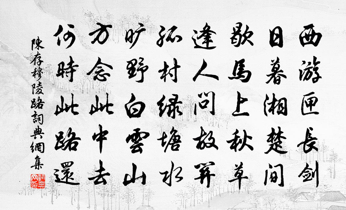 詩詞名句歷史字典書法欣賞書法字典國語詞典說文解字康熙字典古漢語字典標 題 作 者 詩 句 穆陵路作者:陳存 朝代:唐代穆陵路原文西遊匣長劍,日暮湘楚間。歇馬上秋草,逢人問故關。孤村綠塘水,曠野白雲山。方念此中去,何時此路還。詩詞問答問:穆陵路的作者是誰?答:陳存問:穆陵路寫於哪個朝代?答:唐代問:穆陵路是什麼體裁?答:五律陳存穆陵路書法欣賞穆陵路書法作品注釋全唐詩:卷311-6詩詞推薦上裴大夫二首貫休〔唐代〕我有一端綺,花彩鸞鳳群。佳人金錯刀,何以裁此文。我有白雲琴,朴斫天地精。俚耳不使聞,慮同眾樂聽。指指贈道士蹇拱辰賀鑄〔宋代〕嘗觀妙手御風圖,想像斯人世所無。今識黃冠葆光子,爽氣飄颻畫不如。岷峨東來九千里,眼飽高山與流水。乘春嘲解十首王邁〔宋代〕君臣大義等乾坤,兄弟何曾系大倫。齊霸分明誅子糾,唐宗決裂用讎臣。向時諸老空饒舌,何物狂生又犯鱗。一自題畫馬方回〔宋代〕芻秣豐肥十二閒,筆追韓乾此圖間。誰描驢瘦更詩瘦,首與雙肩共一山。頌古九十八首釋印肅〔宋代〕等閒平地掃塵埃,須還知有肯相陪。悲風皓月猿啼急,窮子離家甚日回。林徽猷挽間二首曹勛〔宋代〕出鎮溫陵重,鄰邦賴設施。未容推厚德,遽復見豐碑。落日輝丹旐,淒風入素帷。便知餘慶在,絕筆看遺詩。挽陳東湖趙必象〔宋代〕邯鄲法夢覺,歸臥讀書林。投老菊三徑,憂時雪一簪。魚安知我樂,鷗自識翁心。已矣鍾期死,眼前誰嘗音。小重山黃機〔宋代〕梧竹因依山盡頭。瀟瀟疏雨後,幾分秋。輕涼無數入西樓。憑欄久,滿眼動離愁。飛鷺下汀洲。怕知鴻雁到,帶書感梅有作曾豐〔宋代〕浪爾逢時早,終然受命孤。性便行所獨,物忌與之俱。巢許耳難浼,夷齊腸莫污。十分要相稱,太素可為徒。旅寓楊公遠〔宋代〕憶昔離家日,村村煮趼香。因循淹五月,次第過重陽。排悶詩多感,懷歸夢最長。君言名利事,都只付亡羊。新秋即事王禹偁〔宋代〕宦途流落似長沙,賴有詩情遣歲華。吟弄淺波臨釣渚,醉披殘照入僧家。石挨苦竹旁抽筍,雨打戎葵臥放花。安得別耿都尉高適〔唐代〕四十能學劍,時人無此心。如何耿夫子,感激投知音。翩翩白馬來,二月青草深。別易小千里,興酣傾百金。第二以酒渴愛江清作五小詩寄廖明略學士兼簡初和黃庭堅〔宋代〕將發沔鄂間,盡醉竹林酒。二三石友輩,未肯棄老朽。借問坐客誰,盧溪紫髯叟。此翁今惜醉,舊不論升斗。初一夜月詩蘇福〔宋代〕氣朔盈虛又一初,嫦娥應事半分無。都於無處分明有,恰似先天太極圖。山中戴表元〔宋代〕野水晴猶漲,春雷晚始鳴。地閒無堠邏,山遠有蠶耕。身世通寒暑,交遊半死生。方知一杯酒,真勝百年名。次韻二首葉茵〔宋代〕難把來箋向後黏,載持珠玉傍風檐。吟根此性辭平易,學本於經意簡嚴。未遜彌明聯石鼎,還嗤韓渥賦香奩。陽春頌古二十八首釋道川〔宋代〕三際求心心不見,兩眼依然對兩眼。不須遺劍刻舟尋,雪月風華常見面。出關路白居易〔唐代〕山川函谷路,塵土遊子顏。蕭條去國意,秋風生故關。和劉莘老贈王聖美三子侄補試太學聯中高等范祖禹〔宋代〕風流江左並淮原,王氏衣冠不乏賢。文似三珠才競爽,名如群玉氣相連。九秋鴻雁方遵陸,萬里驊騮始下鞭。白髮懷鄭洎孟遲〔唐代〕風蘭舞幽香,雨葉墮寒滴。美人來不來,前山看向夕。名句推薦將在外,君命有所不受畢沅《續資治通鑑·元紀·元紀三十》 漸老念鄉國,先歸獨羨君。簡長《送僧南歸》 陪都歌舞迎佳節,遙祝延安景物華。 * 《元旦口占用柳亞子懷人韻》 殘月出門時,美人和淚辭。韋莊《菩薩蠻·紅樓別夜堪惆悵》 芙蓉金菊斗馨香。天氣欲重陽。晏殊《訴衷情·芙蓉金菊斗馨香》 秋寂寞,秋風夜雨傷離索孫道絢《憶秦娥·季溫老友歸樵陽人來閒書因以為寄》 歌舞尊前,繁華鏡里,暗換青青發。薩都剌《念奴嬌·登石頭城次東坡韻》 嘆隙中駒,石中火,夢中身。蘇軾《行香子·述懷》 穠艷一枝細看取,芳心千重似束。蘇軾《賀新郎·夏景》 人生有情淚沾臆,江水江花豈終極!杜甫《哀江頭》