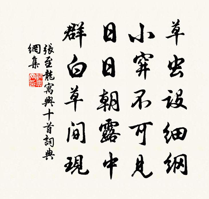 詩詞名句歷史字典書法欣賞書法字典國語詞典說文解字康熙字典古漢語字典標 題 作 者 詩 句 寓興十首作者:張至龍 朝代:宋代寓興十首原文草蟲設細綱,小穽不可見。日日朝露中,群白草間現。詩詞問答問:寓興十首的作者是誰?答:張至龍問:寓興十首寫於哪個朝代?答:宋代張至龍寓興十首書法欣賞寓興十首書法作品詩詞推薦代劉勛妻王氏雜詩曹丕〔魏晉〕翩翩床前帳。張以蔽光輝。昔將爾同去。今將爾同歸。緘藏篋笥里。當復何時披。寄楊贊圖學士學士與元昆俱以龍腦登選黃滔〔唐代〕東堂第一領春風,時怪關西小驥慵。華表柱頭還有鶴,華歆名下別無龍。君恩鳳閣含毫數,詩景珠宮列肆供。今日過金陵有感和韻趙善括〔宋代〕五馬渡江思典午,祖龍謾鑿秦淮浦。未登三代盛明時,曾是六朝文物祖。中興事業由憂勤,風流千載還芬薰。謝安次韻薛士昭琴室李洪〔宋代〕抗志青霞上,高情復見今。五言冠詩眼,三疊玩琴心。世業含香地,傳衣翰墨林。朝端方籲俊,正始有遺音。鄂州南樓書事四首黃庭堅〔宋代〕四顧山光接水光,恁欄十里芰荷香。清風明月無人管,並作南樓一味涼。挽蹇都官李曾伯〔宋代〕傾蓋荊州日,揚旌蘭澧時。相為王中慮,猶以歲寒期。筆寄嗟麟絕,言忠勿駟追。典型今已矣,老淚不勝悲。行春辭九首白玉蟾〔宋代〕綠楊無力暖相依,不管黃鶯訴落暉。水被魚吹成雨點,花為蝶擾逐風飛。酬周少隱贈行之什王之道〔宋代〕我老無知獨夢魚,清風一枕午鍾余。忽驚珠玉情相厚,便覺山林計不疏。酒熟會看延客醉,詩成還復遣兒書。何人減字木蘭花蔡伸〔宋代〕錦屏人醉。玉暖香融春有味。今日蘭舟。魂夢還隨綠水流。高城望斷。無奈城中人不見。斜倚妝樓。恨入眉峰兩點初九夜月二首楊萬里〔宋代〕也知月姊是天妹,天上人間絕世無。霧刷雲撩何不可,卻須插一水精梳。洛陽溫庭筠〔唐代〕鞏樹先春雪滿枝,上陽宮柳囀黃鸝。桓譚未便忘西笑,豈為長安有鳳池。再和陳傅良〔宋代〕休將枘鑿問方員,且引壺觴對聖賢。鴻雁不寶滄海凍,梅花相伴笑年年。再和程公許〔宋代〕一冬已放酒杯乾,三復名章敵露寒。著我瑤林瓊樹里,何須初雪畫江乾。安分王冕〔元代〕小逕入柴屝,茅蘆隱翠微。土磽黃獨瘦,溪暖白魚肥。夜照明膏竹,朝餐淨露薇。人生安分已,何必論雄飛?上湖北趙司倉三首廖行之〔宋代〕黼扆天高德意深,恩言臨遣重丁寧。九霄雨露新英節,一日風雷遍洞庭。財力定能均息耗,米鹽因得裕常經。如今聞彥執熙仲有辣螺詩聊復有作張九成〔宋代〕乾坤中空繞滄溟,千奇百怪斗露形。鯨鯢黿鼉突相撐,蚶蜃蚌蛤角介獰。是中有物入眼生,羊腸蟻垤紛縱橫。入口雪中同鄰幾齣游韓維〔宋代〕絮糅瓊霏浩滿空,平明騎馬入春風。九重城闕寒光外,百萬人家喜氣中。不學閉門徒自潔,且欣攜酒與君同。柳梢春怨王安石〔宋代〕掃地待花落,惜花輕著塵。遊人少春戀,踏去卻尋春。代人次韻曹郎中雷字二首唐士恥〔宋代〕計偕方此愧非材,先達仍勞綺席開。已喜摳衣披密霧,還將雅什助驚雷。定須勁翮摩雲舞,各是清班重哲魁。任昉東津陸游〔宋代〕歲暮涪江水歸壑,白沙渺然石犖角。蜀天常燠少雪霜,綠樹青林不搖落。闌乾詰曲臨官道,煙靄參差望城郭。打魚名句推薦致虛極;守靜篤。老子《老子·道經·第十六章》 能令暫開霽,過是吾無求。韓愈《洞庭湖阻風贈張十一署·時自陽山徙掾江陵》 清風明月無人管,並作南樓一味涼。黃庭堅《鄂州南樓書事》 投我以木瓜,報之以瓊琚。佚名《木瓜》 欲寄彩箋兼尺素,山長水闊知何處?晏殊《蝶戀花·檻菊愁煙蘭泣露》 道同方獲其利,道異惟受其害。來俊臣《羅織經·察奸卷第八》 允恭克讓,光被四表,格於上下。佚名《尚書·虞書·堯典》 萋萋春草秋綠,落落長松夏寒。王維《田園樂七首·其四》 雪洗虜塵靜,風約楚雲留張孝祥《水調歌頭·和龐佑父》 歲夜高堂列明燭,美酒一杯聲一曲。李頎《聽安萬善吹觱篥歌》