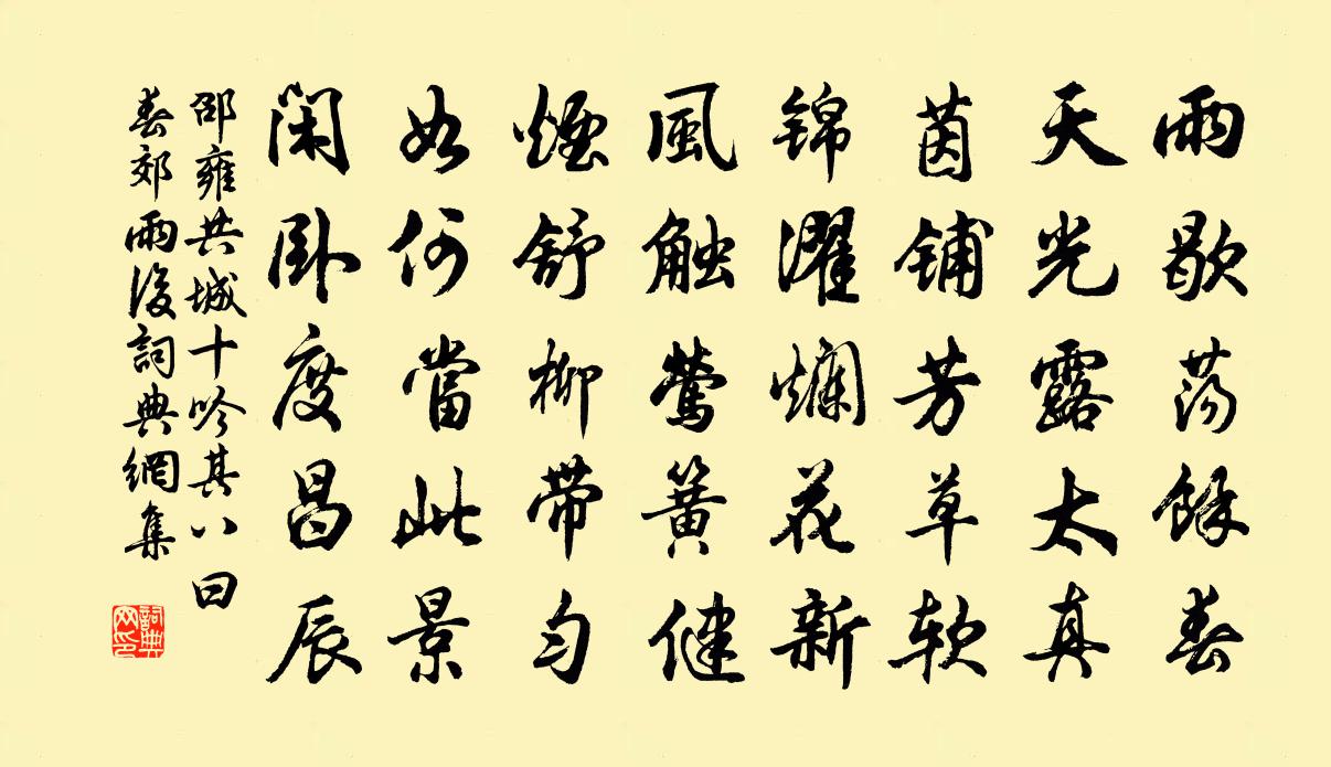 詩詞名句歷史字典書法欣賞書法字典國語詞典說文解字康熙字典古漢語字典標 題 作 者 詩 句 共城十吟其八曰春郊雨後作者:邵雍 朝代:宋代共城十吟其八曰春郊雨後原文雨歇盪余春,天光露太真。茵鋪芳草軟,錦濯爛花新。風觸鶯簧健,煙舒柳帶勻。如何當此景,閒臥度昌辰。詩詞問答問:共城十吟其八曰春郊雨後的作者是誰?答:邵雍問:共城十吟其八曰春郊雨後寫於哪個朝代?答:宋代邵雍共城十吟其八曰春郊雨後書法欣賞共城十吟其八曰春郊雨後書法作品詩詞推薦龍門送裴侍御監五嶺選李頎〔唐代〕萬里番禺地,官人繼帝憂。君為柱下史,將命出東周。歇馬傍川路,張燈臨石樓。稜稜靜疏木,濞濞響寒流。榔葉陳口華侍兒讀書姜夔〔宋代〕繹句尋章久未休,花房日晏不梳頭。誰教郎主能多事,乞與冥冥千古愁。投贈福建路羅中丞陳陶〔唐代〕越艷新謠不厭聽,樓船高臥靜南溟。未聞建水窺龍劍,應喜家山接女星。三捷楷模光典策,一生封爵笑丹青。皇恩雙檜聯句李邵〔宋代〕古宇列雙檜,森郁欹檐角。高幹若偃蓋,低枝羅翠幄。葉硬攢蝟毛,子圓如雀殼。盤根雖輪囷,呈才終卓牽。枯冬挽丘大卿二首劉克莊〔宋代〕方喜遼天孤鶴返,忽驚蔡嶺一牛鳴。理官未遣儔三後,拙宦才令至九卿。盡翦萑莆潢弄息,不囊薏苡粵裝輕。厚誣六州歌頭劉過〔宋代〕柳思花情,湖山應怪,先生又來。想舊時談舌,依然解使,六丁奔走,驅斥風雷。翠袖傳觴,金貂換酒,痛飲何妨頌古一百首釋智愚〔宋代〕始見春花歸閬苑,又逢秋葉墮宮牆。思量世事如翻掌,誰得長生不死方。陪馮使君游六首登乾霄亭貫休〔唐代〕擁翠捫蘿山屐輕,飄颻紅旆在青冥。仙科朱紱言非貴,溪鳥林泉癖愛聽。古桂林邊棋局濕,白雲堆里茗煙青。因思碧波亭劉克莊〔宋代〕了卻文書上馬遲,白苹洲畔有心期。斜陽忽到傳觴處,落盡梨花啼子規。見陳制帥子華二首羅椅〔宋代〕北山老子勉齋翁,總把經綸付我公。胸次詩書行杲日,兵前草木轉春風。五溪衣服桑麻盡,萬里東南煙火空。直待淡黃柳詹玉〔宋代〕又次冬,公謹自剡還,執手聚別,且復別去。悵然於懷,敬賦此解花邊短笛。初結孤山約。雨悄風輕寒漠漠。翠鏡戴雲山吟智亮〔唐代〕人間謾說上天梯,上萬千回總是迷。曾似老人岩上坐,清風明月與心齊。戴雲山頂白雲齊,登頂方知世界低。異草和顏長官百詠邊庭朱繼芳〔宋代〕探使歸來半信疑,帳前相語怕人知。沉香霧裡嬌弦暖,莫遣邊愁到兩眉。寄題劉仲更澤州家園韓維〔宋代〕聞君有佳尚,買勝不論錢。逕鑿蒼林蘚,亭開翠壁煙。從花窮洛譜,得石記唐年。數卷書勇萬,言章木以千。晨昏閒居諮〔宋代〕兀兀浮生水上萍,百年那得眼長青。醉中但愛杯呼月,鏡里驚看髩易星。瓶膽插花時過蝶,石拳栽草也留螢。瑤音孤憤吟十三首高斯得〔宋代〕軍功閣束萬人多,兵部門前雀哥羅。悍將武夫心失盡,可知棄甲與投戈。偈頌一百零二首釋紹曇〔宋代〕人間萬斛金連,競賞元宵佳節。法華徹骨貧窮,鬥勝不如斗劣。室內一盞燈,燦燦心共綠。不夜光明照古今,見得訪黃簿留飲趙汝鐩〔宋代〕愛靜移家住水南,門排古木枕寒潭。鶴翎漸長呼童翦,塵尾頻揮對客談。旋切銀絲膾鮮鯽,新嘗金顆擘香柑。惜余和祖擇之學士袁州慶豐堂十詠陳詵〔宋代〕秀泉開舊甃,初試仰山茶。寂寂有餘意,池蓮三五花。荔枝香近·送人游南徐吳文英〔宋代〕錦帶吳鉤,征思橫雁水。夜吟敲落霜紅,船傍楓橋系。相思不管年華,喚酒吳娃市。因話、駐馬新堤步秋綺。 淮名句推薦不鏡於水,而鏡於人,則吉凶可鑑也王永彬《圍爐夜話·第五二則》 漠漠秋雲起,稍稍夜寒生。白居易《微雨夜行》 握手西風淚不乾,年來多在別離間。納蘭性德《於中好·送梁汾南還為題小影》 舊山松竹老,阻歸程。岳飛《小重山·昨夜寒蛩不住鳴》 落葉人何在,寒雲路幾層。李商隱《北青蘿》 黃衫飛白馬,日日青樓下。陳克《菩薩蠻·赤闌橋盡香街直》 丹陽郭里送行舟,一別心知兩地秋。嚴維《丹陽送韋參軍》 私視使目盲,私聽使耳聾,私慮使心狂。呂不韋《呂氏春秋·紀·季冬紀》 三年不翅,將以長羽翼;不飛不鳴,將以觀民則。雖無飛,飛必沖天;雖無鳴,鳴必驚人。韓非及後人《韓非子·喻老》 階下青苔與紅樹,雨中寥落月中愁。李商隱《端居》