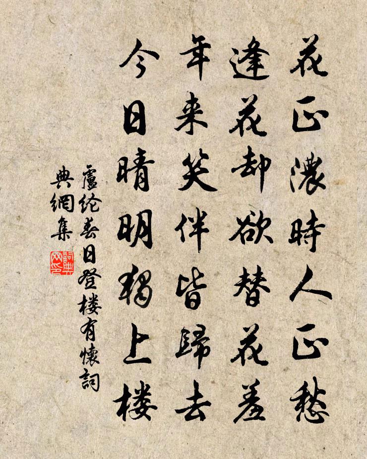 花正濃時人正愁,逢花卻欲替花羞。年來笑伴皆歸去,今日晴明獨上樓。