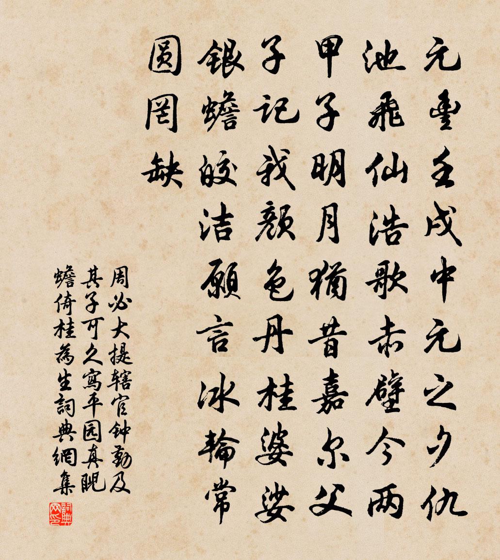 詩詞名句歷史字典書法欣賞書法字典國語詞典說文解字康熙字典古漢語字典標 題 作 者 詩 句 提轄官鍾勤及其子可久寫平園真睨蟾倚桂為生作者:周必大 朝代:宋代原文元豐壬戌,中元之夕。仇池飛仙,浩歌赤壁。今兩甲子,明月猶昔。嘉爾父子,記我顏色。丹桂婆娑,銀蟾皎潔。願言冰輪,常圓罔缺。詩詞問答問:《提轄官鍾勤及其子可久寫平園真睨蟾倚桂為生》的作者是誰?答:周必大問:該詩寫於哪個朝代?答:宋代書法欣賞提轄官鍾勤及其子可久寫平園真睨蟾倚桂為生書法作品詩文賞析【原題】:提轄官鍾勤及其子可久寫平園真睨蟾倚桂為生日壽詩詞推薦旌表門閭安人陳氏輓詞樓鑰〔宋代〕族姓朱陳盛,夫人事愈明。老姑俱上壽,難弟各清名。節行輝丹管,門閭照赤城。寶鄰方有托,何忍送銘旌。秋夕書事陸游〔宋代〕點點秋燈晚,翻翻宿鳥還。雨添羈枕睡,書伴小窗閒。僧閣荒寒外,漁村縹緲間。畫工今代少,誰為寫家山?句石延年〔宋代〕天醉笙歌外,風香羅綺餘。天香(宛委山房擬賦龍涎香)馮應瑞〔宋代〕枯石流痕,殘沙擁沫,驪宮夜蟄驚起。海市收時,鮫人分處,誤入眾芳叢里。春霖未就,都化作、淒涼雲氣。惟有酒泉子 三閘奔湍(在嘉禾北,望吳門外)吳鎮〔元代〕三閘奔湍,一塘遠接吳淞水,兩行垂柳綠如雲。今古送行人。買妻恥醮藏羞墓。秋茂郵亭*書處。路逢樵子莫呼名乙巳歲首寄彭子復徐子直陳傅良〔宋代〕又過一年空草草,尋思萬事太勞勞。歲煩士友愁薪米,日見兒童嘆鬢毛。亂卉各隨分雨長,新禽已變兩三號。及時旋師喜捷李隆基〔唐代〕邊服胡塵起,長安漢將飛。龍蛇開陣法,貔虎振軍威。詐虜腦塗地,征夫血染衣。今朝書奏入,明日凱歌歸。水石胡宏〔宋代〕水石平生性所便,栽花種柳亦天然。春風花發遊人見,秋月雲收照我員。玩意隴雲情自逸,放懷天理道我偏。坐消贈李兵馬使白居易〔唐代〕身得貳師餘氣概,家藏都尉舊詩章。江南別有樓船將,燕頷虬須不姓楊。菩薩蠻(西湖)蘇軾〔宋代〕秋風湖上蕭蕭雨。使君欲去還留住。今日漫留君。明朝愁 * 。佳人千點淚。灑向長河水。不用斂雙蛾。路人啼更吳民女陳潤道〔宋代〕吳民嗜錢如嗜飴,天屬之愛亦可移。養女日夜望成長,長成未必為民妻。百金求師教歌舞,便望將身贍門戶。一家念奴嬌 台城鄭燮〔清代〕秋之為氣,正一番風雨,一番蕭瑟。落日雞鳴山下路,為問台城舊跡。老蔓藏蛇,幽花賤血,壞堞零煙碧。有人牧制置丁少卿生日魏了翁〔宋代〕皜皜陵霄獨鶴飛,九芙蓉里爛生輝。青陽少府舊弓冶,白石先生新杼機。閱盡世紛磨不磷,聽渠公論是邪非。恭惟真興寺閣蘇軾〔宋代〕山川與城郭,漠漠同一形。市人與鴉鵲,浩浩同一聲。此閣幾何高,何人之所營。側身送落日,引手攀飛星。當年絕命詩徐元娘〔宋代〕毓秀含華十六齡,慈韓口授十三經。奇文不欲撐天地,大節偏教揭日星。何姓移劍亡漢室,誰人復楚乞秦廷。顧從春日即事周南〔宋代〕料理清明天氣催,攙先幾日柁船開。六朝事往余簪塔,百草春回上舞台。巢燕爭迎華屋去,海潮猶傍故城來。主人游謝氏山亭李白〔唐代〕淪老臥江海,再歡天地清。病閒久寂寞,歲物徒芬榮。借君西池游,聊以散我情。掃雪松下去,捫蘿石道行。謝公浣口泊舟曉望天柱峰齊己〔唐代〕根盤潛岳半,頂逼日輪邊。冷碧無雲點,危棱有瀑懸。秀輕毛女下,名與鼎湖偏。誰見扶持力,峨峨出後天。奉和御製讀後漢書詩夏竦〔宋代〕昭公祥漢律,求比禮三千。刻敝深文息,寬平治德全。芳猷宣輔弼,餘慶茂忠賢。方驗來嘉瑞,仁矜理最先。寧海駱君輓詞樓鑰〔宋代〕古易人皆學,惟君志益堅。研朱滴秋露,讀簡斷韋編。空谷甘無用,佳兒尚有傳。清風誰得似,竹滿臥床前。名句推薦牽牛織女遙相望,爾獨何辜限河梁。曹丕《燕歌行二首·其一》 照花前後鏡,花面交相映。溫庭筠《菩薩蠻·小山重疊金明滅》 兩個黃鸝鳴翠柳,一行白鷺上青天。杜甫《絕句》 閉門家裡坐,禍從天上來。馮夢龍《醒世恆言·卷十六》 雲山行處合,風雨興中秋。高適《送魏八》 君子之所貴者,遷善懼其不及,改惡恐其有餘。徐幹《中論·上卷·虛道》 歌鐘不盡意,白日落昆明。李白《經亂離後天恩流夜郎憶舊遊書懷贈江夏韋太守良宰》 言不過行,行不過道戴聖《大戴禮記·文王官人第七十二》 春色三分,二分塵土,一分流水。蘇軾《水龍吟·次韻章質夫楊花詞》 喜遇重陽,更佳釀今朝新熟。宋江《滿江紅·喜遇重陽》
