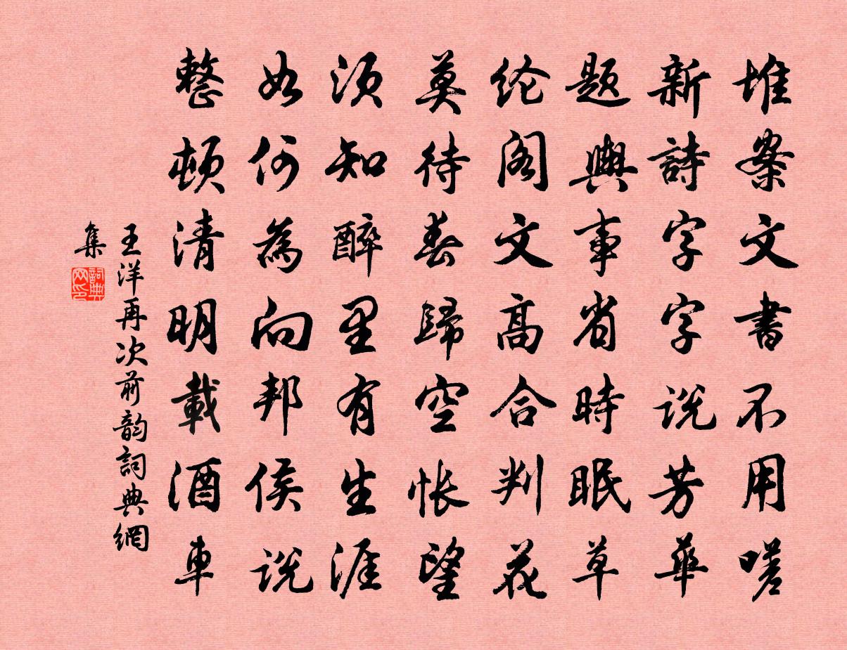 詩詞名句歷史字典書法欣賞書法字典國語詞典說文解字康熙字典古漢語字典標 題 作 者 詩 句 再次前韻作者:王洋 朝代:宋代再次前韻原文堆案文書不用嗟,新詩字字說芳華。題輿事省時眠草,綸閣文高合判花。莫待春歸空悵望,須知醉里有生涯。如何為向邦侯說,整頓清明載酒車。詩詞問答問:再次前韻的作者是誰?答:王洋問:再次前韻寫於哪個朝代?答:宋代王洋再次前韻書法欣賞再次前韻書法作品詩詞推薦友人楚孟德過余縱言及神仙余謂之無孟德謂之司馬光〔宋代〕仙術有地終未知,眠看白髮亂如絲。何時得接浮丘袂,滄海橫飛萬餘里。松菊堂讀史五首晁補之〔宋代〕不作文饒將相官,野人亦罣黨人間。籌邊措國俱無用,空對平泉草木閒。有議袁蒙齋者戴復古〔宋代〕世上苦無公是非,譏評人物信猶疑。鏡中妍醜無私照,棋上高低有誤時。懷古尚餘喬木在,傷春唯許落花知。黃金單于川對雨二首蘇味道〔唐代〕崇朝遘行雨,薄晚屯密雲。緣階起素沫,竟水聚圓文。河柳低未舉,山花落已芬。清尊久不薦,淹留遂待君。飛雨贈高老李處權〔宋代〕野寺何所有,梅花如玉盆。客愁浩如許,我聲已載吞。大士坐丈室,燠若陽穀溫。從來第一義,入耳簡不煩。不謂買舟王鎡〔宋代〕赤闌橋上路,幾度卜歸期。流水無休日,行人有老時。潮來江勢逆,月出海門遲。風順輕舟快,蒲帆盡夜吹。巫峽陸龜蒙〔唐代〕巫峽七百里,巫山十二重。年年自雲雨,環佩竟誰逢?上藍和尚晉漢二代讖佚名〔唐代〕石榴花發石榴開。妙峰亭晚望史彌寧〔宋代〕峭峰頂上著危亭,四面山開雲錦屏。農淡淺深多變態,天公浪費幾丹青。滿庭芳韓淲〔宋代〕玉水靈山,霜天清曉,非煙非霧琴堂。載臨初度,圭壁記煌煌。百里民安撫字,歡呼處、禾黍登場。今年好,為茲享文恭太子廟樂章二首馮伉〔唐代〕撰日瞻景,誠陳樂張。禮容秩秩,羽舞煌煌。肅將滌濯,祗薦芬芳。永錫繁祉,思深享嘗。乾旄羽籥相虧蔽,一進昭州陶弼〔宋代〕假守昭平郡,偷閒少送迎。亭標梅句老,堂識敬公名。千秋歲歐陽修〔宋代〕羅衫滿袖,儘是憶伊淚。殘妝粉,餘香被。手把金尊酒,未飲先如醉。但向道,厭厭成病皆因你。離思迢迢遠,一日暮自大匯村歸陸游〔宋代〕筍輿伊軋暮山昏,水敗陂塘路僅存。出谷鐘聲知過寺,隔林人語喜逢村。廟壖荒寂新犁地,堤草淒迷舊燒痕。兒子和門下相公從駕幸太學蘇頌〔宋代〕聖主恢儒率舊章,首冬鳴蹕下膠庠。生師褒博趨鱣序,文武端嚴列雁行。承詔敷陳商戊甲,執經環立晉袁王。三千題烏江湯泉寄老庵賀鑄〔宋代〕西庵松竹深,薄暮更微雨。山禽不畏人,嘲哳方對語。而余倦宦者,罷日今可數。京邑夙所懷,其如惡塵土。行復得道陽王哲〔元代〕六月純陽盡入莊。陰魔趕退出街坊。壬癸北方添腎水,丙丁南嶽*真香。鬼魅妖邪盡總忙。群魔難聚沒堤防。子後真宗告鄉六首真宗〔宋代〕於昭列聖,休德清明。威靈如在,享於克誠。報勁厚載,聲芒惟精。歸格飲至,禮備樂成。留別昌國五首王阮〔宋代〕三山月淡白銀闕,九老春閒紫石宮。此去能爭幾多地,恨無仙骨到其中。失調名佚名〔宋代〕凝情羞對海棠花。名句推薦對秋深,離恨苦,數夜滿庭風雨。孫光憲《更漏子·對秋深》 亂鴉三四點,愁坐話無憀。陳維崧《臨江仙·寒柳》 福滿須防有禍,凶多料必無爭。佚名《增廣賢文·下集》 祖宗疆土,當以死守,不可以尺寸與人。脫脫《宋史·列傳·卷一百一十七》 父母在,不遠遊,遊必有方。孔子弟子《論語·里仁篇》 為我引杯添酒飲,與君把箸擊盤歌。白居易《醉贈劉二十八使君》 綠竹半含籜,新梢才出牆。杜甫《嚴鄭公宅同詠竹》 素手把芙蓉,虛步躡太清。李白《古風·其十九》 永懷愁不寐,松月夜窗虛。孟浩然《歲暮歸南山 / 歸故園作 / 歸終南山》 昨風一吹無人會,今夜清光似往年。白居易《八月十五日夜湓亭望月》