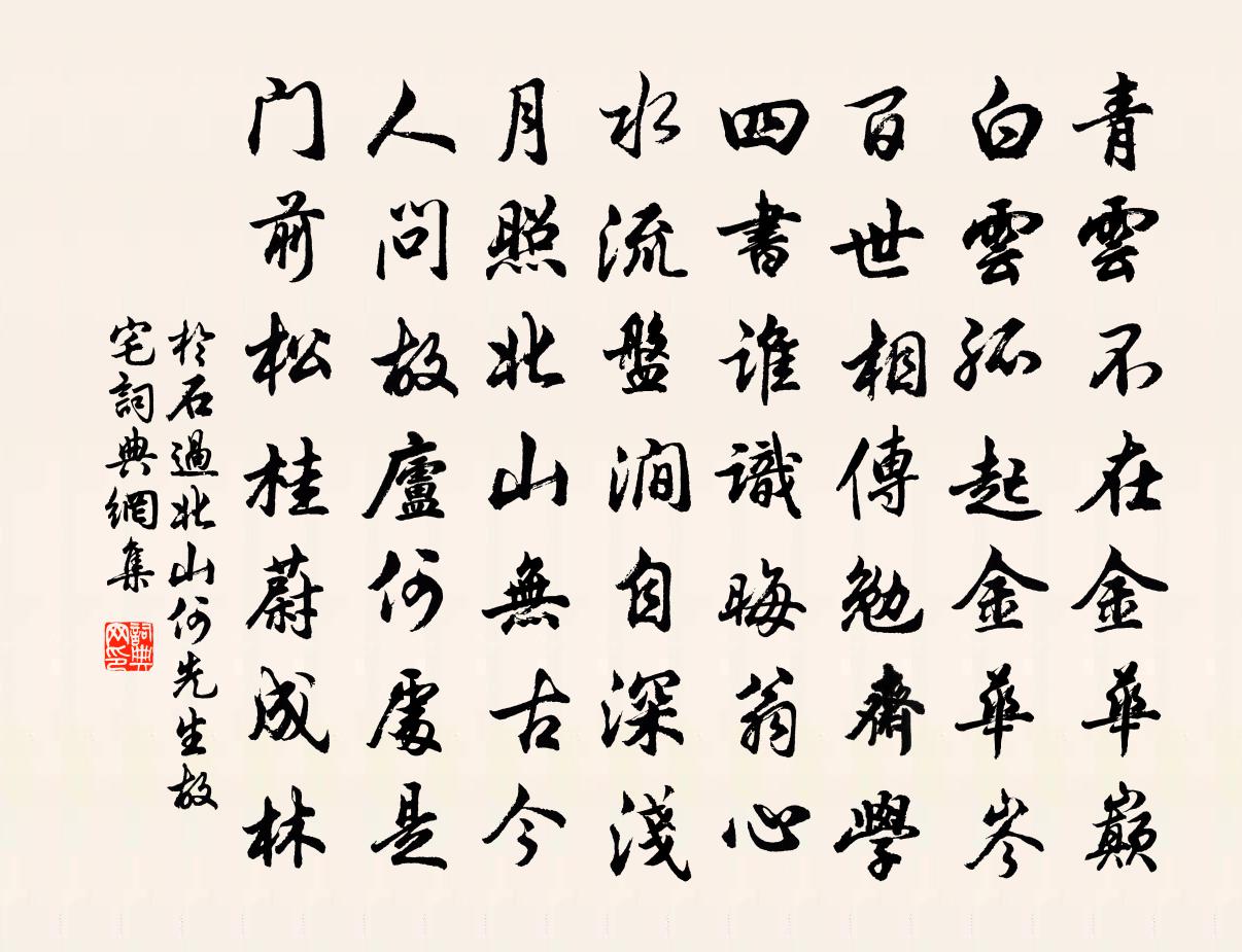 詩詞名句歷史字典書法欣賞書法字典國語詞典說文解字康熙字典古漢語字典標 題 作 者 詩 句 過北山何先生故宅作者:於石 朝代:宋代過北山何先生故宅原文青雲不在金華巔,白雲孤起金華岑。百世相傳勉齋學,四書誰識晦翁心。水流盤澗自深淺,月照北山無古今。人問故廬何處是,門前松桂蔚成林。詩詞問答問:過北山何先生故宅的作者是誰?答:於石問:過北山何先生故宅寫於哪個朝代?答:宋代於石過北山何先生故宅書法欣賞過北山何先生故宅書法作品詩詞推薦上三峽李白〔唐代〕巫山夾青天,巴水流若茲。巴水忽可盡,青天無到時。三朝上黃牛,三暮行太遲。三朝又三暮,不覺鬢成絲。結庵白玉蟾〔宋代〕結庵居深山,靜中觀萬物。綠苔封曉雲,蒼藤縛夜月。啼鳥掛岩頭,暗水洗石骨。風起山若雷,海翻浪似雪。少年達奚吏部夫人寇氏輓歌李頎〔唐代〕存歿令名傳,青青松柏田。事姑稱孝婦,生子繼先賢。露濕銘旌重,風吹鹵簿前。陰堂從此閉,誰誦女師篇。頌古三首釋嗣宗〔宋代〕弟昆各自逞功能,獨有家兄徹骨貧。三拜起來無一語,鼻孔累垂蓋上唇。頌古一百首釋智愚〔宋代〕百年猶恐沒人知,名字仍交廳脅題。入水入泥難放牧,仰山只得半邊騎。漢武帝雜歌三首韋應物〔唐代〕漢武好神仙,黃金作台與天近。王母摘桃海上還,感之西過聊問訊。欲來不來夜未央,殿前青鳥先迴翔。綠鬢縈雲江州陳制送酒項安世〔宋代〕誰渭淵明遠,我住栗里源。亦有好事人,送酒黃花前。舉酒對南湖,見之心悠然。相逢各無心,後世自稱賢。朝中措朱敦儒〔宋代〕先生饞病老難醫。赤米厭晨炊。自種畦中白菜,醃成瓮里黃齏。肥蔥細點,香油慢煼,湯餅如絲。早晚一杯無害,南樓李猷卿〔宋代〕三面江光抱城郭,四圍山勢鎖煙霞。馬鞍嶺上渾如錦,繖蓋門前半是花。擬古崔融〔唐代〕飲馬臨濁河,濁河深不測。河水日東往,河源乃西極。思君正如此,誰為生羽翼。日夕大川陰,雲霞千里色。所思二月十九日席上賦四首魏了翁〔宋代〕年光又見一百五,春意才餘十二三。節物催人渾不覺,謾隨白墮看紅酣。戲嘲杜宇鄭清之〔宋代〕呼晴不似鳩知務,報喜何如鵲愛人。有口自鳴誰禁汝,亂啼何必待殘春。九歌·湘君屈原〔先秦〕君不行兮夷猶,蹇誰留兮中洲;美要眇兮宜修,沛吾乘兮桂舟;令沅湘兮無波,使江水兮安流;望夫君兮未來,吹食豆莢鄭清之〔宋代〕西風摵摵草蟲鳴,萬夾叢中詫瑞蓂。煮啖快輸兒女吻,燃萁不忍尚堆青。題趙檢察贄卷劉克莊〔宋代〕福唐少尹平生友,函送王孫一卷詩。始信人間有龍種,又疑天上下麟兒。月須玉斧修成後,仙待金丹煉熟時。不是頌古八首釋道印〔宋代〕接得與識得,誰復較錙銖。若問堂中事,堂中事轉疏。只如雲蓋悟去,又作麽蘇嚕囌嚕。頌塵塵三昧釋真慈〔宋代〕缽里飯,桶里水,別寶崑崙坐潭底。一塵塵上走須彌,明眼波斯笑彈指。笑彈指,珊瑚枝上清風起。嘉禾百詠竹橋張堯同〔宋代〕腰枕政亭北,橫斜古渡頭。風吹雙淚落,恨逐水東流。子夜四時歌 夏歌 三蕭衍〔南北朝〕玉盤著朱李。金杯盛白酒。雖欲持自親。復恐不甘口。宴崔駙馬玉山別業錢起〔唐代〕金榜開青瑣,驕奢半隱淪。玉簫惟送酒,羅袖愛留賓。竹館煙催暝,梅園雪誤春。滿朝辭賦客,儘是入林人。名句推薦人歸山郭暗,雁下蘆洲白。韋應物《夕次盱眙縣》 黃昏院落,淒悽惶惶,酒醒時往事愁腸。李清照《行香子·天與秋光》 寄書長不達,況乃未休兵。杜甫《月夜憶舍弟》 下窺指高鳥,俯聽聞驚風。岑參《與高適薛據同登慈恩寺浮圖》 天下稍安,尤須兢慎,若便驕逸,必至喪敗。吳兢《貞觀政要·卷一·論政體》 去日兒童皆長大,昔年親友半凋零。竇叔向《夏夜宿表兄話舊》 鵲橋波里出,龍車霄外飛。任希古《和長孫秘監七夕》 黃雲隴底白雲飛,未得報恩不能歸。李頎《古意》 望長城內外,惟余莽莽;大河上下,頓失滔滔。 * 《沁園春·雪》 欲為君盡君道,欲為臣盡臣道孟子《孟子·離婁章句上·第二節》