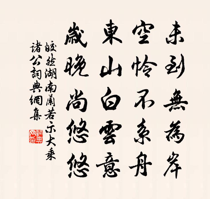 詩詞名句歷史字典書法欣賞書法字典國語詞典說文解字康熙字典古漢語字典標 題 作 者 詩 句 湖南蘭若示大乘諸公作者:皎然 朝代:唐代湖南蘭若示大乘諸公原文未到無為岸,空憐不繫舟。東山白雲意,歲晚尚悠悠。詩詞問答問:湖南蘭若示大乘諸公的作者是誰?答:皎然問:湖南蘭若示大乘諸公寫於哪個朝代?答:唐代皎然湖南蘭若示大乘諸公書法欣賞湖南蘭若示大乘諸公書法作品詩詞推薦六月十七夜出寺門驟有所聞疑水與風即而觀之趙蕃〔宋代〕驟得疑傾峽,徐行若泛潮。胡為隔田畝,而不度林椒。爽氣雖能及,作波不可招。不眠如有待,衝口漫成謠。寄右史李定言(許渾集寄李定言律詩第二三聯即此四句)姚合〔唐代〕才歸龍尾含雞舌,更立螭頭運兔毫。閶闔欲開金漏盡,冕旒初坐御香高。詩品二十四則。流動司空圖〔唐代〕若納水輨,如轉丸珠。夫豈可道,假體遺愚。荒荒坤軸,悠悠天樞。載要其端,載同其符。超超神明,返返冥無。南歌子(示景裴弟,時葉憲明日真率)洪适〔宋代〕頑健輸村老,嬉遊付後生。七旬才有五清明。須趁良辰美景、繞園行。雲意將飛雪,天心未肯晴。難將性命作人情漁家傲(梅影)強至〔宋代〕雪月照梅溪畔路。幽姿背立無言語。冷浸瘦枝清淺處。香暗度。妝成處士橫斜句。渾似玉人常淡佇。菱花相對盈清秋日感懷孔武仲〔宋代〕萬山松色鎖蟬嗚,日透林陰上下清。霜壓蒹葭連地白,風吹河漢滿天聲。穹廬夜動陰山虜,玉甲朝屯紫塞兵。願漱真游覓唐輿題詩不見有懷其人八首趙蕃〔宋代〕險絕辰州路,曾聞一再行。看岩有留句,捫石欠題名。四世斯文事,平生一壑情。何當從此去,感念在先生。句鄭獬〔宋代〕好擁雙旌便東下,畫船明月綠楊津。木蘭花慢吳文英〔宋代〕紫騮嘶凍草,曉雲鎖、岫眉顰。正蕙雪初銷,松腰玉瘦,憔悴真真。輕藜漸穿險磴,步荒苔、猶認瘞花痕。千古興銅雀妓高適〔唐代〕日暮銅雀迥,秋深玉座清。蕭森松柏望,委郁綺羅情。君恩不再得,妾舞為誰輕。入瞿唐登白帝廟陸游〔宋代〕曉入大溪口,是為瞿唐門。長江從蜀來,日夜東南奔。兩山對崔嵬,勢如塞乾坤,峭壁空仰視,欲上不可捫。禹功景祐釋奠武成王六首佚名〔宋代〕聖朝稽古,崇茲武經。禮交樂舉,於神之庭。嘉粟旨酒,既鄉芳聲。永嚴列象,劍為簪纓。贈鐵牌道者張耒〔宋代〕微官待旦亦朝天,賴爾絕勝鐘鼓傳。舉世昏冥竟難警,憐君常負五更眠。詠二疏章粲〔宋代〕人生白駒過,世態蒼狗變。紛紛慕跖蹻,寥寥志務卞。赫赫王侯居,翕翕富貴戀。翠蓋擁游雲,朱鞍曜驚電。金張霜天曉角(壽蕭靜安,時歸永新)劉辰翁〔宋代〕歸來把菊。春瓮今朝熟。苦苦留君不得,攜孺子、到汾曲。廬山真面目。冰清還映玉。長笑歐公老懶,君且住,飲熊主簿示梅花十絕詩至梅花已過因觀海棠輒次劉克莊〔宋代〕萬蕊千葩染似紅,停杯無語恨東風。薄寒且為花愁惱,何況開時值雨中。次韻遂寧府宴貢士即席賦二首魏了翁〔宋代〕過盡一春花信風,魚天鼓浪送蒙沖。鳳翰有目爭先睹,牛角無人嘆不逢。選試謾稱新漢使,作成端屬舊春宗。鹿鳴送舍弟李嘉祐〔唐代〕諸謝偏推永嘉守,三何獨許水曹郎。老兄鄙思難儔匹,令弟清詞堪比量。疊嶂入雲藏古寺,高秋背月轉南湘。定知微雨午寢夢憩道傍驛舍若在秦蜀間慨然有賦陸游〔宋代〕吳中秋晚雨冥冥,自笑閒愁又爾馨。身世已歸南北陌,夢魂猶寄短長亭。濁醪可釀樽余綠,明鏡無情鬢失青。賴有生米磯之至德觀余舊遊也嘗有題釣磯胡柏七言趙蕃〔宋代〕此地傳為天寶門,政由漁叟話桃源。閣中名字誰為立,知是君平幾世孫。名句推薦四面歌殘終破楚,八年風味徒思浙。秋瑾《滿江紅·小住京華》 積善逢善,積惡逢惡。馮夢龍《喻世明言·卷二十六》 牆裡鞦韆牆外道。牆外行人,牆裡佳人笑。蘇軾《蝶戀花·春景》 天涯失鄉路,江外老華發。李白《江南春懷》 離恨又迎春,相思難重陳。和凝《菩薩蠻·越梅半拆輕寒里》 竹外桃花三兩枝,春江水暖鴨先知。蘇軾《惠崇春江晚景 / 惠崇春江曉景》 黃河萬里觸山動,盤渦轂轉秦地雷。李白《西嶽雲台歌送丹丘子》 諫爭輔拂之人,社稷之臣也,國君之寶也,明君之所尊厚也荀子《荀子·臣道》 夢回芳草思依依,天遠雁聲稀。李煜《喜遷鶯·曉月墜》 此地一為別,孤蓬萬里征。李白《送友人》