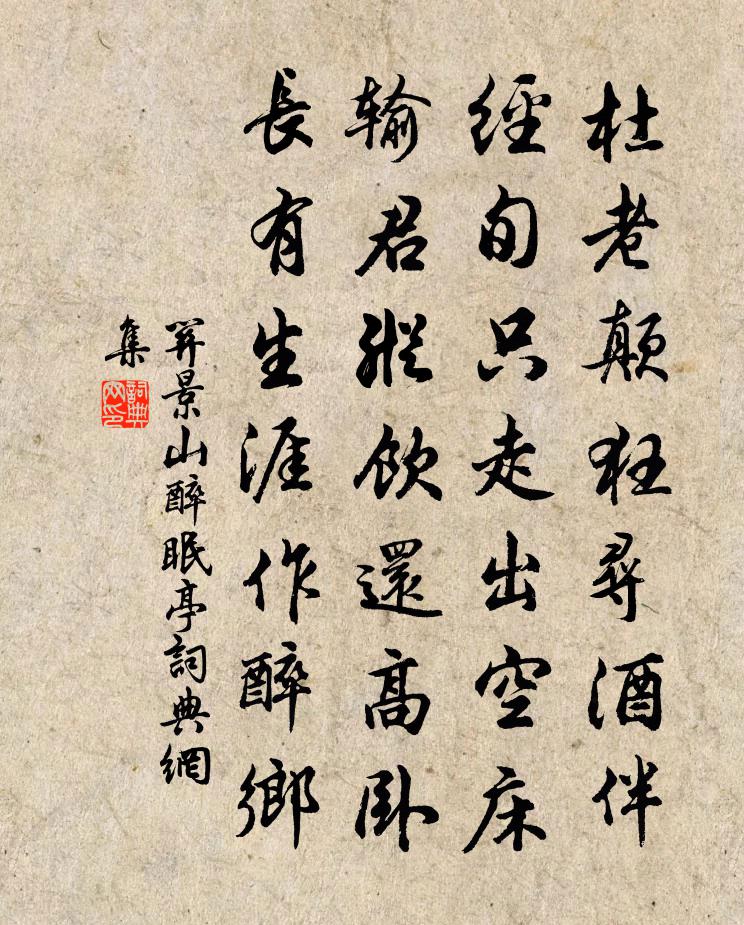 詩詞名句歷史字典書法欣賞書法字典國語詞典說文解字康熙字典古漢語字典標 題 作 者 詩 句 醉眠亭作者:關景山 朝代:宋代醉眠亭原文杜老顛狂尋酒伴,經旬只走出空床。輸君縱飲還高臥,長有生涯作醉鄉。詩詞問答問:醉眠亭的作者是誰?答:關景山問:醉眠亭寫於哪個朝代?答:宋代關景山醉眠亭書法欣賞醉眠亭書法作品詩詞推薦子美士曹送示梅花似表弟有詩因次其韻李彌遜〔宋代〕春花先到詩翁家,融和入木生妍華。攀條不減隴頭贈,與我病眼增空花。輕綃襯雪香未透,月中妃子新來瘦。意態感事十詩上李侍郎陳造〔宋代〕長松倚絕壑,高蘿 * 之。蒼山屹半空,白雲相因依。揮策馬不前,自問此何時。聖賢運化樞,奇髦各騖馳。躑躅和文文山中秋賞月韻趙必象〔宋代〕中秋有月更有酒,樂事賞心並二難。萬里無塵銀世界,一清徹底玉溪山。素娥伴兔夜無寐,仙侶乘鸞曉未還。老子砑蠡陸游〔宋代〕古者貝為貨,庶物賴以通;後世貴銅臭,退處書幾中。楮生借光輝,文字傳亡窮。言利古所羞,孰謂汝不逢?楊謹仲和頃者三詩見貽複次韻六首趙蕃〔宋代〕江湖余所樂,歲月老於行。酒有杯中趣,詩無世上名。悠悠真自得,悄悄莫加評。尚要高交友,風期同死生。臨江仙趙長卿〔宋代〕簾幕輕風灑灑,園林綠蔭垂垂。楝花開遍麥秋時。雨深芳草渡,蝴蝶正慵飛。憔悴三春心事,風流一弄金衣。韶光南樓令 壽陳縣丞謝應芳〔元代〕赤手撥鯨牙。長安早看花。竟春風、百里桑麻。柳色宮袍銀束帶,親受賜,玉皇家。*鼓報朝衙。桑弓掛綠蛇。拜高郵野望二首楊萬里〔宋代〕江南十里九青山,江北無山只野田。更遣野田無遠樹,郭熙盡巧若為傳。遊仙四首曹勛〔宋代〕天河水冷煙波渺,流水無聲銀浪小。白榆歷歷央瑤沙,白露淒清下雲表。扶疎丹桂落紅英,片片紅霞散瑤草。月中答人乞碧蘆邵雍〔宋代〕草有可嘉者,莫將蕭艾儔。扶疏全類竹,蒼翠特宜秋。風雨聲初入,江湖思莫收。無功濟天下,藉此一淹留。次韻游山雨中強至〔宋代〕飛飛煙雨惱春遊,幾許餘花水上流。獨有佳人折殘艷,歸來滿插鳳釵頭。海棠俞桂山〔宋代〕向晚鸞箋擘砑紅,相煩歸燕簡東風。酬春未得偷間力,遲放海棠花幾業。和前韻見寄 其二朱淑真〔宋代〕憶昔江頭別,相看對古津。去來分櫓棹,南北隔音塵。把酒何時共,論文幾日親。歸寧如有約,彩服共爭新。豫章溝二首劉克莊〔宋代〕野店蕭蕭掩竹門,岸沙猶記履綦痕。東風枉是吹花急,綠盡平蕪卻斷魂。峴潭作①孟浩然〔唐代〕石潭傍隈□[左耳旁+奧],沙岸曉夤緣。②試垂竹竿釣,果得查頭鯿。③美人聘金錯,縴手膾紅鮮。④因謝陸內詠朱墨齋山茶花金朋說〔宋代〕誰掇孤根牆解栽,天然農艷襯瑤台。歲寒松柏如相問,一點丹紅雪裡開。讀曾吉甫橫碧齋詩劉子翬〔宋代〕攜鋤引荒泉,偶步松崗北。泠然毛骨清,楚尾見秋色。稻氣馥初涼,檉陰澹微日。緬懷小齋居,欞檻增岑寂。曠度過蘄澤張耒〔宋代〕雄吞六國弱秦強,壯士逡巡野水傍。耕叟不知鴻鵠志,笑觀宮室忤陳王。喜定太學生送袁侍郎詹琰夫〔宋代〕天眷頻年惜掛冠,誰令今日遠長安。舉幡莫遂諸生願,祖賬應多行路難。去草豈知因害稼,彈烏何事卻驚鸞。商山祠堂即事竇常〔唐代〕奪嫡心萌事可憂,四賢西笑暫安劉。後王不敢論珪組,土偶人前枳樹秋。·217 ·名句推薦衝波突出人齊譀,躍浪爭先鳥退飛。盧肇《競渡詩 / 及第後江寧觀競渡寄袁州剌史成應元》 惶恐灘頭說惶恐,零丁洋里嘆零丁。文天祥《過零丁洋》 天涯倦客,山中歸路,望斷故園心眼。蘇軾《永遇樂·彭城夜宿燕子樓》 芳樹無人花自落,春山一路鳥空啼。李華《春行即興》 荷絲傍繞腕,菱角遠牽衣蕭綱《採蓮曲》 四海皆兄弟,誰為行路人。佚名《舊題蘇武詩 / 別詩四首·其一》 正是霜風飄斷處,寒鷗驚起一雙雙。陸龜蒙《冬柳》 祁祁傷豳歌,萋萋感楚吟謝靈運《登池上樓》 盛事惟忠,庸則自從。來俊臣《羅織經·控權卷第四》 問姓驚初見,稱名憶舊容。李益《喜見外弟又言別》