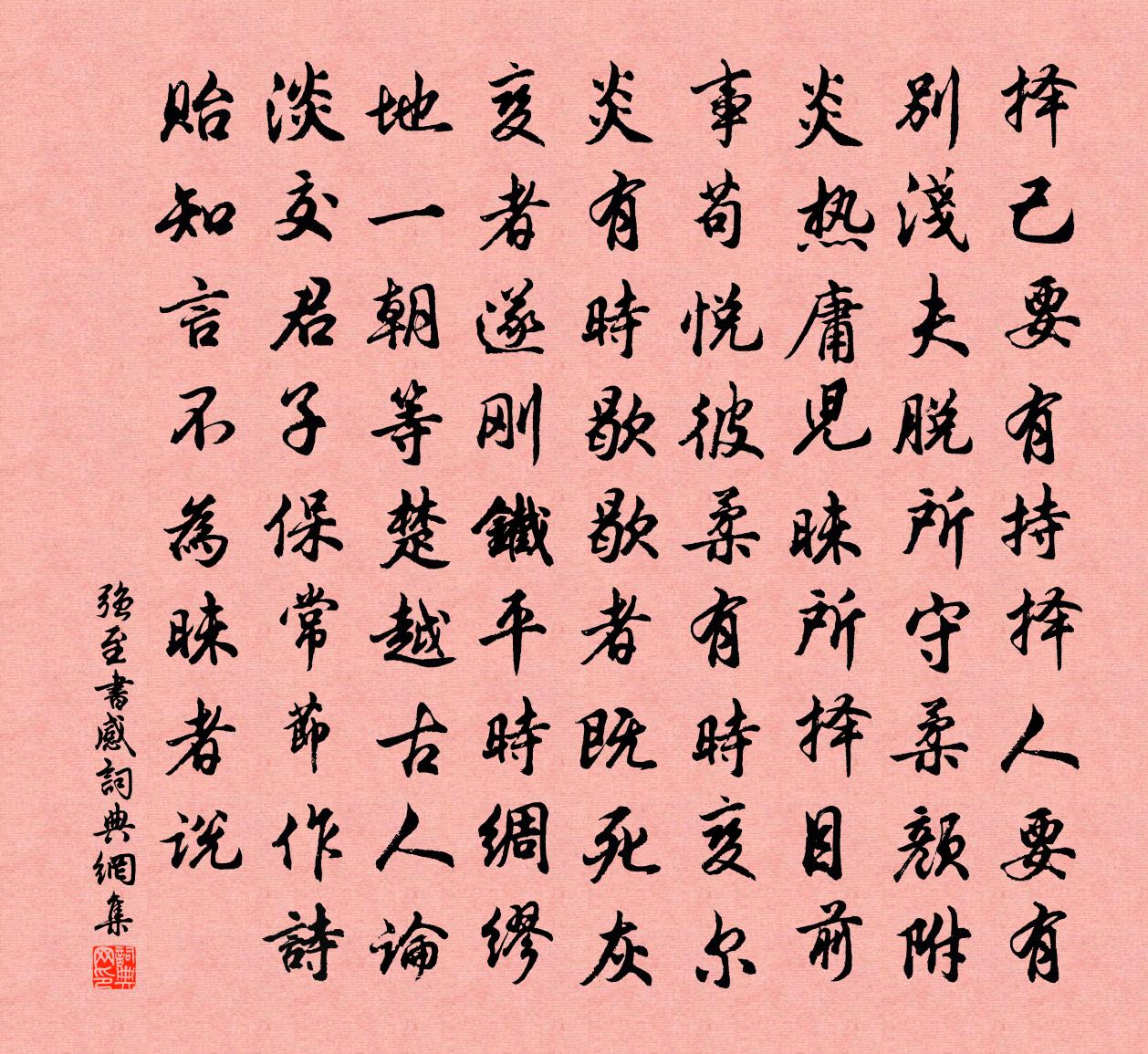 詩詞名句歷史字典書法欣賞書法字典國語詞典說文解字康熙字典古漢語字典標 題 作 者 詩 句 書感作者:強至 朝代:宋代書感原文擇己要有持,擇人要有別。淺夫脫所守,柔顏附炎熱。庸兒昧所擇,目前事苟悅。彼柔有時變,爾炎有時歇。歇者既死灰,變者遂剛鐵。平時綢繆地,一朝等楚越。古人論淡交,君子保常節。作詩貽知言,不為昧者說。詩詞問答問:書感的作者是誰?答:強至問:書感寫於哪個朝代?答:宋代強至書感書法欣賞書感書法作品詩詞推薦鄖上送韋司士歸上都舊業(司士即鄭公之孫頃客於鄖上)劉長卿〔唐代〕前朝舊業想遺塵,今 * 鄉獨爾身。鄖地國除為過客,杜陵家在有何人。蒼苔白露生三徑,古木寒蟬滿四鄰。西去紹興親享明堂二十六首佚名〔宋代〕展牲登俎,簫韶在庭。羞陳五室,意入三靈。匪物斯享,惟誠則馨。永作祭主,神其億寧。行香聞杜鵑樓鑰〔宋代〕牆西綠樹杜鵑聲,老我何堪側耳聽。我自賦歸歸不得,不須苦語更丁寧。連雨中買歸舟曹彥約〔宋代〕泛菊囊萸事已休,光陰無腳駛如流。更無出入消磨雨,只有悲涼斷送秋。戴屋未停持繖手,買舟先辨打篷頭。懸知少年游(渝州席上和韻·般涉調)張先〔宋代〕聽歌持酒且休行。雲樹幾程程。眼看檐牙,手搓花蕊,未必兩無情。拓夫灘上聞新雁,離袖掩盈盈。此恨無窮,遠迷神引朱雍〔宋代〕白玉樓高雲光繞。望極新蟾同照。前村暮雪,霽梅林道。澗風平,波聲渺。喜登眺。疏影寒枝顫,太春早。臨水凝觀化十五首黃庭堅〔宋代〕風煙漠漠半陰晴,人道春歸不見形。嫩草已侵水面綠,平蕪還破燒痕青。頌古四十五首釋如珙〔宋代〕廓然無聖真實語,對朕者誰心未息。本光燦爛照十方,無量劫來到今日。首春九日壽溪三絕劉克莊〔宋代〕陶子經丘又尋壑,龐公上塚亦攜家。可憐春事今年早,落盡桃花落杏花。觀天邵雍〔宋代〕千里南山對華山,二山中有修□□。□時禾黍交搔□,□靜禽魚相與閒。好景盡□□揚外,虛名不顯落□□。□□鳥白居易〔唐代〕誰道群生性命微?一般骨肉一般皮。勸君莫打枝頭鳥,子在巢中望母歸。靜坐對茶花偶作曹彥約〔宋代〕菊後侮前冷落時,剪檀雕蠟酷為肌。人從老處親平淡,花向無中補闕虧。地暖不憂春近遠,窗空惟映月參差。病夫游烏石寺曾豐〔宋代〕縹緲崖懸屋,崢嶸{左木右央}亘天。我疑家玉帝,誰道宅金仙。鐘鼓風雷上,星辰燈火前。眼高胸次大,沙界眇句元絳〔宋代〕笙歌車馬東方曉,風月山川北固涼。頌古一百則釋正覺〔宋代〕斫斷老葛藤,打破狐窠窟。豹披霧而變文,龍乘雷而換骨。咄,起滅紛紛是何物。聞哭者白居易〔唐代〕昨日南鄰哭,哭聲一何苦。雲是妻哭夫,夫年二十五。今朝北里哭,哭聲又何切。雲是母哭兒,兒年十七八。四鄰乙巳十月朔開爐三首范成大〔宋代〕石湖今日開爐,紙窗銀白新糊。童子燒紅榾柮,老翁睡暖氍毹。菩薩蠻舒亶〔宋代〕樓前流水西江道。江頭水落芙蓉老。畫鼓疊涼波。憑欄顰翠娥。當年金馬客。青鬢蘆花色。把酒感秋蓬。驪歌半醉水龍吟 為王少傅壽張野〔元代〕畫堂佳氣蔥蔥,玉梅迎臘香初度。人生可慶,官居極品,年登上壽。一代風流,三公儀范,四朝耆舊。算世間除卻和李秀才邊庭四時怨盧汝弼〔唐代〕春風昨夜到榆關,故國煙花想已殘。少婦不知歸不得,朝朝應上望夫山。盧龍塞外草初肥,雁乳平蕪曉不飛。鄉國名句推薦君看六幅南朝事,老木寒雲滿故城。韋莊《金陵圖》 笙歌散後酒初醒,深院月斜人靜。司馬光《西江月·寶髻松松挽就》 爾我同心,曰金蘭;朋友相資,日麗澤。程登吉《幼學瓊林·卷二·朋友賓主》 凡庸之性,後夫多寵前夫之孤,後妻必虐前妻之子。顏之推《顏氏家訓·後娶篇》 微陽下喬木,遠色隱秋山。馬戴《落日悵望》 但見淚痕濕,不知心恨誰。李白《怨情》 送君九月交河北,雪裡題詩淚滿衣。岑參《送崔子還京》 心有疑,隨札記。就人問,求確義。李毓秀《弟子規·餘力學文》 一言既出,駟馬難追。佚名《增廣賢文·上集》 獨自淒涼還自遣,自製離愁。龔自珍《浪淘沙·寫夢》
