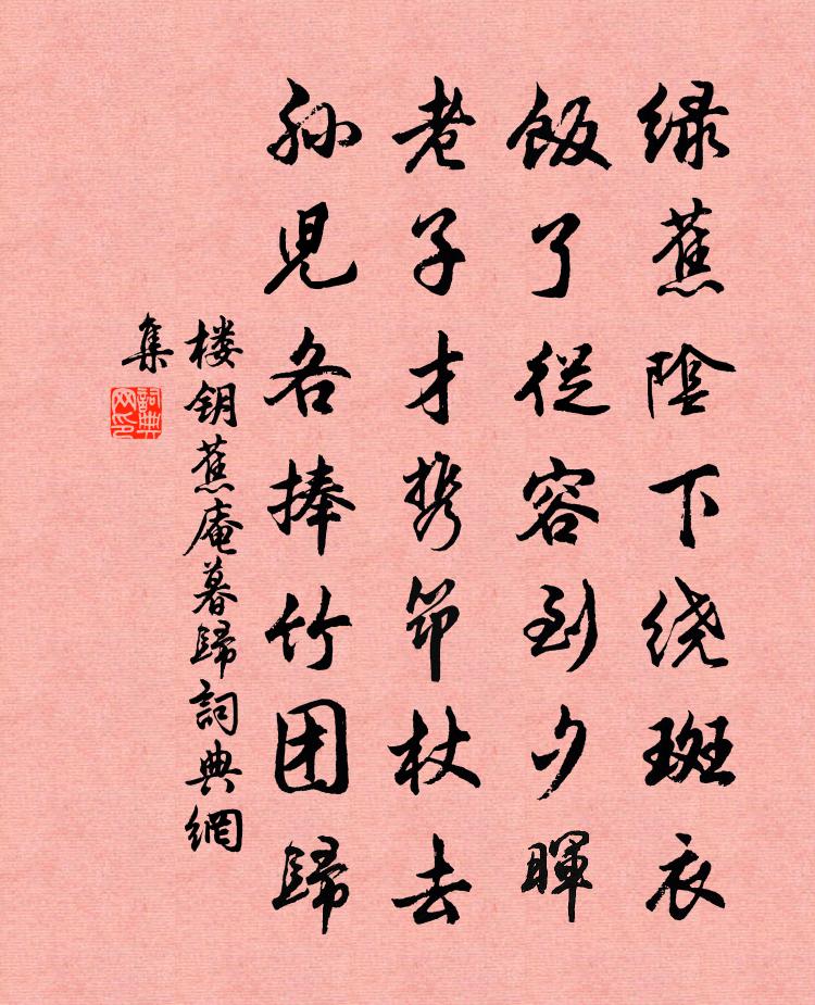 詩詞名句歷史字典書法欣賞書法字典國語詞典說文解字康熙字典古漢語字典標 題 作 者 詩 句 蕉庵暮歸作者:樓鑰 朝代:宋代蕉庵暮歸原文綠蕉陰下繞斑衣,飯了從容到夕暉。老子才攜筇杖去,孫兒各捧竹團歸。詩詞問答問:蕉庵暮歸的作者是誰?答:樓鑰問:蕉庵暮歸寫於哪個朝代?答:宋代樓鑰蕉庵暮歸書法欣賞蕉庵暮歸書法作品詩詞推薦明發房溪二首楊萬里〔宋代〕 * 十分晴,轎上蕭蕭忽雨聲。卻是松梢霜水落,雨聲那得此聲清。同周湛二上人游西湖之北山天竺晚歸得十絕釋紹嵩〔宋代〕天竺橫分景色寬,園林初日破朝寒。興闌欲下山腰去,野徑縈乃路百盤。學易齋章粲〔宋代〕天目鑒孤明,地籟奠眾響。慮淡世欲輕,性復道心長。斂襟步前庭,手執周易往。得知三畫初,真契貫穹壞。圖書依韻和原甫對月見邀不至梅堯臣〔宋代〕每愛孔北海,樽中常不空。今無酒與客,唯有月兼風。遠色曾何隔,微涼亦已同。更期三五夕,靜坐接談叢。長安上巳日對雨憶杭州強至〔宋代〕三月吾鄉三日盛,一春盛事一時傳。山花迎笑探芳騎,水鳥驚飛張樂船。今對清樽看細雨,更搔短髮數流年。曲江壽大丞相安晚先生陳起〔宋代〕嵯峨補陀山,下視海水流。風波定以梢,穩穩濟川舟。皇穹佑炎祚,黍稌慶有秋。繄誰致此祥,上相今伊周。赫赫郡中即事書懷楊億〔宋代〕海隅為郡真卑屑,簿領沉迷箠楚喧。王事更逾星火急,吏曹何啻米鹽煩。甘棠聽訟曾無倦,丹筆書刑幸不冤。境上沁園春李曾伯〔宋代〕軒冕儻來,功名杯水,行藏依樓。把方略評梅,工夫課柳,精神伴鶴,談笑盟鷗。草檄尋樵,移文問釣,任江上東江山道中趙蕃〔宋代〕蕭蕭風雨急還休,無數倉官立道同。多少詩情渾漫興,煙雲不隔四山秋。【雙調】一綻銀佚名〔元代〕昨日東周今日秦,舊冢新墳。轉首三年一閏,抱官囚痴人。 座上花枝袖裡金,朋盍簪。不醉青春圖甚?再難來挽潛齋王樞相王柏〔宋代〕總角思先友,同宗麗澤傳。典刑諸老盡,文獻舊家全。交道從公晚,知音去我先。淵源誰與遡,愁絕伯牙弦。送沈商卿知府入覲二首袁說友〔宋代〕檣烏猛作朝天去,君到長安著腳初。若訪西湖問西子,朋游應亦念其餘。晚晴姜特立〔宋代〕晚晴返照射高櫨,不覺煩襟氣一蘇。欲問明朝天色好,請看空際兩浮圖。許市罩魚周弼〔宋代〕網邊分得尾纖纖,腥卻蓴絲莫厭嫌。自有野人相料理,柳陰茅店一包鹽。過澶州感事李復〔宋代〕孫村黃河決北流,北使年年過澶州。澶州兩城戰格盡,七十餘年廢不修。昔歲契丹傾國起,欲投馬箠渡河水。烽火句林楚才〔唐代〕身閒不恨辭官早,詩好常甘得句遲。句錢惟演〔宋代〕已回鄰面三年粉,又結寒絲幾繭冰。矮齋雜詠二十首嘲染鬢者華岳〔宋代〕萬事關心兩鬢秋,柳灰何用苦文羞。無情霜雪催年少,閒似青山猶白頭。至尉氏張說〔唐代〕夕次阮公台,嘯歌臨爽塏。高名安足賴,故物今皆改。吾兄昔茲邑,遺愛稱賢宰。桑中雉未飛,屋上烏猶在。途逢送黃景聲秘丞提舉浙西樓鑰〔宋代〕論詩才了便談禪,鄙吝冰消更豁然。稽首心空先及第,敢將癸未論同年。名句推薦驪山語罷清宵半,淚雨霖鈴終不怨。納蘭性德《木蘭詞·擬古決絕詞柬友》 春雪滿空來,觸處似花開。東方虬《春雪》 海棠不惜胭脂色,獨立濛濛細雨中。陳與義《春寒》 寵柳嬌花寒食近,種種惱人天氣。李清照《念奴嬌·春情》 誰料同心結不成,翻就相思結。夏完淳《卜運算元·秋色到空閨》 舉頭望雲林,愧聽慧鳥語。王冕《墨萱圖·其一》 垂死病中驚坐起,暗風吹雨入寒窗元稹《聞樂天授江州司馬》 得眾而不得其心,則與獨行者同實。管仲《管子·參患》 無言獨上西樓,月如鉤。寂寞梧桐深院鎖清秋。李煜《相見歡·無言獨上西樓》 素衣莫起風塵嘆,猶及清明可到家。陸游《臨安春雨初霽》