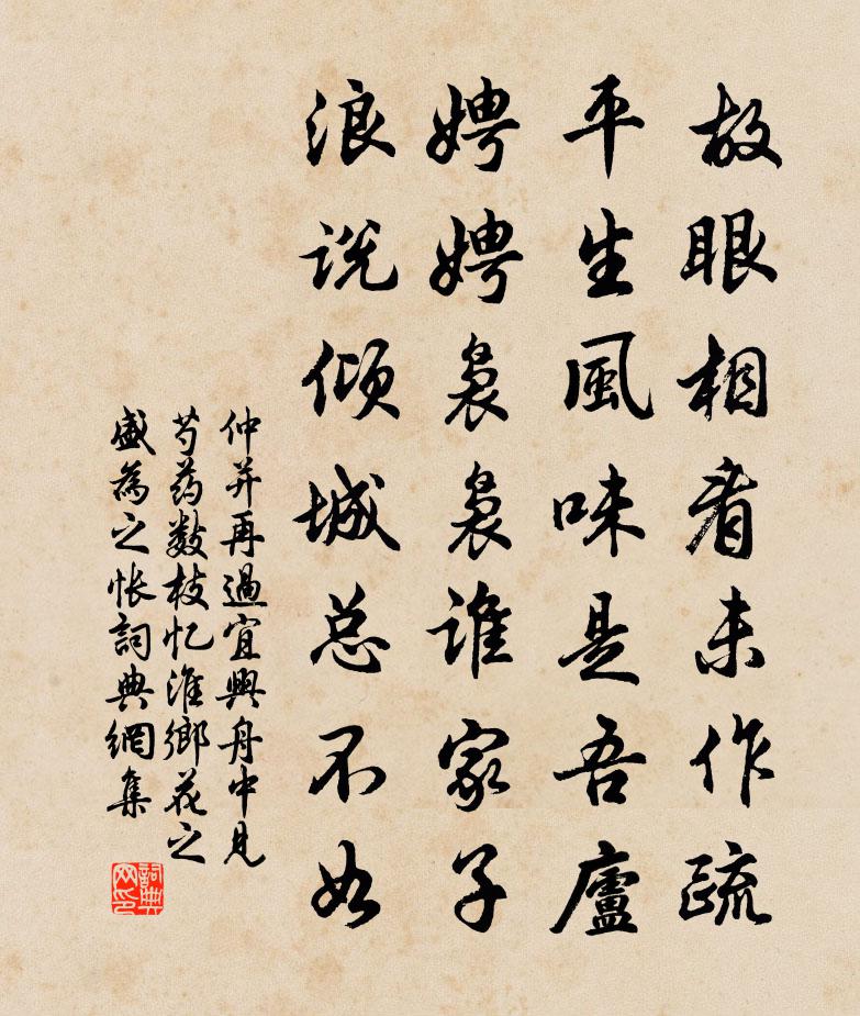 詩詞名句歷史字典書法欣賞書法字典國語詞典說文解字康熙字典古漢語字典標 題 作 者 詩 句 再過宜興舟中見芍藥數枝憶淮鄉花之盛為之悵作者:仲並 朝代:宋代原文故眼相看未作疏,平生風味是吾廬。娉娉裊裊誰家子,浪說傾城總不如。詩詞問答問:《再過宜興舟中見芍藥數枝憶淮鄉花之盛為之悵》的作者是誰?答:仲並問:該詩寫於哪個朝代?答:宋代書法欣賞再過宜興舟中見芍藥數枝憶淮鄉花之盛為之悵書法作品詩文賞析【原題】:再過宜興舟中見芍藥數枝憶淮鄉花之盛為之悵然輒成三絕詩詞推薦漢宮詞司馬光〔宋代〕苜蓿花猶短,昌蒲葉未齊。更衣過柏谷,走馬宿棠黎。逆旅聊懷璽,田間共門雞。猶思飲雲露,高舉出虹蜺。秋閨邵士彥〔唐代〕斜日空庭暮,幽閨積恨盈。細風吹帳冷,微月度窗明。怨坐啼相續,愁眠夢不成。調琴欲有弄,畏作斷腸聲。山中雜興 十四王冕〔元代〕溝塍通謝墅,禹穴近龍宮。兩水沿平地,諸山在下風。煙霞時出沒,日月互西東。閒看桃源記,吾將此意同。送王仙麓使君赴道州暫歸三山仇遠〔宋代〕家山小為離支留,征斾催行莫待秋。應有矮奴騎竹馬,相隨迓吏拜蘭舟。舜山如畫當樓見,楚水浮香繞郡流。念我醉歌陸游〔宋代〕卻日莫揮戈,君當聽我歌。花殘狂有限,酒熟悶無多。生理憑長鑱,幽情寄短蓑。江湖秋萬里,未死且婆娑。魏元履國錄挽章二首呂祖謙〔宋代〕 * 見天子,拜疏不知休。落落山林氣,拳拳畎畝憂。極知千載遇,政用一身酬。繞舍閩溪水,朝宗日夜流。題故居翁承贊〔唐代〕一為鵝子二連花,三望青湖四石斜。惟有嶺湖居第五,山前卻是宰臣家。安樂廟頭楊萬里〔宋代〕誰遣詩家酷愛山,愛山說得口瀾翻。千峰萬嶺爭投奔,一陟三休卻倦煩。堆案滿前何處著,枯腸飽後豈能餐。殘嵐十拍子/破陣子馬子嚴〔宋代〕點綴莫窺天巧,名稱卻道人為。香醞蜜脾分幾點,色映烏雲倚一枝。遙看步賞遲。映水不嫌疏影,嬌春也自同時。劍客行陸游〔宋代〕世無知劍人,太阿混凡鐵。至寶棄泥沙,光景終不滅。一朝斬長鯨,海水赤三月。隱見天地間,變化豈易測。國家水調歌頭(冬至)汪宗臣〔宋代〕候應黃鐘動,吹出白葭灰。五雲重壓頭,潛蟄地中雷。莫道希聲妙寂,嶰竹雄鳴合鳳,九寸律初裁。欲識天心處,遠遊羅椅〔宋代〕因夢吳雲賦遠遊,江花扶柁水悠悠。半輪月散千山影,一葉舟勝萬斛愁。天氣漸於寒食近,春風祗到牡丹休。水程呂城謁祖廟孫邦〔宋代〕吾祖持兵鎮此都,投身九死定全吳。一朝流矢中眸子,千載忠魂列霸圖。墓木但遺楓合抱,廟庭還有像完軀。英雄次韻智叔三首張耒〔宋代〕今朝一見詩人詩,不用更尋黃絹詞。深山一鶴自唱和,亦有松下童子知。除夜用前韻陳傅良〔宋代〕又添犬馬齒,常恐牛羊夕。牙無數株牢,鬢已太半白。六朝貴人家,珊瑚高數尺。復有陵巴豪,沃壤動連陌。居然小憩土坊鎮新店,進退格楊萬里〔宋代〕下轎逢新店,排門得小軒。中間一棐兒,相對兩 * 。椽竹青留節,檐茅白帶根。明窗有遺恨,接處紙痕班。舒員外游香山寺數日不歸,兼辱尺書,大誇勝白居易〔唐代〕香山石樓倚天開,翠屏壁立波環回。 * 繁時好客到,碧雲合處佳人來。[謂遣英、蒨二妓與舒君同游。]酡顏一賦得秋柳顧炎武〔清代〕昔日金枝間白花,只今搖落向天涯。條空不系長征馬,葉少難藏覓宿鴉。老去桓公重出塞,罷官陶令乍歸家。先皇浣溪沙·萬頃風濤不記蘇軾〔宋代〕萬頃風濤不記蘇。雪晴江上麥千車。但令人飽我愁無。翠袖倚風縈柳絮,絳唇得酒爛櫻珠。尊前呵手鑷霜須。金殿樂慢佚名〔宋代〕駕紫鸞軿。乘風縹緲遊仙。紅霓蘸影,近瑤池、鶴戲芝田。臨蕙圃、飲瓊泉。上蕭台、遙瞻九天。對真人蕊書親授名句推薦智用於眾人之所不能知,而能用於眾人之所不能見。王詡《鬼谷子·謀篇》 棘枝風哭酸,桐葉霜顏高。孟郊《秋懷十五首》 江漢曾為客,相逢每醉還。韋應物《淮上喜會梁川故人 / 淮上喜會梁州故人》 試澆橋下水,今夕到湘中。陳與義《臨江仙·高詠楚詞酬午日》 千里鶯啼綠映紅,水村山郭酒旗風。杜牧《江南春》 霜風漸欲作重陽,熠熠溪邊野菊香。蘇軾《捕蝗至浮雲嶺山行疲苶有懷子由弟二首·其二》 琵琶金翠羽,弦上黃鶯語。韋莊《菩薩蠻》 兵可千日而不用,不可 一日而不備。李大師、李延壽《南史·列傳·卷六十一》 人之命在天,國之命在禮荀子《荀子·強國》 霜風搗盡千林葉,閒倚筇枝數鸛巢。范成大《冬日田園雜興》