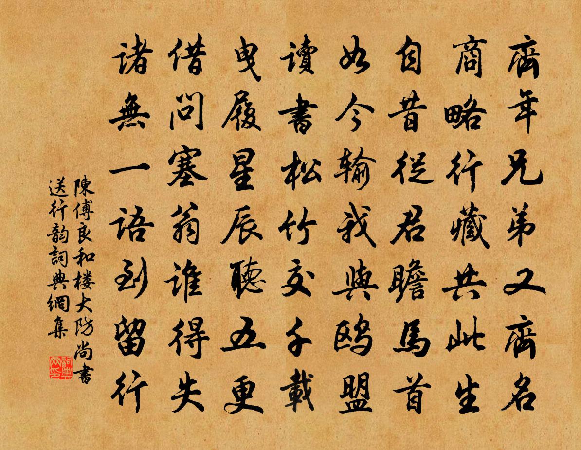 詩詞名句歷史字典書法欣賞書法字典國語詞典說文解字康熙字典古漢語字典標 題 作 者 詩 句 和樓大防尚書送行韻作者:陳傅良 朝代:宋代和樓大防尚書送行韻原文齊年兄弟又齊名,商略行藏共此生。自昔從君瞻馬首,如今輸我與鷗盟。讀書松竹交千載,曳履星辰聽五更。借問塞翁誰得失,諸無一語到留行。詩詞問答問:和樓大防尚書送行韻的作者是誰?答:陳傅良問:和樓大防尚書送行韻寫於哪個朝代?答:宋代陳傅良和樓大防尚書送行韻書法欣賞和樓大防尚書送行韻書法作品詩詞推薦秋晚晁說之〔宋代〕居恨日不過,復此秋雲暮。一歲余幾何,挽之安得住。老矣且勉學,高談非所與。貧賤苟不慚,勢力則不懼。涼飆次韻朋上人東湖精舍即事釋紹嵩〔宋代〕開徑東湖上,千岩鏡裹看。與君頻邂逅,此地久盤桓。柳影含雲幕,桃花生幕寒。婆娑弄翰墨,清興寄毫端。挽趙東岩簡叔彥侯四首王邁〔宋代〕建炎戎馬滿神京,殿撰橫身活一城。時宰忌功無表勸,老天福善自分明。人稱簪紱一門盛,公是瑛瑤間世生。珍重乳燕飛/賀新郎周密〔宋代〕波影搖漣甃。趁薰風、一舸來時,翠陰清晝。去郭軒楹才數里,蘚磴松關雲岫。快屐齒、筇枝先後。空半危亭堪聚奉和春日玩雪應制宋之問〔唐代〕北闕彤雲掩曙霞,東風吹雪舞山家。瓊章定少千人和,銀樹長芳六出花。書憤陸游〔宋代〕清汴逶迤貫舊京,宮牆春草幾番生。剖心莫寫孤臣憤,抉眼終看此虜平。天地固將容小丑,犬羊自慣瀆齊盟。蓬窗鷓鴣天佚名〔宋代〕寶炬金蓮一萬條。火龍圍輦轉州橋。月迎仙仗回三殿,風遞韻音下九霄。登復道,聽鳴鞘。再頒酥酒賜臣僚。太平雨杜甫〔唐代〕冥冥甲子雨,已度立春時。輕箑煩相向,纖絺恐自疑。煙添才有色,風引更如絲。直覺巫山暮,兼催宋玉悲。送遂寧何道士自潭湘歸蜀范成大〔宋代〕塵埃波浪幾東西,歸去丹瓢掛杖藜。戊己爐中真造化,功成分我一刀圭。書劍飄然席未溫,火雲撲地暑煙昏。山黃藤龕釋鑒〔宋代〕蘿居空未久,誰能繼其蹤。寥寥岩畔月,千古屬和公。寄考功王員外司空圖〔唐代〕喜聞三字耗,閒客是陪游。白鳥閒疏索,青山日滯留。琴如高韻稱,詩愧逸才酬。更勉匡君志,論思在獻謀。任適尉烏程梅堯臣〔宋代〕俛作程鄉尉,折腰還自甘。卞峰晴照黛,霅水曉澄藍。葑上春田辟,蘆中走吏參。到時苹葉長,柳惲在江南。四絕秦觀〔宋代〕陰風一夜攪青冥,風定霏霏霰雪零。遙想玉真清境上,白虛光里誦黃庭。千秋歲(壽)張元乾〔宋代〕相門出相,和氣濃春釀。傳家冠珮雲台上。龐眉扶壽杖。綠髮披仙氅。星兩兩。泰階已應昇平象。玉砌蘭芽長。定次韻子夷兄弟十首張耒〔宋代〕暑雨眾物成,園林粲垂實。官閒縻歲月,裨補百無一。委身作書蠹,檢性就僧律。古味雖未亡,塵埃滿琴瑟。去東陽與吏民別詩沈約〔南北朝〕微薄叨今年。忝荷非昔期。唐風豈異世。欽明重在茲。飾驂去關輔。分竹入河淇。下車如昨日。曳組忽彌朞。霜載方帥務德生朝三首黃公度〔宋代〕一別帝城今幾秋,憂時不復為身謀。枌榆故國三千里,桃李新陰四十州。談笑折衝無鼠輩,平生推轂盡清流。急面和淵明祠釋道璨〔宋代〕一寸歸心酒得知,門前官道是危機。道傍也有人歸去,不似先生真箇歸。題張子正觀察溪風亭蔡向〔宋代〕雅致園林景特奇,彩亭斜跨水淪漪。影搖碎日浮霜簟,聲觸危欄倚釣絲。岸幘不妨橫醉榻,縈眉時復度新詞。溪山雙桂橋孫應鳳〔宋代〕橋前巧匠剪春羅,橋上亭亭景物和。明夜元宵一團玉,連波還解似金波。名句推薦霜草蒼蒼蟲切切,村南村北行人絕。白居易《村夜》 至鷺鷥林,則雪深泥滑,不得前矣。辛棄疾《賀新郎·把酒長亭說》 念天地之悠悠,獨愴然而涕下。陳子昂《登幽州台歌》 知之者不如行之者,行之者不如安之者。王通《中說·卷六·禮樂篇》 半煙半雨溪橋畔,漁翁醉著無人喚。黃庭堅《菩薩蠻·半煙半雨溪橋畔》 樹木何蕭瑟,北風聲正悲。曹操《苦寒行》 草草興亡休問,功名淚、欲盈掬。黃機《霜天曉角·儀真江上夜泊》 日星隱曜,山嶽潛形;范仲淹《岳陽樓記》 夜合花開香滿庭,夜深微雨醉初醒。竇叔向《夏夜宿表兄話舊》 來掃千山雪,歸留萬國花。袁枚《春風》