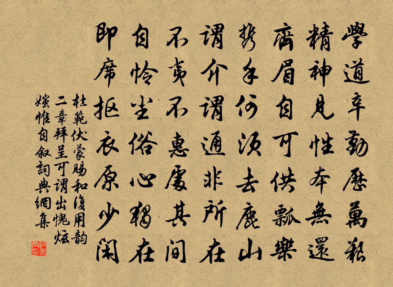 詩詞名句歷史字典書法欣賞書法字典國語詞典說文解字康熙字典古漢語字典標 題 作 者 詩 句 伏蒙賜和復用韻二章拜呈可謂出愧炫媸惟自敘作者:杜范 朝代:宋代原文學道辛勤歷萬艱,精神見性本無還。齊眉自可供瓢樂,攜手何須去鹿山。謂介謂通非所在,不夷不惠處其間。自憐塵俗心獨在,即席摳衣原少閒。詩詞問答問:《伏蒙賜和復用韻二章拜呈可謂出愧炫媸惟自敘》的作者是誰?答:杜范問:該詩寫於哪個朝代?答:宋代書法欣賞伏蒙賜和復用韻二章拜呈可謂出愧炫媸惟自敘書法作品詩文賞析【原題】:伏蒙賜和復用韻二章拜呈可謂出愧炫媸惟自敘鄙懷並以見區區敬慕之意姑惟教之是所原也詩詞推薦花庵二首司馬光〔宋代〕誰謂花庵陋,徒為見者嗤。此中勝廣廈,人自不能知。題壁二首福州僧〔宋代〕當初只欲轉頭銜,轉得頭銜轉不堪。何似仁王高閣上,倚欄閒唱望江南。庚子冬至祭鼎閣差充太祝致齋於內西廊待漏院晁說之〔宋代〕至日為客昔人嘆,況乃客次在齋宮。齋宮所寓有火禁,冰食霜寢多淒風。豐屋高懸日不到,未信一陽生是中。嘗聞無題韓偓〔唐代〕小檻移燈灺,空房鎖隙塵。額波風盡日,簾影月侵晨。香辣更衣後,釵梁攏鬢新。吉音聞詭計,醉語近天真。妝好次李德充別劉長因韻吳則禮〔宋代〕懸榻有妙致,脫冠論古情。羈愁一杯盡,好句萬人驚。談塵初未厭,檣烏俄小征。遙憐柁樓底,別夜月孤明。戲贈魏十四李群玉〔唐代〕蘭浦秋來煙雨深,幾多情思在琴心。知君調得東家子,早晚和鳴入錦衾。悼林仲逸縣尉陳傅良〔宋代〕家故書千卷,生才試一斑。嘗音殊不少,筮仕獨何艱。松菊將身隱,苹蘩忽涕潸。幸哉賢玉潤,有誄不容刪。賢者之孝二百四十首趙至林同〔宋代〕莫致兒榮養,翻令父苦耕。可憐廢書泣,不忍叱牛聲。次韻杜若川春日雜興集句二首於石〔宋代〕行約青簾共一樽,牧童遙指杏花村。如今只有花含笑,悍吏催租夜打門。代古詩謝惠連〔南北朝〕客從遠方來。贈我鵠文綾。貯以相思篋。緘以同心繩。裁為親身服。著以俱寢興。別來經年歲。歡心不同凌。瀉酒和宗易賦素馨茉莉白蓮韻陳傅良〔宋代〕軒窗一日粲三英,盡室無塵眼倍明。閩粵固嘗矜絕美,風騷猶未及知名。羞將姿媚隨花譜,愛伴孤高上月評。獨恨寄毛都官張伯玉〔宋代〕寄問副車毛國鎮,別來風味久如何。蓬萊閣上誰同飲,宛委山前幾番歌。應向蘭亭摛彩筆,曾教西子畫清蛾。若還花下作字付葉柘山使者王鎡〔宋代〕花蘚層層潤石床,綠陰多處自生涼。閒將筆染茶醾露,寫得春辭滿紙香。病中散步六絕岳珂〔宋代〕池上荷花綠淨時,岸頭楊柳插天垂。倦翁縱步聊行散,早有龜魚聖得知。丹陽湖阻風二首王之道〔宋代〕老去心猶壯,詩成喜欲顛。時危思報主,窮極待呼天。歸夢先湖外,離情到酒邊。晚來風更惡,舟臥不成眠。偈頌七十八首釋正覺〔宋代〕十五日已前,有口說不得。十五日已後,無心卻自然。正當十五日,雲籠無縫襖,花笑不萌枝。浣溪沙·紅蓼花香夾岸晏殊〔宋代〕紅蓼花香夾岸稠,綠波春水向東流。小船輕舫好追游。漁父酒醒重撥棹,鴛鴦飛去卻回頭。一杯銷盡兩眉愁。水調歌頭 文卿提刑自陝西按察改授河東,其王惲〔元代〕樂府水調歌頭,以答雅意一峰華不注,東望雨冥冥。黃雲畫角,回首客舍又幽并。喜按西來佳耗,聞道東山未老,與謬栓法同行口占分水嶺詩駱羅憲〔宋代〕山路相隨步步高,忘懷攜手上嵯峨。掀髯長嘯青雲去,回首躋攀有許勞。浩初上人見貽絕句欲登仙人山因以酬之柳宗元〔唐代〕珠樹玲瓏隔翠微,病來方外事多違。仙山不屬分符客,一任凌空錫杖飛。名句推薦何處合成愁。吳文英《唐多令·惜別》 守分安命,順時聽天。朱柏廬《朱子家訓·全文》 悲吟雨雪動林木,放書輟劍思高堂。李白《留別於十一兄逖裴十三游塞垣》 春如舊。人空瘦。淚痕紅浥鮫綃透。陸游《釵頭鳳·紅酥手》 向來吟秀句,不覺已鳴鴉。韓翃《酬程延秋夜即事見贈》 心之憂危,若蹈虎尾,涉於春冰。佚名《尚書·周書·君牙》 溪深古雪在,石斷寒泉流。李白《尋高鳳石門山中元丹丘》 團扇不搖風自舉,盈盈翠竹,纖纖白薴,不受些兒暑。文徵明《青玉案·庭下石榴花亂吐》 雙飛燕子幾時回?夾岸桃花蘸水開。徐俯《春遊湖》 溫故,而知新,敦厚以崇禮。子思《中庸·第二十七章》