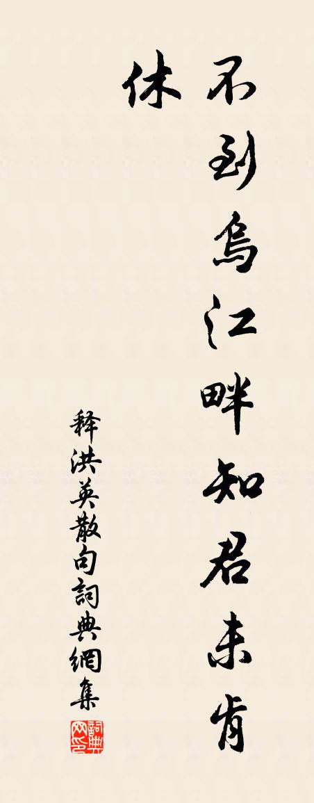 詩詞名句歷史字典書法欣賞書法字典國語詞典說文解字康熙字典古漢語字典標 題 作 者 詩 句 句作者:釋洪英 朝代:宋代句原文不到烏江畔,知君未肯休。詩詞問答問:句的作者是誰?答:釋洪英問:句寫於哪個朝代?答:宋代釋洪英句書法欣賞句書法作品詩詞推薦鎖窗寒(簾下)曾隸〔宋代〕繡額雲橫,銀鉤月小,綠楊庭院。疏明滿幅,永晝未忺高卷。愛空紋、巧勻曲波,弄晴日色花陰轉。任篩金影碎,去歲與子野遊逍遙堂日欲沒因並西山叩羅浮道蘇軾〔宋代〕往歲追歡地,寒窗夢不成。笑談驚半夜,風雨暗長檠。雞唱山椒曉,鐘鳴霜外聲。只今那復見,仿佛似三生。曼倩辭李商隱〔唐代〕十八年來墮世間,瑤池歸夢碧桃閒。如何漢殿穿針夜,又向窗中覷阿環。連雨書事陳與義〔宋代〕寒入薪芻價,連天兩眼愁。生涯赤藤杖,契分黑貂裘。烏鵲無言暮,蓬蒿滿意秋。同時不同味,世事劇悠悠。感秋五首楊萬里〔宋代〕昨扇猶午攜,今裳覺晨單。起來且復臥,未敢窺柴關。不知病至此,為復老使然。平生性剛燥,畏熱長喜寒。念昔步月文同〔宋代〕掩卷下中庭,月色浩如水。秋氣涼滿襟,松陰密鋪地。百蟲催夜去,一雁領寒起。靜念忘世紛,誰同此佳味。南坡口號十八首鄭清之〔宋代〕紅紅白白共枝榮,怪底山茶有寧馨。倩得司花來判斷,不妨一姓養螟蛉。哭中山公三十韻宋祁〔宋代〕天欲鳴文鐸,公先露上珍。談鋒貫千載,文緯補三辰。海浪扶鵬徙,雝朝簉鷺振。盪邪初奏雅,闢路近還淳。汗竹經費拾遺舊隱胡駢〔唐代〕林下茅齋已半傾,九華幽徑少人行。不將冠劍為榮事,只向煙蘿寄此生。松竹漸荒池上色,琴書徒立世間名。白楊和柳公權登齊雲樓白居易〔唐代〕樓外春晴百鳥鳴,樓中春酒美人傾。路旁花日添衣色,雲里天風散珮聲。向此高吟誰得意,偶來閒客獨多情。佳時開先瀑布蔣士銓〔清代〕瀑布之水源何來。劃然下裂長峰開。下士目駭自天落。絕頂乃有千盤迴。青山斷缺聳雙劍,元氣直瀉岩頭摧。飛流酬歐陽秀才卷齊己〔唐代〕三十篇多十九章,□聲風力撼疏篁。不堪更有精搜處,誰見蕭蕭雨夜堂。送趙君十絕汪莘〔宋代〕醉把金鞭度綠楊,軍民夾道笛聲長。紅旗千面詩千首,半雜風雲入建章。避暑趙友直〔宋代〕寰區皆是火,何地避炎官。散發鬆陰下,掛巾石壁間。詩題疏竹潤,酒入碧筒寒。不必頻揮羽,清風無汗顏。尋陳處士山堂劉得仁〔唐代〕步溪凡幾轉,始得見幽蹤。路隱千根樹,門開萬仞峰。片雲生石竇,淺水臥枯松。窮谷風光冷,深山翠碧濃。鶴看送友人周賀〔唐代〕彈琴多去情,浮楫背潮行。人望豐壖宿,蟲依蠹木鳴。檣煙離浦色,蘆雨入船聲。如疾登雲路,憑君寄此生。偈頌一百五十首釋心月〔宋代〕至人無已,言猶在耳。萬法作本根,天地相終始。一占帝與九齡夢,三聽山呼萬歲聲。苦熱和袁應祥用韋蘇州喬木生夏涼流雲吐華月郭印〔宋代〕倚杖長松底,無風晝自涼。吾廬傍林壑,嘉木聳千章。念奴嬌(題釣台)王自中〔宋代〕扁舟夜泛,向子陵台下,偃帆收櫓。水闊風搖舟不定。依約月華新吐。細酌清泉,痛澆塵臆,喚起先生語。當年綸白溝范成大〔宋代〕高陵深谷變遷中,佛劫仙塵事事空。一水涓流獨如帶,天應留作漢提封。名句推薦歡宴良宵好月,佳人修竹清風。吳文英《風入松·麓翁園堂宴客》 四十年來家國,三千里地山河李煜《破陣子·四十年來家國》 別離在今晨,見爾當何秋。韋應物《送楊氏女》 雲收雨過波添,樓高水冷瓜甜,綠樹陰垂畫檐。白樸《天淨沙·夏》 白日何短短,百年苦易滿。李白《短歌行》 日中則移,月滿則虧。劉向《戰國策·秦三·蔡澤見逐於趙》 閒倚博山長嘆,淚流沾皓腕。韋莊《歸國遙·春欲晚》 莫道桑榆晚,為霞尚滿天。劉禹錫《酬樂天詠老見示》 好言難得,惡語易施。佚名《增廣賢文·上集》 寵辱不驚,閒看庭前花開花落;去留無意,漫隨天外雲捲雲舒。陳繼儒《小窗幽記·集景篇》