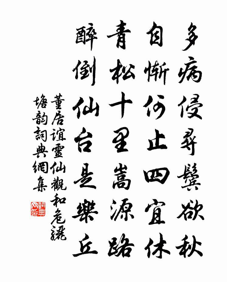 詩詞名句歷史字典書法欣賞書法字典國語詞典說文解字康熙字典古漢語字典標 題 作 者 詩 句 靈仙觀和危驪塘韻作者:董居誼 朝代:宋代靈仙觀和危驪塘韻原文多病侵尋鬢欲秋,自慚何止四宜休。青松十里嵩源路,醉倒仙台是樂丘。詩詞問答問:靈仙觀和危驪塘韻的作者是誰?答:董居誼問:靈仙觀和危驪塘韻寫於哪個朝代?答:宋代董居誼靈仙觀和危驪塘韻書法欣賞靈仙觀和危驪塘韻書法作品詩詞推薦比干墓徐彥伯〔唐代〕大位天下寶,維賢國之鎮。殷道微而在,受辛纂頹胤。山鳴鬼又哭,地裂川亦震。媟黷皆佞諛,虔劉盡英雋。孤卿石港文天祥〔宋代〕王陽真畏道,季路漸知津。山鳥喚醒客,海風吹黑人。乾坤萬里夢,煙雨一年春。起看扶桑曉,紅黃六六鱗。熱海行,送崔侍御還京岑參〔唐代〕側聞陰山胡兒語,西頭熱海水如煮。海上眾鳥不敢飛,中有鯉魚長且肥。岸傍青草常不歇,空中白雪遙旋滅。蒸沙聞杵詹初〔宋代〕靜夜無人語,何處送杵聲。米以杵而出,杵以多而精。小事尚如此,況於吾性成。所以古聖賢,寢食不遑寧。上巳日雁叉阻風呈宋彥起一首王阮〔宋代〕往來定是一年一,時節長逢三月三。天氣未佳宜且住,樹猶如此我何堪。花飛與客渾無與,酒好招人只自慚。安得漁家孫承宗〔明代〕呵凍提篙手未蘇,滿船涼月雪模糊。畫家不識漁家苦,好作寒江釣雪圖。楊柳枝劉禹錫〔唐代〕鳳闕輕遮翡翠幃,龍墀遙望□塵生。御溝春水相輝映,狂殺長安年少兒。夏夜月下獨酌二首楊萬里〔宋代〕誰道今年熱,今宵分外清。竹風秋九夏,溪月書三更。此景天慳與,無人酒自傾。明朝火織上,別作一經營。唐懿仲諸公見過,小飲凌寒殘梅之下二絕范成大〔宋代〕問人何處是花蹊,香玉勻鋪不見泥。莫怪山翁行步澀,更無空處著枯藜。次韻酬孫艮齋三首楊公遠〔宋代〕抱膝孤吟欠范模,原隨雞犬藉丹爐。儻能化得塵凡骨,差勝無聲水墨圖。雜詠一百首嚴光劉克莊〔宋代〕幸自沉冥去,無端物色求。蓑衣亦堪釣,何必被羊裘。山行王安石〔宋代〕出寫清淺景,歸穿蒼翠陰。平頭均楚制,長耳嗣吳吟。暮嶺已佳色,寒泉仍好音。誰同此真意,倦鳥亦幽尋。小圃有雙蓮夏芙蓉之喜文字祥也各賦一詩為宗劉克莊〔宋代〕四月池邊見拒霜,園丁驚問此何祥。花如雲錦翻新樣,葉似宮袍染御香。病不能陪花酒伴,詩猶堪譟鼓旗傍,諸君寄龍井辯才法師三絕蘇轍〔宋代〕山色青冥葉未紅,湖光凝碧曉無風。行窮上下兩天竺,望斷南山龍井龍。游石子澗歐陽修〔宋代〕◇嶭高亭古澗隈,偶攜嘉客共徘徊。席間風起聞天籟,雨後山光入酒杯。泉落斷崖舂壑響,花藏深崦過春開。麏◇題武夷五首白玉蟾〔宋代〕顯道真人去不回,幔亭不見舊樓台。曾孫倚著寒松立,日落風悲猿自哀。江城子蘇軾〔宋代〕前瞻馬耳九仙山。碧連天。晚雲閒。城上高台,真箇是超然。莫使匆匆雲雨散,今夜裡,月嬋娟。小溪鷗鷺靜聯拳歲晚苦寒方乾〔唐代〕地氣寒不暢,嚴風無定時。挑燈青燼少,呵筆尺書遲。白兔沒已久,晨雞僵未知。佇看開聖歷,喧煦立為期。木蘭花(海棠·三之二·林鐘商)柳永〔宋代〕東風催露千嬌面。欲綻紅深開處淺。日高梳洗甚時忄欠,點滴燕脂勻未遍。霏微雨罷殘陽院。洗出都城新錦段。美春情佚名〔唐代〕畫閣餘寒在,新年舊燕歸。梅花猶帶雪,未得試春衣。名句推薦念歸林葉換,愁坐露華生。張九齡《西江夜行》 杜鵑再拜憂天淚,精衛無窮填海心。黃遵憲《贈梁任父母同年 / 題梁任父同年》 一沐三捉髮,一飯三吐哺。司馬遷《史記·魯周公世家》 城裡夕陽城外雪,相將十里異陰晴。王守仁《次韻陸僉憲元日春晴》 勝地不常,盛筵難再;蘭亭已矣,梓澤丘墟。王勃《滕王閣序》 唯燒蒿棘火,愁坐夜待晨白居易《村居苦寒》 花開紅樹亂鶯啼,草長平湖白鷺飛。徐元傑《湖上》 晻靄寒氛萬里凝,闌乾陰崖千丈冰。岑參《天山雪歌送蕭治歸京》 長堤春水綠悠悠,畎入漳河一道流。王之渙《宴詞》 寸寸微雲,絲絲殘照,有無明滅難消。賀雙卿《鳳凰台上憶 * ·寸寸微雲》