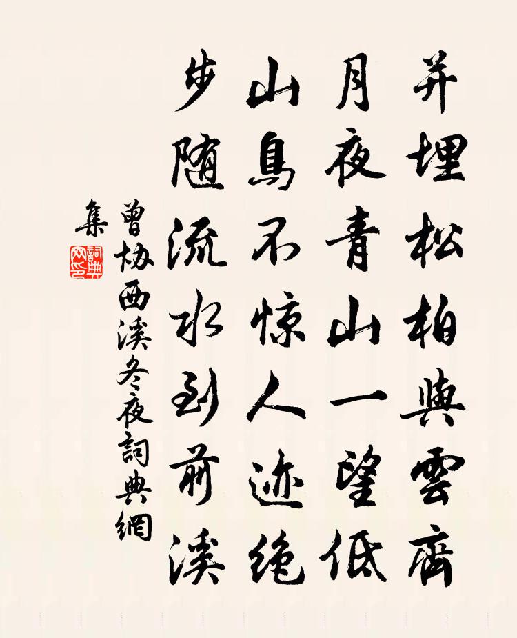 詩詞名句歷史字典書法欣賞書法字典國語詞典說文解字康熙字典古漢語字典標 題 作 者 詩 句 西溪冬夜作者:曾協 朝代:宋代西溪冬夜原文並埋松柏與雲齊,月夜青山一望低。山鳥不驚人跡絕,步隨流水到前溪。詩詞問答問:西溪冬夜的作者是誰?答:曾協問:西溪冬夜寫於哪個朝代?答:宋代曾協西溪冬夜書法欣賞西溪冬夜書法作品詩詞推薦菩薩蠻(秋)朱淑真〔宋代〕秋聲乍起梧桐落,蛩吟唧唧添蕭索。欹枕背燈眠,月和殘夢圓。起來鉤翠箔,何處寒砧作。獨倚小闌乾,逼人風露謁金門沈端節〔宋代〕春欲去。人瘦不勝金縷。門巷陰陰飛絮舞。斷腸雙燕語。孤坐晚窗閒處。月 * 亭午。寒色著人無意緒。竹鳴風更漏子溫庭筠〔唐代〕相見稀,相憶久,眉淺澹煙如柳。垂翠幕,結同心,待郎熏繡衾。城上月,白如雪,蟬鬢美人愁絕。宮樹暗,鵲橋次酬胡編校賦竹屋劉黻〔宋代〕紫氣曾臨屋有光,老僧相對說修藏。貌癯漸覺衣冠古,交淡誰知道誼常。文類錦機君獨艷,才如襪線我無長。近來白珽寄詩次韻見意陳著〔宋代〕江乾風雨別,君住我來回。兩地夢相覓,十年書一來。字參老未到,詩放晚唐開。直要吟成史,掃清塵世埃。皇帝感詞盧綸〔唐代〕提劍風雷動,垂衣日月明。禁花呈瑞色,國老見星精。發棹魚先躍,窺巢鳥不驚。山呼一萬歲,直入九重城。天香自述一首蘇泂〔宋代〕春糧了朝炊,細大供十口。身窮兩腳健,天意非汝厚。前年取荊釵,頗不窺戶牖。甘心似黔婁,習氣除夙有。今年蝶戀花王安中〔宋代〕千古銅台今莫問。流水浮雲,歌舞西陵近。煙柳有情開不盡。東風約定年年信。天與麟符行樂分。帶緩球紋,雅宴句晏殊〔宋代〕紫結茱萸實,濃熏菡萏香。鹹陽縣令求清渭樓詩和何子應長句蘇籀〔宋代〕秦如蒹葭未飽霜,四維不舉空豪強。神疲鬼乏赴功利,兆自襄公終始皇。富極薰天力斡地,諸侯西來誰敢當。范雎攤破浣溪沙(潭上夜歸)劉辰翁〔宋代〕醉里微寒著面醒。天風不展帽欹傾。行過溪深松雪下,夜三更。白白野田鋪似月,E7FDE7FD沙路踏如冰。九月十日西湖席上得樂字韓維〔宋代〕秋雲淡不飛,霜水清欲落。維舟坐近浦,悲風滿衡薄。良游未為晚,佳節止在昨。湛湛觴醪醇,娜娜菊枝弱。天時秦王纜船石楊蟠〔宋代〕色陰長帶雨,疑是白雲根。欲問東巡事,今猶不敢言。田家即事舒岳祥〔宋代〕飽暖無他事,天心亦易回。繅車翻急瀑,麥磨響輕雷。履辟行泥筍,衣蒸過雨梅。荒村斷魚肉,隨興酌出杯。送陸務觀赴七閩提舉常平茶事周必大〔宋代〕漢皇親召賈生還,京路爭看北海賢。卻畏神仙足官府,便思風采爍雲煙。雜曲歌辭。太平樂王涯〔唐代〕風俗今和厚,君王在穆清。行看採花曲,儘是太階平。贈程環孔武仲〔宋代〕識盡公卿更食貧,蒼髯瘦骨走京塵。高談亦與時多忤,屢中方知術有神。前會渺茫渾不記,遠遊蕭索復相親。疑公偈頌一百六十首釋宗杲〔宋代〕夷門昔日呈家醜,拈出無邊栗棘蓬。今日甌峰孤頂替,幸然無事又相逢。月季花董嗣杲〔宋代〕謝了還開肯悟空,一年三十六旬中。相看誰有長春艷,莫道花無百日紅。酡臉倚嬌承舞雪,瘦枝扶力借柔風。四時浣溪沙 賦箏王惲〔元代〕朋*華簪醉未沾。主人張樂見厭厭。一聲銀甲裂霜縑。澗水咽冰翻隴怨,將軍出塞憶蒙恬。碧桃花底玉笙*。名句推薦名不徒生,而譽不自長。功成名遂。墨子《墨子·02章 修身》 綠波春浪滿前陂,極目連雲稏肥。韋莊《稻田》 嫩寒鎖夢因春冷,芳氣籠人是酒香。曹雪芹《紅樓夢·第五回》 江山如有待,花柳自無私。杜甫《後游》 復恐匆匆說不盡,行人臨發又開封。張籍《秋思》 今夕不登樓,一年空過秋。高觀國《菩薩蠻·何須急管吹雲暝》 別裁偽體親風雅,轉益多師是汝師。杜甫《戲為六絕句》 小娃撐小艇,偷采白蓮回。白居易《池上》 強攜酒、小橋宅,怕梨花落盡成秋色。姜夔《淡黃柳·空城曉角》 念天地之悠悠,獨愴然而涕下。陳子昂《登幽州台歌》