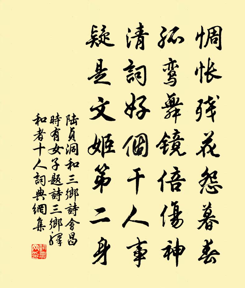 詩詞名句歷史字典書法欣賞書法字典國語詞典說文解字康熙字典古漢語字典標 題 作 者 詩 句 和三鄉詩會昌時有女子題詩三鄉驛和者十人作者:陸貞洞 朝代:唐代原文惆悵殘花怨暮春,孤鸞舞鏡倍傷神。清詞好個乾人事,疑是文姬第二身。詩詞問答問:《和三鄉詩會昌時有女子題詩三鄉驛和者十人》的作者是誰?答:陸貞洞問:該詩寫於哪個朝代?答:唐代書法欣賞和三鄉詩會昌時有女子題詩三鄉驛和者十人書法作品注釋全唐詩:卷726-1詩詞推薦過蒼梧陶弼〔宋代〕近海江聲急,孤舟下杳冥。峽泉飛暴雨,灘石走群星。水有瀟湘色,猿同巴蜀聽。令人思舜德,一望九嶷青。高宗帖陳普〔宋代〕寢苫枕乾子,有暇綰秋蛇。仁人不忍見,俗子持相夸。生查子·狂花頃刻香晏幾道〔宋代〕狂花頃刻香,晚蝶 * 意。天與短因緣,聚散常容易。傳唱入離聲,惱亂雙蛾翠。遊子不堪聞,正是衷腸事。雜興劉克莊〔宋代〕昔事先皇帝,弱羽參高翰。對揚乏鯁論,狂疏犯龍顏。台簡凜霜凝,聖度如天寬。赦於碓磨中,驅之原隰間。乘傳自法雲回過魯壚故居陸游〔宋代〕枳籬數掩閉柴扉,臼碓聲中煙火微。雪暗杜陵無雁下,雲迷遼海有人歸。耕疇且復償初願,官路那知脫駭機。更有讀長恨辭李覯〔宋代〕蜀道如天夜雨淫,亂鈴聲里倍沾襟。當時更有軍中死,自是君王不動心。喜李翰自越至劉長卿〔唐代〕南浮滄海上,萬里到吳台。久別長相憶,孤舟何處來。春風催客醉,江月向人開。羨爾無羈束,沙鷗獨不猜。省中畫屏蘆雁鄭獬〔宋代〕高堂傾動長江流,黃蘆群雁滿滄洲。掃開長安塵土窟,寫出江南煙水秋。兩雁斜飛入空闊,四雁顧慕橫沙頭。高風祈雨陸游〔宋代〕至德無私不我欺,精祈未效莫輕疑。但令葵藿勤傾向,會有風雲感會時。偈四首釋師體〔宋代〕年年浴佛在今朝,目擊迦維路不遙。果是當時曾示現,宜乎惡水驀頭澆。送葉正則秘郎參議湖北帥幕張鎡〔宋代〕桂陰無期報,朝賢去卻知。累年艱特薦,一事必憂時。盛世未應爾,重來猶可為。相過非為數,公論合勤思。瑞鶴仙(別恨)康與之〔宋代〕薄寒羅袖怯。教小玉添香,被翻宮襭。蘭缸半明滅。聽幾聲歸雁,一簾微月。情波恨葉。索新詞、猶自怨別。夢回龜山道中吳則禮〔宋代〕久著南冠殊未痴,長淮水暖鱭魚肥。更無一點蔫紅在,只有楊花作陣飛。酬安這謝光兄弟見過司馬光〔宋代〕不進一二日,不見已想思。況復閉關久,杳無攜手期。清談勝妙藥,高韻敵涼颸。愧乏機雲美,虛承青眼知。小山即事二首杜耒〔宋代〕當時嘗愛酒,此夕更登樓。月有十分好,人無一點愁。雲山開宿霧,燈火近清秋。何事太孤絕,前身是楚囚。竹徑汪炎昶〔宋代〕竹徑清入內,消得此閒行。不待鋤蒼蘚,頻來逕自成。次韻拾青軒詠竹李彌遜〔宋代〕論詩遠到二南風,句里波濤得意濃。我亦賡酬還自笑,真成魚目眩驪龍。寄飛卿魚玄機〔唐代〕階砌亂蛩鳴,庭柯煙露清。月中鄰樂響,樓上遠山明。珍簟涼風著,瑤琴寄恨生。嵇君懶書札,底物慰秋情。隔簾聽(林鐘商)柳永〔宋代〕咫尺鳳衾鴛帳,欲去無因到。蝦須窣地重門悄。認繡履頻移,洞房杳杳。強語笑。逞如簧、再三輕巧。梳妝早。琵偈釋宗演〔宋代〕一九與二九,相逢不出手。世間出世間,無剩亦無少。名句推薦藍橋何處覓雲英。只有多情流水、伴人行。蘇軾《南歌子·寓意》 隋堤上、曾見幾番,拂水飄綿送行色。周邦彥《蘭陵王·柳》 最無端處,總把良宵,只恁孤眠卻。柳永《尾犯·夜雨滴空階》 誰見汀洲上,相思愁白蘋。劉長卿《餞別王十一南遊》 重唱梅邊新度曲,催發寒梢凍蕊。吳文英《金縷歌·陪履齋先生滄浪看梅》 風雨牢愁無著處,那更寒蛩四壁。文天祥《酹江月·和友驛中言別》 志,氣之帥也。孟子《孟子·公孫丑章句上·第二節》 自古逢秋悲寂寥,我言秋日勝春朝。劉禹錫《秋詞》 紅淚偷垂,滿眼春風百事非。納蘭性德《採桑子·當時錯》 不怕三十而死,只怕死後無名。佚名《增廣賢文·下集》