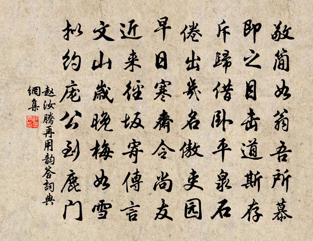 詩詞名句歷史字典書法欣賞書法字典國語詞典說文解字康熙字典古漢語字典標 題 作 者 詩 句 再用韻答作者:趙汝騰 朝代:宋代再用韻答原文敬簡如翁吾所慕,即之目擊道斯存。斥歸借臥平泉石,倦出幾名傲吏園。早日寒齋令尚友,近來徑坂寄傳言。文山歲晚梅如雪,擬約龐公到鹿門。詩詞問答問:再用韻答的作者是誰?答:趙汝騰問:再用韻答寫於哪個朝代?答:宋代趙汝騰再用韻答書法欣賞再用韻答書法作品詩詞推薦花前有感兼呈崔相公劉郎中仲並〔宋代〕落花如雪鬢如霜,醉把花看益自傷。少日為名多檢束,長年無興可顛狂。四時輪轉春常少,百刻支分夜苦長。何事敬和老人荷花洪咨夔〔宋代〕紅紅白白兩般栽,淺淺深深一氣催。但愛透從清水出,不辭脫自於泥來。隨花著蓋相依立,聚菂為房忍擘開。妙潔奉和興慶池戲競渡應制徐彥伯〔唐代〕夾道傳呼翊翠虬,天回日轉御芳洲。青潭曉靄籠仙蹕,紅嶼晴花隔彩旒。香溢金杯環廣坐,聲傳妓舸匝中流。群臣木蘭花慢·鶯啼啼不盡戴復古〔宋代〕鶯啼啼不盡,任燕語、語難通。這一點閒愁,十年不斷,惱亂春風。重來故人不見,但依然、楊柳小樓東。記得同簡道安葛天民〔宋代〕相將除夜南風起,雁已聲聲向北飛。驟暖定知為雪骨,瘦年終不似冬肥。日來病可方開酒,節下春回稍減衣。正好感時二首陳著〔宋代〕國事如今到底輸,九天難叩哭窮途。精忠無一郭中令,異志居多劉寄奴。經哨地空如大漠,逃生山險甚飛狐。回頭句王操〔宋代〕彩箋分卷碧雲薄,蠟燭對燒紅淚乾。高宗郊前朝獻景靈宮二十一首真宗〔宋代〕瑤源誕民,玉牒筆榮。覆育群有,監觀圓清。酒一既洽,登薦惟誠。無有後艱,駿惠雲仍。秋懷羅公升〔宋代〕舊日方山子,淒涼寄一簞。蟲聲來倦枕,秋思入憑欄。已是肱三折,那堪指一彈。中宵更風雨,誰念客氈寒。絕句九首張耒〔宋代〕千林黃葉總飛霜,寂歷疏梅未肯妝。誰信輪囷臥山木,心知九地有微陽。揖山閣文同〔宋代〕一問此孤高,蒼蒼欲上摩。有時臨縹緲,盡日對嵯峨。絕底秋陰重,危層晚照多。無由從隱者,空自愧雲蘿。南鄉子(九日用東坡韻)陳師道〔宋代〕晴野下田收。照影寒江落雁洲。禪榻茶爐深閉閣,颼颼。橫雨旁風不到頭。登覽卻輕酬。剩作新詩報答秋。人意自戊申年七夕五絕薛映〔宋代〕漢殿初呈楚舞時,月颱風榭鎮相隨。如何牛女佳期夕,又待鑾輿百子池。送楊侍禁赴闕時有甄先生相隨魏野〔宋代〕一種皇華覲紫宸,文資換必異常倫。隨軒已有三茅客,下榻寧無兩制人。清洛聽應移足懶,碧嵩看想轉頭頻。他時次韻劉莘老學士惜別言懷兼呈次中察院二首蘇頌〔宋代〕詩侶方逢夢與微,攄懷未盡遽言歸。正思玉鱠將登俎,應笑緇塵又染衣。金石交情知不改,輔車形體自相依。何時已亥雜詩 264龔自珍〔清代〕喜汝文無一筆平,墜儂五里霧中行。悲歡離合本如此,錯怨蛾眉解用兵。大雄寺陳朝檜葛立方〔宋代〕老檜盤拿古殿春,空庭坐閱幾朝曛。根株橫裂可尋蚊,枝葉倒垂猶拂雲。求福端同木居士,出靈那效柳將軍。黃奴中秋集鮑樓作徐璣〔宋代〕秋在湖樓正可過,扁舟窈窕逐菱歌。淡雲遮月連天白,遠水生涼入夜多。已是高人難聚會,矧逢佳節共吟喔。明朝處州葉德共輓詩項安世〔宋代〕儒服能軍事,人心以富行。邑中無惡少,堂上有佳名。死得安仁誄,生經短簿評。哀榮有如此,何必漢公卿。別留少策兼呈玉黨先生陳元晉〔宋代〕雲麓先生坐山癖,腳頭尚欠到羅浮。藏山欲作千載計,試問書成可寄不。名句推薦沙場烽火連胡月,海畔雲山擁薊城。祖詠《望薊門》 言不過行,行不過道戴聖《大戴禮記·文王官人第七十二》 一山飛峙大江邊, 躍上蔥蘢四百旋 * 《七律·登廬山》 斜風細雨不須歸。蘇軾《浣溪沙·漁父》 無有定法如來可說。鳩摩羅什譯《金剛經·無得無說》 家貧則思良妻,國亂則思良相司馬遷《史記·魏世家》 空勞縴手,解佩贈情人。牛希濟《臨江仙·柳帶搖風漢水濱》 磧里征人三十萬,一時回向月明看。李益《從軍北征》 相逢一醉是前緣,風雨散、飄然何處。蘇軾《鵲橋仙·七夕》 禍福無門,唯人所召。左丘明《左傳·襄公·襄公二十三年》