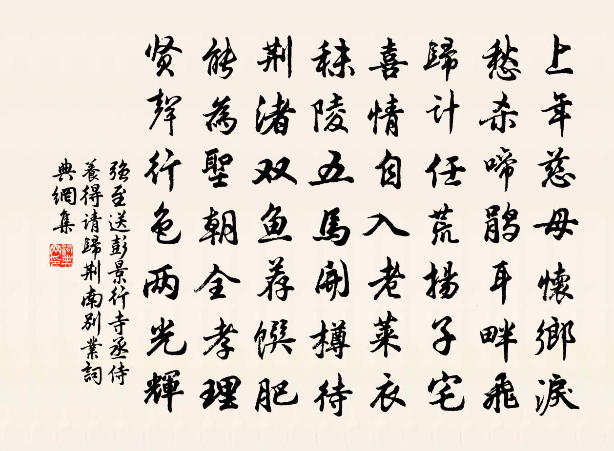 詩詞名句歷史字典書法欣賞書法字典國語詞典說文解字康熙字典古漢語字典標 題 作 者 詩 句 送彭景行寺丞侍養得請歸荊南別業作者:強至 朝代:宋代原文上年慈母懷鄉淚,愁殺啼鵑耳畔飛。歸計任荒揚子宅,喜情自入老萊衣。秣陵五馬開樽待,荊渚雙魚薦饌肥。能為聖朝全孝理,賢聲行色兩光輝。詩詞問答問:《送彭景行寺丞侍養得請歸荊南別業》的作者是誰?答:強至問:該詩寫於哪個朝代?答:宋代書法欣賞送彭景行寺丞侍養得請歸荊南別業書法作品詩詞推薦陸機宅馬之純〔宋代〕只聞二陸住華亭,卻有書堂在秣陵。如此弟兄無比擬,翕然京洛有聲稱。辨亡著論真難及,受命專征若易能。十萬楊氏謠佚名〔唐代〕男不封侯女作妃,君看女卻是門楣。答友人見寄酒韓偓〔唐代〕雖可忘憂矣,其如作病何。淋漓滿襟袖,更發楚狂歌。江行阻風黎廷瑞〔宋代〕遠涉仍多病,那堪正蘊隆。黃沙吹白浪,赤日照青楓。天地支頤內,江山散發中。一涼端足快,莫恨打頭風。【南呂】一枝花_詠喜雨用盡張養浩〔元代〕詠喜雨用盡我為民為國心,祈下些值玉值金雨。數年空盼望,一旦遂沾濡。喚省焦枯,喜萬象春如故,恨流民尚在孤山雪後高翥〔宋代〕雪後騎驢行步遲,孤山何似灞橋時。近來行輩無和靖,見說梅花不要詩。寄知來弟李石〔宋代〕霏霏寒日隕清霜,勃勃陰風出土囊。尺木未階龍久蟄,銜蘆不穩雁斜行。仕塗田舍成三已,世態江湖合兩忘。無術萬竹亭朱翌〔宋代〕氣稟元軒玉立身,露幛煙纛曉初勻。一時頓有七賢集,千畝今余萬個春。能惟風流夸後日,政緣名篆得斯人。寂寥挽董瀾溪二首王珪〔唐代〕嗜學嘗忘味,說詩堪解頤。竹林雖晚會,濠上獨深知。蘭畹無留馥,鳳巢空舊枝。停雲正愁望,橫笛未休吹。寄青城山顥禪師崔塗〔唐代〕懷師不可攀,師往杳冥間。林下誰聞法,塵中只見山。終年人不到,盡日鳥空還。曾聽無生說,應憐獨未還。過普明禪院二首宋庠〔宋代〕軒冕唐年客,溪林洛社坊。雖開居士室,未壞魯恭堂。佛樹高彌綠,天花落更香。惟餘名不滅,來伴法燈長。介卿送方竹杖以詩謝之蔡戡〔宋代〕何必窮搜到大宛,仰山龍種出天然。直方自得坤爻動,堅瘦宜居靈壽先。剩喜登山扶病足,不妨倚壁伴清眠。故人和六十叔二絕杜范〔宋代〕夕陽有意為人留,斜映寒江著小舟。遠目遙岑無限意,不須蕭瑟賦悲秋。言懷曹松〔唐代〕冥心坐似痴,寢食亦如遺。為覓出人句,只求當路知。豈能窮到老,未信達無時。此道須天付,三光幸不私。以詩句詠梅朔云為斷蜂蝶信方蒙仲〔宋代〕風月本無窮,台觀亦□惡。妙處吾能言,卻恐兒輩覺。宿石帆山下陸游〔宋代〕捲地東風吹釣船,石帆重到又經年。放翁夜半酒初解,落月銜山聞杜鵑。小雨陸游〔宋代〕百穀畏秋陽,常恐膏澤吝。大哉天公仁,霢霂來有信。苹汀水未長,藥隴土先潤。新涼生葛衣,老憊亦小振。江頭俞桂〔宋代〕漁浦山邊白鷺飛,西興渡口夕陽微。等閒更上層樓望,貪看江潮不肯歸。和周侍御洛城雪裴夷直〔唐代〕天街飛轡踏瓊英,四顧全疑在玉京。一種相如抽秘思,兔園那比鳳凰城。赴試途中有感李鴻章〔清代〕黃河泰岱勢連天,俯看中流一點菸。此地盡能開眼界,遠行不為好山川。陸機入洛才名振,蘇軾來游壯志堅。多謝名句推薦仁也者,人也。合而言之,道也。孟子《孟子·盡心章句下·第十六節》 台高不盡看楓葉,院淨何須坐菊花。沈輅《九日登高台寺》 君子內省不疚,無惡於志。君子之所不可及者,其唯人之所不見乎。子思《中庸·第三十三章》 人生不滿百,常懷千歲憂。佚名《增廣賢文·上集》 願天上人間,占得歡娛,年年今夜。柳永《二郎神·炎光謝》 山驛淒涼,燈昏人獨寢。陸游《清商怨·葭萌驛作》 啜苦咽甘,茶也。陸羽《茶經·五之煮》 千萬恨,恨極在天涯。溫庭筠《夢江南·千萬恨》 常將有日思無日,莫把無時當有時。佚名《增廣賢文·上集》 拆桐花爛熳,乍疏雨、洗清明。柳永《木蘭花慢·拆桐花爛熳》