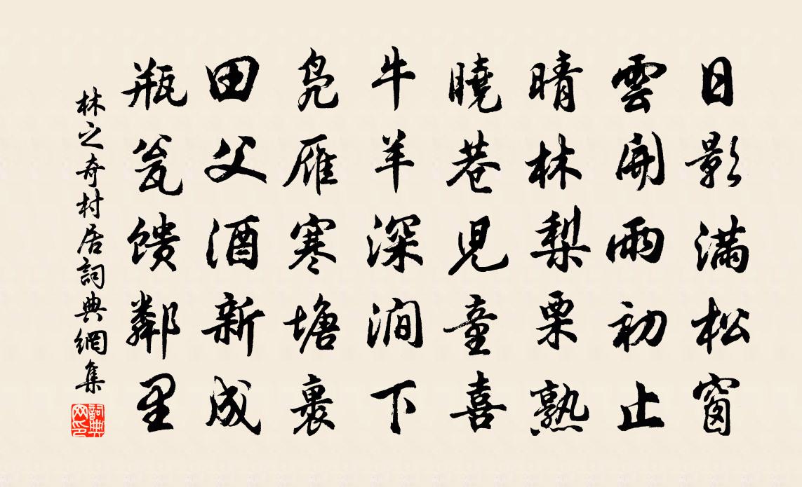 詩詞名句歷史字典書法欣賞書法字典國語詞典說文解字康熙字典古漢語字典標 題 作 者 詩 句 村居作者:林之奇 朝代:宋代村居原文日影滿松窗,雲開雨初止。晴林梨栗熟,曉巷兒童喜。牛羊深澗下,鳧雁寒塘裹。田父酒新成,瓶瓮饋鄰里。詩詞問答問:村居的作者是誰?答:林之奇問:村居寫於哪個朝代?答:宋代林之奇村居書法欣賞村居書法作品詩詞推薦普惠院勸農陳致一〔宋代〕青麻幪幪近人長,小麥青青大麥黃。令尹出郊聞好語,春來喜有半年糧。落花楊萬里〔宋代〕紅紫成泥泥作塵,顛風不管惜花人。落花辭樹雖無語,別倩黃鸝告許春。題紫微山上方章孝標〔唐代〕地勢連滄海,山名號紫微。景閒僧坐久,路僻客來稀。峽影雲相照,河流石自圍。塵喧都不到,安得此忘歸。西樓懷感章造〔宋代〕高花古柳傍城闉,游目江城次第新。百感中來倚惆悵,滿城煙雨滿城春。第一百六十七文天祥〔宋代〕陰風千里來,驚浪滿吳楚。世事兩茫茫,飄泊欲誰訴。飲少趙崇嶓〔宋代〕平生不善飲,飲少醉已極。恨不如淵明,陶陶少虛日。桑嵫無停景,寸晷足可惜。今人與古人,展轉不相識。孰能春日雜賦陸游〔宋代〕鬢毛 * 已成霜,此際逢春只自傷。苦雨不容花抵敵,余寒猶賴酒禁當。退紅衣焙薰香冷,古錦詩囊覓句忙。堪笑與杭州薛司戶登樟亭樓作孟浩然〔唐代〕水樓一登眺,半出青林高。帟幕英僚敞,芳筵下客叨。山藏伯禹穴,城壓伍胥濤。今日觀溟漲,垂綸學釣鰲。和曹之才仇遠〔宋代〕山林不可住,欲隱更何之。春去已多日,客愁無了時。斜陽依樹下,明月到門遲。閒事誰消遣,陶潛一卷詩。和周昞仲過踏洞灘李曾伯〔宋代〕堪憐墳上舟難,爭似山坳住舍安。雷鼓喧呼人挽才纜,風鬟笑語女盤灘。倦憑秫酒生春思,愁怯衾裘御夜寒。多謝景德蜡祭百神三首佚名〔宋代〕肅肅靈壇,昭昭上天。潔粢豈盛,以享以虔。百神鹹萃,六樂斯縣。介茲景福,斯於有年。訪野人陸游〔宋代〕我行城西南,適茲素秋時。風露雖已高,草木郁未衰。敲門尋野人,一笑萬事非。拂榻意何勤,酒釅雁鶩肥。新涼賀新涼/賀新郎吳編修〔宋代〕出處男兒事。甚從前、說著淵明,放高頭地。點檢柴桑無剩粟,未肯低頭為米。算此事、非難非易。三十年間如昨賦得櫻桃李世民〔唐代〕華林滿芳景,洛陽遍陽春。朱顏含遠日,翠色影長津。喬柯囀嬌鳥,低枝映美人。昔作園中實,今來席上珍。木蘭花慢 和國范郎中見贈嚴韻王惲〔元代〕臥孤松雲壑,愛青貫,四時心。自絕澗幽蟠,蒼煙高擁,氣壓千林。冰霜幾年凌傲,甚九天、一日露恩深。白壁無梅花七律張道洽〔宋代〕高標勝韻點人寒,殘雪疎籬是水南。天上玉妃居第一,人閒石友結成三。廣平心事今猶在,和靖家風晚最諳。莫訝清明日賜新火曾易簡〔宋代〕令節傳龍蠟,君恩賜近臣。乍烯煙尚短,初出焰猶新。照耀王侯第,歡呼里巷民。誰知蓬蓽下,還有聚螢人。再和王不疑少卿見贈邵雍〔宋代〕乍涼天氣好,何處不堪游。鴻雁來賓日,鷹{左亶右鳥}得志秋。忘形終夕樂,失腳一生休。多少江湖上,舟舡未驂服騰飛行釋文珦〔宋代〕有客乘車建其,四牡驂服騰飛,華綬雜佩陸離,指顧綽有餘輝。賁然到我柴扉,我生靡識輕肥。旋穿敝屣粗衣,延出火祀大辰十二首佚名〔宋代〕孰為大辰,維北有斗。曾是契星,斯我孔有。幽榮功報,潔齊敢後。容興嘉觴,式歆旨酒。名句推薦一者階於道,幾於神。姜子牙《六韜·文韜·兵道》 不入虎穴,焉得虎子。程登吉《幼學瓊林·卷四·鳥獸》 鳥飛反故鄉兮,狐死必首丘。屈原《九章》 芳草已雲暮,故人殊未來。韋莊《章台夜思》 坐開桑落酒,來把菊花枝。杜甫《九日楊奉先會白水崔明府》 不知庭霰今朝落,疑是林花昨夜開。宋之問《苑中遇雪應制》 親履艱難者知下情,備經險易者達物偽。范曄《後漢書·列傳·張衡列傳》 春去秋來也,愁心似醉醺。歐陽炯《巫山一段雲·春去秋來也》 兩岸猿聲啼不住,輕舟已過萬重山李白《早發白帝城/白帝下江陵》 遙想獨游佳味少,無方騅馬但鳴嘶。蘇轍《懷澠池寄子瞻兄》