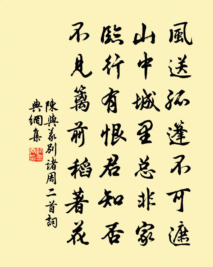 詩詞名句歷史字典書法欣賞書法字典國語詞典說文解字康熙字典古漢語字典標 題 作 者 詩 句 別諸周二首作者:陳與義 朝代:宋代別諸周二首原文風送孤篷不可遮,山中城裡總非家。臨行有恨君知否,不見籬前稻著花。詩詞問答問:別諸周二首的作者是誰?答:陳與義問:別諸周二首寫於哪個朝代?答:宋代問:陳與義的名句有哪些?答:陳與義名句大全陳與義別諸周二首書法欣賞別諸周二首書法作品詩詞推薦初至鄭州李復〔宋代〕二年青海困征鞍,歸望天威咫尺間。雨露忽頒西輔印,鴛鸞阻綴紫宸班。往來擾擾無虛日,應接紛紛只強顏。吏責送黃銑應舉李覯〔宋代〕先世宦不達,少年才已雄。何人為父執,獨自振家風。物色營求廣,賓興禮數隆。孤寒今有望,太守漢吳公。頌古二十一首釋鼎需〔宋代〕金木水火土,始終顛倒數。五六下四三,初爻傳 * 。苦苦,卜得此卦一生貧,遠信不來病人死。鵲橋仙(席上和趙晉臣敷文)辛棄疾〔宋代〕少年風月,少年歌舞,老去方知堪羨。嘆折腰、五斗賦歸來,問走了、羊腸幾遍。高車駟馬,金章紫綬,傳語渠儂一翦梅(菊酒)黎廷瑞〔宋代〕小小黃花爾許愁。楚事悠悠。晉事悠悠。荒蕪三徑渺中洲。開幾番秋。落幾番秋。不是孤芳萬古留。餐亦堪羞。采劉世臣先生輓詩楊萬里〔宋代〕策第仍為邑,於公未足論。眼中無佛國,戶外即韓門。道大功非細,人亡德則存。四風寄雙淚,吹到秀峰原。玉台觀杜甫〔唐代〕浩劫因王造,平台訪古游。彩雲蕭史駐,文字魯恭留。宮闕通群帝,乾坤到十洲。人傳有笙鶴,時過此山頭。立春帖子太上皇后閣周必大〔宋代〕早正中闈婦道成,曾裨內禪母儀新。如今永與勛華主,共享千春及萬春。凡聖一首劉克莊〔宋代〕死生非有二致,聖凡於此一般。醒{內隹外鬼}預為石槨,王喬尚欲玉棺。頌古八首釋師一〔宋代〕不起一念須彌山,特立當頭著眼看。拈一縷絲輕絆倒,家家門底路長安。行次田家澳梁作儲光羲〔唐代〕田家俯長道,邀我避炎氛。當暑日方晝,高天無片雲。桑間禾黍氣,柳下牛羊群。野雀棲空屋,晨昏不復聞。前登過溫湯石介〔宋代〕驪山山下水洋洋,一勺之多解破唐。敢告後人商鑒近,溫湯今日是唐湯。送實之倅廬陵二首劉克莊〔宋代〕君去江邊春色濃,郡花照席萬枝紅。守分風月元非贅,吏白文書但托聾。黃本何堪處秦觀,白麻近已拜申公。早歸登師姑岩見城中大閱恍如陣蟻因思舊從戎吏亦蒲壽宬〔宋代〕晨起捫層巔,蒼茫見塵市。鼙鼓生遠陴,壺蠭在幽耳。遙知細柳屯,於時閱軍士。俯彼萬鎧群,微哉一窖蟻。初集贈道者劉威〔唐代〕五雲深處有真仙,歲月催多卻少年。入郭不知今世事,賣丹猶覓古時錢。閒尋白鹿眠瑤草,暗摘紅桃去洞天。時向圉城偶作羅隱〔唐代〕東望陳留日欲曛,每因刀筆想夫君。自從郭泰碑銘後,只見黃金不見文。此夕劉筠〔宋代〕南州石黛有遺妍,目極危梯月上弦。一水相忘空脈脈,雙金何路致拳拳。仙源日永桃無援,客館春輕柳未眠。欲寫舟中戲書陸游〔宋代〕平生萬事付之天,百折猶能氣浩然。試問軟塵金絡馬,何如柔櫓月侵船?英雄到底是痴絕,富貴但能妨醉眠。三百宿洞霄宮林逋〔宋代〕秋山不可盡,秋思亦無垠。碧澗流紅葉,青林點白雲。涼陰一鳥下,落晶亂蟬分。此夜芭蕉雨,何人枕上聞。吳黃金車孫元晏〔唐代〕分擘山河即漸開,許昌基業已傾頹。黃金車與斑斕耳,早個須知入讖來。名句推薦燕歸花謝,早因循、又過清明。納蘭性德《紅窗月·燕歸花謝》 嫩寒鎖夢因春冷,芳氣籠人是酒香。曹雪芹《紅樓夢·第五回》 還怕掩、深院梨花,又作故人清淚。吳文英《無悶·催雪》 悽惻近長沙,地僻秋將盡楊冠卿《卜運算元·秋晚集杜句吊賈傅》 凡令之行也,必待近者之勝也,而令乃行。管仲《管子·重令》 遨歡任落風前帽,促飲爭吹酒上花。宋祁《九日置酒》 借與門前磐石坐,柳陰亭午正風涼。范成大《夏日田園雜興》 美人梳洗時,滿頭間珠翠。鄭遨《富貴曲》 人之初,性本善。性相近,習相遠。王應麟《三字經·全文》 釣罷歸來不繫船,江村月落正堪眠。司空曙《江村即事》