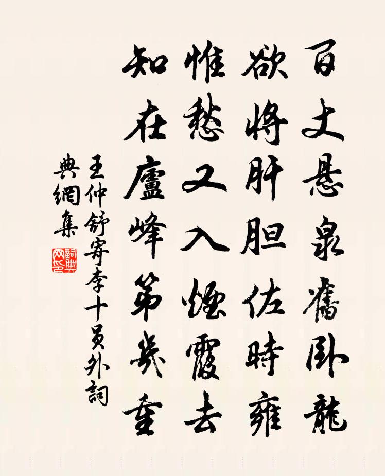 詩詞名句歷史字典書法欣賞書法字典國語詞典說文解字康熙字典古漢語字典標 題 作 者 詩 句 寄李十員外作者:王仲舒 朝代:唐代寄李十員外原文百丈懸泉舊臥龍,欲將肝膽佐時雍。惟愁又入煙霞去,知在廬峰第幾重。詩詞問答問:寄李十員外的作者是誰?答:王仲舒問:寄李十員外寫於哪個朝代?答:唐代問:寄李十員外是什麼體裁?答:七絕王仲舒寄李十員外書法欣賞寄李十員外書法作品注釋全唐詩:卷473-23詩詞推薦劉根道院李彌遜〔宋代〕仙去久不返,遺宮仍倚嵩。終疑白雲屋,猶隱綠毛翁。山曉水聚樹,秋深霜影空。它年結廬地,千古想真風。池上逐涼二首白居易〔唐代〕青苔地上消殘暑,綠樹陰前逐晚涼。輕屐單衣薄紗帽,淺池平岸庳藤床。簪纓怪我情何薄,泉石諳君味甚長。遍問詠史上揚雄二首陳普〔宋代〕展禽未必非龔勝,孤竹猶將笑薛方。可怪揚雄非桀犬,一生終倚桀門牆。次韻陽孝本游翟家灣書院二首又一絕蘇頌〔宋代〕淮上陂陁百畝岡,誰言形勢占高強。郊居擬卜東陽宅,屋壁將營闕里堂。四面松篁分種藝,百家圖籍待收藏。何人送開守解印馮時行〔宋代〕窮冬自蕭疏,小壘玄雲開。使君擲虎符,行矣何遽哉。父老相與言,未言心已哀。自雲好使君,撫我如嬰孩。天不琴曲歌辭幽蘭崔塗〔唐代〕幽植眾能知,貞芳只暗持。自無君子佩,未是國香衰。白露沾長早,青春每到遲。不知當路草,芳馥欲何為。自笑徐似道〔宋代〕黃昏茅店帶星入,清曉竹輿蒙露行。客路三千年五十,對人猶說是歸耕。古樂府用禮禪滅翁韻四鴻雁行洪咨夔〔宋代〕羽肅肅,鳴雝雝,江南江北秋思同。秋思中人無避處,風酸月泠江流去。雁奴亦良苦,群雁不我馮。夜深炬火滅復淮南聞雁呈何復初同年黎廷瑞〔宋代〕孤棹翩翩北渡淮,相逢一笑意悠哉。關河萬里忽秋晚,風雨五更聞雁來。好夢驚回頻輾轉,壯心平盡復崔嵬。吾生八月十王日夜宿南園懷群貺司馬光〔宋代〕昔公在少師,未嘗棄嘉節。今宵秋半分,空羨西園月。天色湛澄清,風聲冷騷屑。笑言不可親,引領望金闕。賴有丙戌五日京師作二首王安石〔宋代〕北風閣雨去不下,驚沙蒼茫亂昏曉。傳聞城外 * 里,雹大如拳死飛鳥。南歌子王吉昌〔元代〕靈腑諸塵淨,民山一氣生。三田晝夜鐵牛耕。鼓潤風雷,金井長瓊英。火力憑加減,冰肌應候烹。圓明方寸鬼神驚撫州呈韓子蒼待制曾幾〔宋代〕一時翰墨頗橫流,誰以斯文坐鎮浮。後學不虛稱吏部,此生曾是識荊州。相逢未改舊青眼,自笑無成今白頭。聞道壽張京尹十首彭龜年〔宋代〕盡心堂上得心傳,妙處機緘共一天。玉骨冰姿更相似,黑頭只欠著貂蟬。山中夜歸釋圓悟〔宋代〕一鶴候柴關,林空境自閒。竹房秋後凍,病叟夜深遠。樹密疑無路,月明猶在山。幽居便所適,已是十年閒。示然侍者釋如珙〔宋代〕以法傳法獅子吼,以心傳心鐵牛機。十方世界無行路,圓覺空中有路歸。水龍吟 簡周晴川教授會飲和韻,其兄晴山,朱唏顏〔元代〕一春剩雨慳晴,悶來閒檢床頭歷。農占候應,今朝甲子,初開霽色。草徑泥融,柳橋風勁,尚妨吟策。有幽軒水淨灘頭寺懷莫升之趙蕃〔宋代〕青衫縣尹沈泉久,黃綬尉曹華發多。重到灘頭舊遊寺,一觴獨舉奈愁何。水龍吟葉夢得〔宋代〕舵樓橫笛孤吹,暮雲散盡天如水。人間底事,忽驚飛墮,冰壺千里。玉樹風清,漫披遙卷,與空無際。料嫦娥此夜戊子三月二十一日殤小女稱稱三首梅堯臣〔宋代〕生汝父母喜,死汝父母傷。我行豈有虧,汝命何不長。鴉雛春滿窠,蜂子夏滿房。毒螫與惡噪,所生遂飛揚。理固名句推薦殘燈孤枕夢,輕浪五更風。徐昌圖《臨江仙·飲散離亭西去》 戲馬台南山簇簇,山邊飲酒歌別曲。張籍《送遠曲》 丈夫非無淚,不灑離別間。陸龜蒙《別離》 隨意春芳歇,王孫自可留。王維《山居秋暝》 佳人相對泣,淚下羅衣濕。李師中《菩薩蠻·子規啼破城樓月》 白雲回望合,青靄入看無。王維《終南山》 汀洲無浪復無煙,楚客相思益渺然。劉長卿《自夏口至鸚鵡洲夕望岳陽寄源中丞》 利之所在,雖千仞之山無所不上,深源之下,無所不入焉。管仲《管子·禁藏》 自古驕兵多致敗,從來輕敵少成功。羅貫中《三國演義·第六十九回》 人告之以有過則喜。孟子《孟子·公孫丑章句上·第八節》