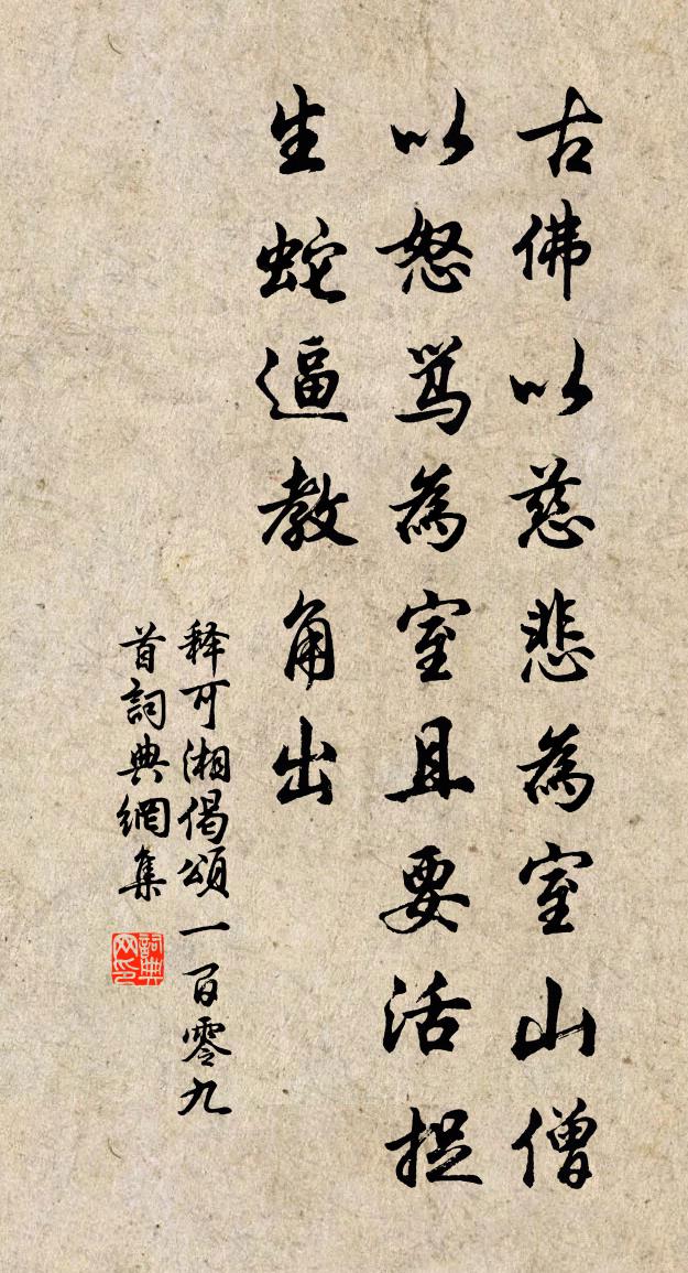 詩詞名句歷史字典書法欣賞書法字典國語詞典說文解字康熙字典古漢語字典標 題 作 者 詩 句 偈頌一百零九首作者:釋可湘 朝代:宋代偈頌一百零九首原文古佛以慈悲為室,山僧以怒罵為室。且要活捉生蛇,逼教角出。詩詞問答問:偈頌一百零九首的作者是誰?答:釋可湘問:偈頌一百零九首寫於哪個朝代?答:宋代釋可湘偈頌一百零九首書法欣賞偈頌一百零九首書法作品詩詞推薦游郭希呂石洞二十詠石橋劉過〔宋代〕隔山聞禽聲,欲往道路隔。顧瞻此橋上,白雲出迎客。景德朝日三首楊億〔宋代〕楝齊良潔,有牲斯純。大采玄冕,乃昭其文。王宮定位,粢盛苾芬。民事以化,盛德升聞。和李校書新題樂府十二首上陽白髮人元稹〔唐代〕天寶年中花鳥使,撩花狎鳥含春思。滿懷墨詔求嬪御,走上高樓半酣醉。醉酣直入卿士家,閨闈不得偷迴避,良人代吳興妓春初寄薛軍事杜牧〔唐代〕霧冷侵紅粉,春陰撲翠鈿。自悲臨曉鏡,誰與惜流年?柳暗霏微雨,花愁黯淡天。金釵有幾隻,抽當酒家錢。句織錦人〔唐代〕如今不重文章士,莫把文章夸向人。八詠應制二首上官儀〔唐代〕啟重帷,重帷照文杏。翡翠藻輕花,流蘇媚浮影。瑤笙燕始歸,金堂露初晞。風隨少女至,虹共美人歸。羅薦已擘豐乾閭丘虎贊釋了惠〔宋代〕虎怕人心惡,人欺虎太慈。雖逢賢太守,難打者官司。上鄭漕二首郭印〔宋代〕窮經好客舊時聲,千載遺風見典型。忠孝家傳心自赤,功名路穩鬢方青。傅岩欲作商霖雨,蜀道猶觀漢使星。小益上方僧張耒〔宋代〕不下上方地,夜禪心慮冥。三更風雪暗,一點佛龕燈。持缽咒潭水,鬼神拳跪聽。山靜寒雲薄,天空孤月明。霜桐賢者之孝二百四十首董仲舒林同〔宋代〕漢有孝廉舉,誰知發自舒。可憐三策罷,卻去相江都。鞠歌行陸機〔魏晉〕朝雲升。應龍攀。乘風遠遊騰雲端。鼓鍾歇。豈自歡。急弦高張思和彈。時希值。年夙愆。循己雖易人知難。王陽太上皇后合端午帖子詞汪應辰〔宋代〕俯視紛華等秕糠,隨時邀樂任嬪嬙。宮中鬥草知多少,自有金芳芝冠眾芳。殘雨陸游〔宋代〕五更殘雨滴檐頭,探借天公一月秋。只道風吹雲散盡,數聲桑下又鳴鳩。露袁郊〔唐代〕湛湛騰空下碧霄,地卑濕處更偏饒。菅茅豐草皆沾潤,不道良田有旱苗。齋中讀書宋庠〔宋代〕藤篋紛披擁蠹筠,日開黃卷代談賓。一經皓首心非悔,枉是無言對斲輪。感嘆二首李覯〔宋代〕得志萬罪消,失志百醜生。誰雲王路寬,枯槁不敢行。出言到口角,縮舌悔恨並。自省由苦此,況乃{上山下蟲}過愚溪李曾伯〔宋代〕為底先生此水居,正緣不解學顏愚。身雖樂彼溪山似,名不期而天壤俱。往事勿言今已矣,當時豈意在茲乎。擬招和僕射牛相公春日閒坐見懷劉禹錫〔唐代〕官曹崇重難頻入,第宅清閒且獨行。階蟻相逢如偶語,園蜂速去恐違程。人於紅藥惟看色,鶯到垂楊不惜聲。東洛離雲中一首鄭獬〔宋代〕南歸喜氣滿東風,草軟沙平馬足忪。料得家人相聚說,也知今日發雲中。和漁翁四絕劉黻〔宋代〕收綱移舟月上時,西風吹當膾鱸肥。任渠官買高聲叫,醉臥蘆花別處磯。名句推薦和戎詔下十五年,將軍不戰空臨邊。陸游《關山月》 樹樹皆秋色,山山唯落暉。王績《野望》 別有根芽,不是人間富貴花。納蘭性德《採桑子·塞上詠雪花》 物壯則老,是謂不道,不道早已。老子《老子·道經·第三十章》 道不遠人。人之為道而遠人,不可以為道。子思《中庸·第十三章》 凍風時作,作則飛沙走礫。袁宏道《滿井遊記》 算明朝、未了重陽,紫萸應耐看。吳文英《霜花腴·重陽前一日泛石湖》 灞涘望長安,河陽視京縣。謝朓《晚登三山還望京邑》 前慮不定,後有大患。司馬遷《史記·蘇秦列傳》 非其地而樹之,不生也。劉向《說苑·雜言》