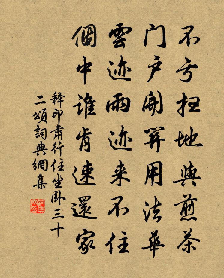 詩詞名句歷史字典書法欣賞書法字典國語詞典說文解字康熙字典古漢語字典標 題 作 者 詩 句 行住坐臥三十二頌作者:釋印肅 朝代:宋代行住坐臥三十二頌原文不虧掃地與煎茶,門戶開關用法華。雲跡雨跡來不住,箇中誰肯速還家。詩詞問答問:行住坐臥三十二頌的作者是誰?答:釋印肅問:行住坐臥三十二頌寫於哪個朝代?答:宋代釋印肅行住坐臥三十二頌書法欣賞行住坐臥三十二頌書法作品詩詞推薦梅花二首寄呈彭吏部白玉蟾〔宋代〕冰玉丰姿不可雙,霜前雪後想淒涼。絕憐夜氣渾如水,而況笛聲堪斷腸。以月照之偏自瘦,無人知處忽然香。從今句齊己〔唐代〕春晴游寺客,花落閉門僧。香傳天下口,□貴火前名。角開香滿室,爐動綠凝鐺。園林將向夕,風雨更吹花。相思與所盤諸君會石幡還和杜老曲江韻丘葵〔宋代〕青禽竹上弄毛衣,飛上檐頭喚不歸。清景每於詩裹見,羈愁惟到海邊稀。僧回古殿山礬落,客散空齋蝙蝠飛。獨對和邑宰張元若酹月亭詩四首李呂〔宋代〕太白邀月飲,只許老坡會。汗漫赤壁游,浩歌邈相對。感懷二首楊公遠〔宋代〕長吟抱膝更欷噓,較著前時迥不如。世事看來巢幕燕,人生勘破上竿魚。投非所好緣工瑟,見匪相知嫩曳裾。造物舞春風(一名瑞鷓鴣)馮延巳〔唐代〕嚴妝才罷怨春風,粉牆畫壁宋家東。蕙蘭有恨枝猶綠,桃李無言花自紅。燕燕巢時簾幕卷,鶯鶯啼處鳳樓空。少年慧山寺肄業送懷坦上人李騭〔唐代〕流水何山分,浮雲空中遇。我生無根株,聚散亦難固。憶昨鬥龍春,岩棲侶高步。清懷去羈束,幽境無滓污。日落苔錢三首釋智圓〔宋代〕鑪冶祇應憑陋巷,富饒應不是豪家。晚來雨歇茆堂外,散在閒庭買落花。羅李嶠〔唐代〕妙舞隨裙動,行歌入扇清。蓮花依帳發,秋月鑒帷明。雲薄衣初卷,蟬飛翼轉輕。若珍三代服,同擅綺紈名。即夕王初〔唐代〕榆葉飄零碧漢流,玉蟾珠露兩清秋。仙家若有單棲恨,莫向銀台半夜遊。贈傳法光梵二大卿兼述譯場之盛宋庠〔宋代〕梵劫扶皇曆,高才會聖門。五天真釋種,三國舊王孫。譯詁生知慧。卿聯萬戶恩。齋熏光漢邸,結集盛秦園。交照送劉仲通赴京師司馬光〔宋代〕聖朝方考牧,番育寄才能。屢別良可嘆,閒遊不復曾。行塵遵洛汭,朝騎對觚稜。瀍上秋台迥,歸來正好登。智遠上人釋祖欽〔宋代〕智聰則遠,機圓自轉。似走盤珠,如萬花苑。開落不在春秋,動靜不滯去留。雲悠悠,水悠悠。天外月如鉤,雪峰早行劉應時〔宋代〕登輿睡思尚昏昏,斗柄銜山月在門。雞犬未鳴潮半落,草蟲聲在荳花村。偈頌八十五首釋妙倫〔宋代〕掃蕩邊塵未著勞,折弓戲把射青霄。滿攀自覺無多力,隨手那知落一鵰。病中六首陳師道〔宋代〕日眚浮珠佩,聲塵籟玉簫。晚秋潘鬢禿,午夢楚魂消。注水瓶花醒,吹薪藥鼎潮。南柯何處是,斜日上廊腰。紫騮馬文同〔宋代〕翩翩紫騮馬,爛爛黃金鞍。流水四蹄急,飛星雙目寒。擁頭青玉釳,蔽臆彩絲鞶。誰取交州鼓,摸將骨去看。寄杜位(位京中宅近西曲江,詩尾有述)杜甫〔唐代〕近聞寬法離新州,想見懷歸尚百憂。逐客雖皆萬里去,悲君已是十年流。干戈況復塵隨眼,鬢髮還應雪滿頭。玉壘次韻明孺見遺之什李處權〔宋代〕世家傳子又傳孫,豈較前身與後身。知足已如倉庾民,忘懷真是葛天民。騎鯨又見詩無敵,射虎何須武絕倫。白屋東齋雜書陸游〔宋代〕吾貧無時醒,日月忽遄邁。空林春采葚,荒壟秋種稗。孤學有自來,飢死奚足怪。著書充棟宇,一字不肯賣。名句推薦江上小堂巢翡翠,苑邊高冢臥麒麟。杜甫《曲江二首》 大仇必去,小人勿輕,禍不可伏。來俊臣《羅織經·固榮卷第六》 人之有能有為,使羞其行,而邦其昌。佚名《尚書·周書·洪範》 昨日鄰家乞新火,曉窗分與讀書燈。王禹偁《清明》 求得人間成小會,試把金尊傍菊叢。晏殊《破陣子·燕子欲歸時節》 綠楊煙外曉寒輕,紅杏枝頭春意鬧。宋祁《玉樓春·春景》 雪洗虜塵靜,風約楚雲留張孝祥《水調歌頭·和龐佑父》 不忘故鄉,仁也;不戀本土,達也。房玄齡《晉書·列傳·第三章》 吃一分虧,受無量福。馮夢龍《警世通言·卷三》 故勢不便,非所以逞能也。韓非及後人《韓非子·說林下》