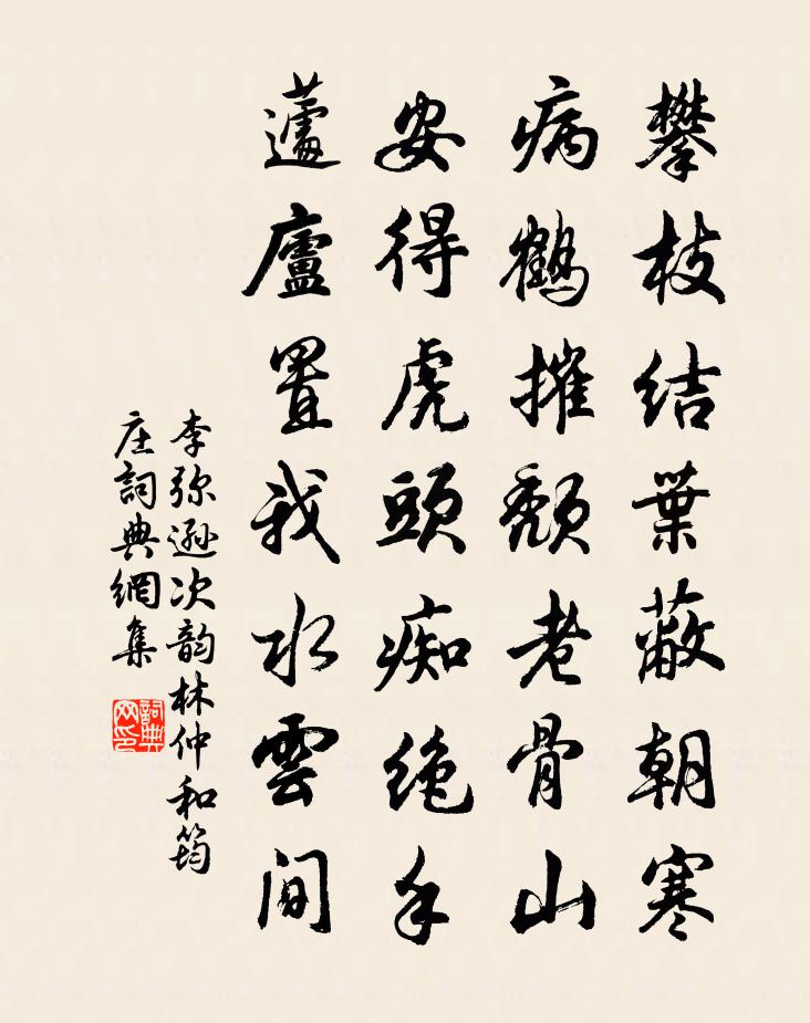 詩詞名句歷史字典書法欣賞書法字典國語詞典說文解字康熙字典古漢語字典標 題 作 者 詩 句 次韻林仲和筠莊作者:李彌遜 朝代:宋代次韻林仲和筠莊原文攀枝結葉蔽朝寒,病鶴摧頹老骨山。安得虎頭痴絕手,蘧廬置我水雲間。詩詞問答問:次韻林仲和筠莊的作者是誰?答:李彌遜問:次韻林仲和筠莊寫於哪個朝代?答:宋代李彌遜次韻林仲和筠莊書法欣賞次韻林仲和筠莊書法作品詩詞推薦善利閣次伯仁所題趙子良畫四首裘萬頃〔宋代〕平生交遊間,吾幘蓋屢岸。區區稻粱謀,君亦逐鴻雁。送謝舍人奉使北朝梅堯臣〔宋代〕漢使下西清,胡人擁道迎。寒笳隨宿堡,衛甲出孤城。犯雪貂裘重,衝風錦綬輕。山川辭國遠,車騎踏沙行。授館言懷貽寓居曾幾〔宋代〕郊居麥風涼,佛屋梅雨潤。縈簾一炷香,隱几百念盡。時從黃卷語,坐看青燈燼。昏昏花亂眼,種種雪侵鬢。懷哉次韻洪尉方岳〔宋代〕氣當以志帥,心豈為形役。未知政奚先,亦各職其職。相期邊幅捐,安用竿牘飭。勉旃正吾鵠,其中非爾力。鴻溝蘇敖〔宋代〕置俎均牢彘,峨冠信沐猴。方矜几上肉,已隨幄中籌。海岳歸三尺,衣冠閟一丘。路人猶指似,山下是鴻溝。偈頌一百零九首釋可湘〔宋代〕二月春將半,夭桃盛放花。靈雲歸去後,香艷落誰家。只如道直至如今更不疑,遇飯吃飯,遇茶吃茶。書璿公房牡丹潘閬〔宋代〕寺中聞說牡丹花,多少人爭耳傍夸。潦倒參軍來看晚,數枝已謝病僧家江城子韋莊〔唐代〕髻鬟狼籍黛眉長,出蘭房,別檀郎。角聲嗚咽,星斗漸微茫。露冷月殘人未起,留不住,淚千行。上周益公曹彥約〔宋代〕荒村建午月,斯螽動股鳴。借問暑方熾,何意作秋聲。自言本寒族,四言本寒族,四海無令名。振羽每自嘆,在野飲文氏園是日鵲噪於庭坐上燭花無數就試者凡李流謙〔宋代〕虎變龍騰各有心,諸公高宴盍朋簪。爛開數對迎祥燭,合噪仍來報喜禽。人似月娥元自近,酒名天祿莫辭深。坐中暮春山行陳紀〔宋代〕幽興忽不愜,山蹊策杖游。林深樹疊影,溪漲水重流。對酒愁先醉,看花老卻羞。平生倚樓意,搔首轉悠悠。贈林愚庵墨梅蒲壽宬〔宋代〕色空已解花光意,香影難隨逋老蹤。此叟芒端不著蜜,幾回曾誤壁間蜂。秋晚三首張舜民〔宋代〕久雨秋深對晚晴,近山昏黑遠山明。灘頭艇子排行系,水底魚兒作隊行。衰柳帶風猶喜舞,殘蟬送日尚能鳴。角冠發彭城文天祥〔宋代〕今朝正重九,行人意遲遲。回首戲馬台,野花發葳蕤。草埋范增塚,雲見樊噲旗。時節正如此,道路將何之。我愛天安殿冊封五嶽帝一首佚名〔宋代〕名岳奠方,帝備克舉。吉日惟良,九實鹹旅。溫玉鏤文,纁裳正寧。禮備樂成,篤神之祜。憶江南劉辰翁〔宋代〕已盛甚花幾許,已報八分催。卻問主人何處去,且容老子箇中來。花外主人回。年時客,如今安在哉。正喜錦官城送邵蘭雪歸吳門仍用前韻陳維崧〔清代〕易水嚴裝發。休回首、故人別酒,帝城高闕。九曲黃河迎馬首,淼淼龍宮堆雪。說不盡、天涯明月。君去故侯瓜可和人二首張耒〔宋代〕曈曨曉日漏春光,欄下萱叢尚臥霜。認得君家門上雪,易知何事卻難忘。寄趙眉翁二首葉紹翁〔宋代〕君王未肯賜西湖,鷗鷺叢中借地居。憔悴風姿今釣叟,痴心猶望故人書。夕雨陸游〔宋代〕屣履行莎徑,移床臥草亭。風聲雜溪瀨,雨氣挾龍腥。奕奕空中電,昏昏雲罅星。徂年又如許,吾鬢得長青?名句推薦依舊,依舊,人與綠楊俱瘦。秦觀《如夢令·春景》 我亦飄零久!顧貞觀《金縷曲二首》 燕子歸來依舊忙。憶君王,月破黃昏人斷腸。謝克家《憶君王·依依宮柳拂宮牆》 天生我材必有用,千金散盡還復來。李白《將進酒》 居庸關上子規啼,飲馬流泉落日低。朱彝尊《出居庸關》 因思杜陵夢,鳧雁滿回塘。溫庭筠《商山早行》 擬借寒潭垂釣,又恐鷗鳥相猜,不肯傍青綸。蘇舜欽《水調歌頭·滄浪亭》 今日暫同芳菊酒,明朝應作斷蓬飛。王之渙《九日送別》 窗外日光彈指過,席間花影坐前移。施耐庵《水滸傳·第二回》 力貴突,智貴卒。得之同則速為上,勝之同則濕為下。呂不韋《呂氏春秋·論·開春論》