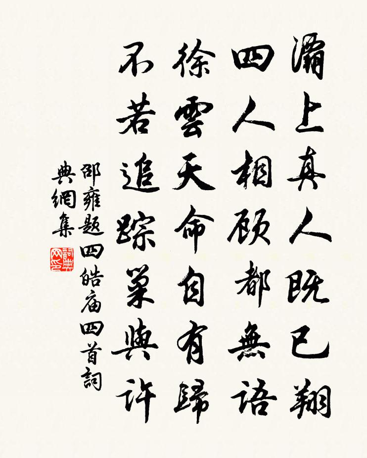 詩詞名句歷史字典書法欣賞書法字典國語詞典說文解字康熙字典古漢語字典標 題 作 者 詩 句 題四皓廟四首作者:邵雍 朝代:宋代題四皓廟四首原文灞上真人既已翔,四人相顧都無語。徐雲天命自有歸,不若追蹤巢與許。詩詞問答問:題四皓廟四首的作者是誰?答:邵雍問:題四皓廟四首寫於哪個朝代?答:宋代邵雍題四皓廟四首書法欣賞題四皓廟四首書法作品詩詞推薦趙表之送梅並詩次韻四首張嵲〔宋代〕不著名身與句身,迥然超過亦無真。誰知終日騰騰者,便是當來本分人。秋暮與諸文士集宿姚端公所居無可〔唐代〕宵清月復圓,共集侍臣筵。獨寡區中學,空論樹下禪。風多秋晚竹,雲盡夜深天。此會東西去,堪愁又隔年。侍宴滻水賦得濃字張說〔唐代〕千行發御柳,一葉下仙筇。青浦宸游至,朱城佳氣濃。雲霞交暮色,草樹喜春容。藹藹天旗轉,清笳入九重。喜遷鶯王千秋〔宋代〕春前臘尾。問誰會開解,幽人心裡。映竹精神,凌風標緻,姑射昔聞今是。試妝競看吹面,寄驛勝傳緘紙。迥瀟灑答顏復國博蘇轍〔宋代〕歲晚河冰留畫船,一軒修竹喜蕭然。詩詞溫厚新成格,道論精微近入禪。病後不勝清醑釅,別時仍得舊書傳。欲成次韻虞叟九兄七月一日作蘇泂〔宋代〕日月跳丸逝不留,吟蛩得意蛻蟬憂。終更末伏應無暑,望見中元便有秋。風爽氣先青草動,雨涼心共白蓮幽。誰能送胡季昭二首羅茂良〔宋代〕頻寄書回洗我愁,莫言無雁到南州。長相思外加餐飯,計取承君舊話頭。反輗歌二首趙崇嶓〔宋代〕死生雖異塗,昭晰本一理。崦嵫落圓景,一訣非永逝。達人隨元化,生死一劇耳。生生常痴冥,安知百真死。死當代簡國清老惠梅曹勛〔宋代〕梅從雲塢冷搖春,玉雪浮香不著塵。愚谷斬新肯拈出,一時全露法王身。問津樓鄭伯熊〔宋代〕周道直如矢,亡羊古無有。利慾蝕本心,眼花大如斗。適燕南其轅,之越乃北走。四海阮嗣宗,臧否不掛口。一慟小漿鋪范師孔〔宋代〕一路經行處,盤溪繞僻原。蜂喧花外塢,犬吠竹邊門。菩薩蠻(春雨)蕭漢傑〔宋代〕春愁一段來無影。著人似醉昏難醒。煙雨濕闌乾。杏花驚蟄寒。唾壺敲欲破。絕叫憑誰和。今夜欠添衣。那人知不馬上作陸游〔宋代〕平橋小陌雨初收,淡日穿雲翠靄浮。楊柳不遮春色斷,一枝紅杏出牆頭。舟中獨飲趙蕃〔宋代〕已是支離百不禁,況堪多病苦相侵。村沽縱薄可不醉,梅半落時天政陰。家人子輩往石湖檢校暮歸范成大〔宋代〕南浦回春棹,東城掩暮扉。兒修雞柵了,女挈菜藍歸。風力雖欺酒,花香尚染衣。衰翁牢守舍,腸斷釣魚磯。郊廟歌辭。武后大享拜洛樂章。通和武則天〔唐代〕皇皇靈眷,穆穆神心。暫動凝質,還歸積陰。功玄樞紐,理寂高深。銜恩佩德,聳志翹襟。出商州有感王禹偁〔宋代〕圜丘恩例得量移,笑領全家出翠微。惟有來時的顱馬,商山埋骨不同歸。長生觀李燾〔宋代〕成家得將軍,如越大夫蠡。功成拂衣去,智囊未叩底。品松孟郊〔唐代〕追悲謝靈運,不得殊常封。縱然孔與顏,亦莫及此松。此松天格高,聳異千萬重。抓拏巨靈手,擘裂少室峰。擘裂相和歌辭苦寒行劉駕〔唐代〕嚴寒動八荒,莿莿無休時。陽烏不自暖,雪壓扶桑枝。歲暮寒益壯,青春安得歸。朔雁到南海,越禽何處飛。誰言名句推薦去年米貴闕軍食,今年米賤大傷農。杜甫《歲晏行》 欲知平直,則必準繩;欲知方圓,則必規矩呂不韋《呂氏春秋·論·不苟論》 萬里想龍沙,泣孤臣吳越張元乾《石州慢·己酉秋吳興舟中作》 雨恨雲愁,江南依舊稱佳麗。王禹偁《點絳唇·感興》 節用儲蓄,以備凶災范曄《後漢書·本紀·肅宗孝章帝紀》 昨夢西湖,老扁舟身世。吳文英《拜星月慢·林鐘羽姜石帚以盆蓮數十置中庭宴客其中》 宮衣亦有名,端午被恩榮。杜甫《端午日賜衣》 春無蹤跡誰知。除非問取黃鸝。黃庭堅《清平樂·春歸何處》 面譽者不忠,飾貌者不情戴聖《大戴禮記·文王官人第七十二》 儉節則昌,淫佚則亡。墨子《墨子·06章 辭過》