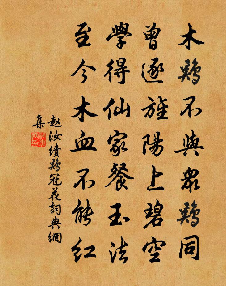 詩詞名句歷史字典書法欣賞書法字典國語詞典說文解字康熙字典古漢語字典標 題 作 者 詩 句 雞冠花作者:趙汝績 朝代:宋代雞冠花原文木雞不與眾雞同,曾逐旌陽上碧空。學得仙家餐玉法,至今木血不能紅。詩詞問答問:雞冠花的作者是誰?答:趙汝績問:雞冠花寫於哪個朝代?答:宋代趙汝績雞冠花書法欣賞雞冠花書法作品詩詞推薦九月九日望蜀台蘇頲〔唐代〕蜀王望蜀舊台前,九日分明見一川。北料鄉關方自此,南辭城郭復依然。青松系馬攢岩畔, * 留人籍道邊。自昔和子瞻次韻陶淵明停雲詩蘇轍〔宋代〕雲跨南溟,南北一雨。瞻望匪遙,檻穽斯阻。夢往從之,引手相撫。笑言未半,舍我不佇。送鄰守邂逅祭酒李公周南〔宋代〕早作將吳守,臨分御李侯。清醇瞻耈老,省素共晨羞。鄉里終全活,人家更小留。腐儒疎懶意,白水看行舟。句宋太宗〔宋代〕欲餌金鉤深未到,磻溪須問釣魚人。再用青字韻卷剛中〔宋代〕黃旗分破柳梢青,旗尾穿林鳥不驚。感極老人翻欲泣,赦餘污吏始偷生。帳閒縹緲傳新曲,酒賤蹣跚醉老兵。與了送臧汝舟楚州秋試陳造〔宋代〕羨殺君家有兩方,阿戎材幹更昂藏。久知筆力能扛鼎,此去賢書定探囊。鄰近玉淵嘗借潤,眼中珠樹看爭芳。舊陪虞美人(李敷文席上)王質〔宋代〕翠陰融盡毿毿雪。慘澹花明滅。嫩沙拂拂漲痕添。想見故溪、綠到草堂前。夕陽紅透櫻桃粒。掩映深沈碧。成都事連日雪未能多曾遠逸見惠二首遵歐蘇律禁體物張鎡〔宋代〕鵲凍聽無語,鷗飢望不飛。從饒居士家,亦自到軒稀。入幕燈生暈,飄池水長肥。何能巧模寫,吟思欠幽微。秋日有懷姚合〔唐代〕秋來不復眠,但覺思悠然。菊 * 經露,蟲聲漸替蟬。詩情生酒里,心事在山邊。舊里無因到,西風又一年。出塞李新〔宋代〕城頭落日黃雲起,斷草飛蓬滿千里。紅塵一騎踏高回,半夜驅兵渡遼水。馬蹄行盡關山月,燕然山下沙如雪。負戈和襲美木蘭院次韻陸龜蒙〔唐代〕苦吟清漏迢迢極,月過花西尚未眠。猶憶故山欹警枕,夜來嗚咽似流泉。集虛書院仇遠〔宋代〕築室東臯野水濱,室中生白坐生春。了知空洞元無物,須信清明自有神。幽徑草花聊適趣,閒窗筆硯不留塵。酒經春情四首高翥〔宋代〕鬥草歸來上玉階,香塵微涴合歡鞋。全籌贏得無人賞,依舊春愁自滿懷。崔遠送瘙利詩帖贊岳珂〔宋代〕唐而乾寧,果何時。作書及詩,且恬以嬉。燁胥之不知,而拳拳於一緇。吁其可悲。鷓鴣天佚名〔宋代〕宣德樓前雪未融。賀正人見彩山紅。九衢照影紛紛月,萬井吹香細細風。復道遠,暗相通。平陽主第五王宮。鳳蕭九頂大像閣吳宗旦〔宋代〕嘉州石拂名天下,回視新昌可子孫。幸甚身游大人國,恍然夢跨北溟鯤。北苑侍宴雜詠詩竹徐鉉〔唐代〕勁節生宮苑,虛心奉豫游。自然名價重,不羨渭川侯。酹江月張之翰〔元代〕人間良夜,是年年、八月中秋時節。萬古青天當此際,正要十分澄澈。何處浮雲,微茫黯淡,便把青光隔。憑欄三贈老雞陸游〔宋代〕峨峨赤幘先群輩,喔喔長鳴蓋四郊。意氣雖雄無處用,風霜從我老衡茆。滿江紅李嬰〔宋代〕荊楚風煙,寂寞近、中秋時候。露下冷、蘭英將謝,葦花初秀。歸燕殷勤辭巷陌,鳴蛩淒楚來窗牖。又誰念、江邊名句推薦將軍金甲夜不脫,半夜軍行戈相撥,風頭如刀面如割。岑參《走馬川行奉送出師西征 / 走馬川行奉送封大夫出師西征》 窮猿投林,豈暇擇木!房玄齡《晉書·列傳·第六十二章》 老吾老,以及人之老;幼吾幼,以及人之幼。孟子《孟子·梁惠王章句上·第八節》 扁舟昨泊,危亭孤嘯,目斷閒雲千里。吳潛《鵲橋仙·扁舟昨泊》 分明小像沉香縷,一片傷心欲畫難。納蘭性德《於中好·送梁汾南還為題小影》 此後錦書休寄,畫樓雲雨無憑。晏幾道《清平樂·留人不住》 情之所鍾,雖醜不嫌。沈復《浮生六記·閨房記樂》 安而不忘危,存而不忘亡,治而不忘亂佚名《易傳·繫辭傳下·第五章》 紅葉滿寒溪,一路空山萬木齊。納蘭性德《南鄉子·秋暮村居》 舒捲江山圖畫,應答龍魚悲嘯,不暇顧詩愁。楊炎正《水調歌頭·登多景樓》