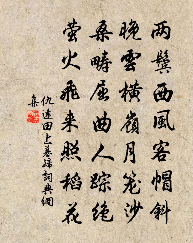 詩詞名句歷史字典書法欣賞書法字典國語詞典說文解字康熙字典古漢語字典標 題 作 者 詩 句 田上暮歸作者:仇遠 朝代:宋代田上暮歸原文兩鬢西風客帽斜,晚雲橫嶺月籠沙。桑疇屈曲人蹤絕,螢火飛來照稻花。詩詞問答問:田上暮歸的作者是誰?答:仇遠問:田上暮歸寫於哪個朝代?答:宋代仇遠田上暮歸書法欣賞田上暮歸書法作品詩詞推薦蝶戀花·檻菊愁煙蘭泣露晏殊〔宋代〕檻菊愁煙蘭泣露,羅幕輕寒,燕子雙飛去。明月不諳離恨苦,斜光到曉穿朱戶。(雙飛去 一作:雙來去;離恨苦酬潘景玉林景熙〔宋代〕讀史雙眸夜炯然,一聲江雁落燈前。馬非汗血材終下,木或青黃性不全。風月未容詩入務,乾坤應許酒為年。寒城瑞鶴仙(壽王之朝)陳著〔宋代〕對南山翠峭。幾百年、銀青門第轉好。梅花弄春小。向重簾暖處,華筵開早。斑衣簇繞。舞香雲、鬨堂頌禱。穩生贈高子勉四首黃庭堅〔宋代〕妙在和光同塵,事須鉤深入神。聽他下虎口著,我不為牛後人。王鷗盟別去久之有詩繼韻楊冠卿〔宋代〕急槳沖煙去,奚奴喚不應。清吟繼囊錦,妙句琢壺冰。天遠暮雲碧,江寒秋練澄。懷人心欲折,愁坐對青燈。奉和經略龐龍圖延州南城入詠迎薰亭司馬光〔宋代〕華館壓清波,坐待南風至。須知明牧賢,善達吾君意。江南曲李鹹用〔唐代〕江南四月薰風低,江南女兒芳步齊。晚雲接水共渺瀰,遠沙疊草空萋萋。白薴不堪論古意,數花猶可醉前溪。孤舟河中晚霽常建〔唐代〕湖廣舟自輕,江天欲澄霽。是時清楚望,氣色猶霾曀。踟躕金霞白,波上日初麗。煙虹落鏡中,樹木生天際。杳杳定風波·南海歸贈王定國侍人寓娘蘇軾〔宋代〕常羨人間琢玉郎。天教分付點酥娘。盡道清歌傳皓齒。風起。雪飛炎海變清涼。(天教分付 一作:天應乞與)萬予欲自嚴買船下七里灘謁嚴光祠而歸會灘淺陸陸游〔宋代〕客星祠下渺煙波,欠我扁舟舞短蓑。不為窮冬怕灘惡,正愁此老笑人多。桂戴復古〔宋代〕金谷園林知幾家,競栽桃李作春華。無人得似天工巧,明月中間種桂花。送張端袤赴潘葑劉宰〔宋代〕汲取人間第二泉,釀成天上酌神仙。渠儂得此良佳矣,我輩為之或未然。職守近來成漫浪,湖山佳處且迴旋。向陽六州歌頭(吊武穆鄂王忠烈廟)李訦〔宋代〕高皇神武,善駕馭豪英。攘北狄,驅群盜,命天膺。救蒼生。奈夢繞沙漠,隔溫情,屈和好,召大將,歸兵柄,列酬段侍御趙嘏〔唐代〕蓮花上客思閒閒,數首新詩到篳關。吟得楚天風雨霽,一條江水兩三山。齋中夜賦陸游〔宋代〕高居終日掩齋扉,幽事常多俗事稀。露重叢篁時自瀉,風高脫葉有先飛。秋衣漸制聞砧杵,社肉初分謝蕨薇。卻笑客中丘葵〔宋代〕孤客思家坐似喑,溪風吹樹為悲吟。溪中流水深千尺,未抵慈親憶子心。喜歡吟邵雍〔宋代〕平生喜飲酒,飲酒喜輕醇。不喜大段醉,只便微帶醺。融怡如再少,和煦似初春。亦恐難名狀,兩儀仍未分。祝英台近(閨怨)黎廷瑞〔宋代〕彩雲空,香雨霽。一夢千年事。碧幌如煙,卻扇試新睡。恁時楊柳闌乾,芙蓉池館,還只似、如今天氣。遠山翠。憶瀟湘故人高吉〔宋代〕竹好無多個,江清不覺深。余香隨去蝶,軟語愛幽禽。美景翻成恨,經年不寄音。長沙一樽酒,得共幾回斟。和麟老韻五絕王炎〔宋代〕清如野鶴有仙骨,閒似片雲無俗情。試問老人那得病,定應金粟是前生。名句推薦知人者智,自知者明。勝人者有力,自勝者強。老子《老子·道經·第三十三章》 得即高歌失即休,多愁多恨亦悠悠。羅隱《自遣》 雲母屏風燭影深,長河漸落曉星沉。李商隱《嫦娥》 泉聲咽危石,日色冷青松。王維《過香積寺》 白雲千里萬里,明月前溪後溪。劉長卿《謫仙怨·晴川落日初低》 有孫母未去,出入無完裙。杜甫《石壕吏》 不為燥濕輕重,不為窮達易節。范曄《後漢書·列傳·周黃徐姜申屠列傳》 人生貴得適意爾。劉義慶《世說新語·識鑒》 得成比目何辭死,願作鴛鴦不羨仙。盧照鄰《長安古意》 試問鄉關何處是,水雲浩蕩迷南北。趙鼎《滿江紅·丁未九月南渡泊舟儀真江口作》