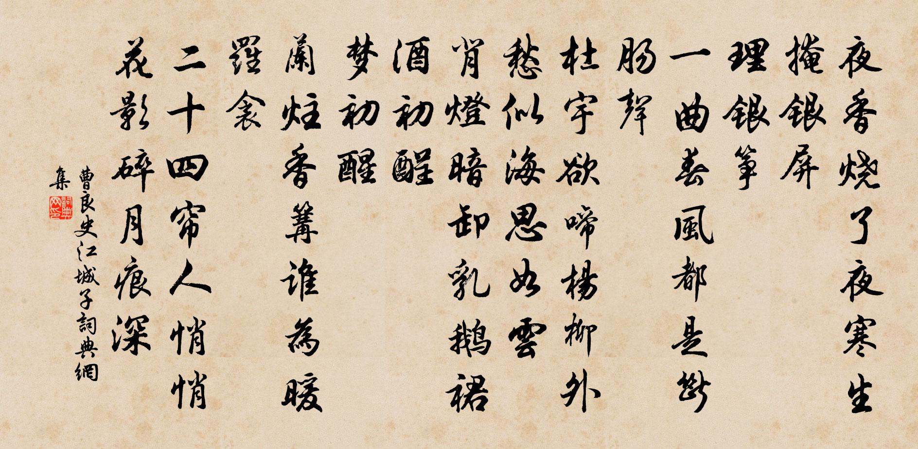 詩詞名句歷史字典書法欣賞書法字典國語詞典說文解字康熙字典古漢語字典標 題 作 者 詩 句 江城子作者:曹良史 朝代:宋代江城子原文夜香燒了夜寒生。掩銀屏。理銀箏。一曲春風,都是斷腸聲。杜宇欲啼楊柳外,愁似海,思如雲。背燈暗卸乳鵝裙。酒初酲。夢初醒。蘭炷香篝,誰為暖羅衾。二十四簾人悄悄,花影碎,月痕深。詩詞問答問:江城子的作者是誰?答:曹良史問:江城子寫於哪個朝代?答:宋代問:江城子是什麼體裁?答:詞曹良史江城子書法欣賞江城子書法作品詩詞推薦宮詞一百首岳珂〔宋代〕聖心如鏡靜蟬蜎,欲仗元龜監已然。通志一編新進御,漢宮五夜剪金蓮。紀事文天祥〔宋代〕英雄未肯死前休,風起雲飛不自由。殺我混同江外去,豈無曹翰守幽州。忝官引元結〔唐代〕天下昔無事,僻居養愚鈍。山野性所安,熙然自全順。忽逢暴兵起,閭巷見軍陣。將家瀛海濱,自棄同芻糞。往在送衛清叔著作提舉淮東樓鑰〔宋代〕屢從樽酒接從容,叔寶風姿照座中。他日相逢年益老,棋壇尚可角雌雄。頌古一百首釋智愚〔宋代〕以玉抵鵲,以鼠為璞。眇然視之,太虛寥廓。賀黃少府受辟釋紹嵩〔宋代〕一鶚新收薦士書,從今價重百車渠。麒麟步舞開天上,會見含香近紫虛。謝人惠扇子及茶齊己〔唐代〕槍旗封蜀茗,圓潔制鮫綃。好客分烹煮,青蠅避動搖。陸生夸妙法,班女恨涼飆。多謝崔居士,相思寄寂寥。谷口書齋寄楊補闕錢起〔唐代〕泉壑帶茅茨,雲霞生薜帷。竹憐新雨後,山愛夕陽時。閒鷺棲常早,秋花落更遲。家童掃蘿徑,昨與故人期。程文簡公輓詞樓鑰〔宋代〕太上崇耆舊,龍鱗手可攀。胡為遯荒野,竟復老商山。漢閣頒綸渥,瀛壖擁旆還。靈光遂陳跡,西望涕空潸。春晚陸游〔宋代〕窗戶迎新燕,階除巢乳鴉。欲知春已暮,地上亦無花。劉氏內政及二寵同孕王邁〔宋代〕中秋過後纏十日,廣寒侍人遭譴謫。隨在人間富貴家,依前不離姮娥側。劉郎風流世所無,醉中飲啖無精粗。三胎和人游嵩山十二題其二拜馬澗范仲淹〔宋代〕傳聞王子仙,潤邊遺一驥。當時 * ,雞犬亦可致。未必真龍媒,悠悠在平地。追和張學士從沂公游廣固城司馬光〔宋代〕蒼鵝集宋幕,游鹿上燕台。霸氣山河盡,王師江漢來。重圍經歲合,嚴鎖夜深開。廢殿余沙礫,頹牆翳草萊。清時才臣設席彥修來過仍陪表臣終日之樂豈易得也李處權〔宋代〕顧我非仙李,知君實老彭。承家羅玉樹,潤屋起金籯。世路嗟多事,人生戒不情。歲華將暮矣,切勿訴深觥。白雲庵四首逍遙子〔宋代〕泉流東畔是蓬萊,我愛青山為展開。獨倚瘦筇誰是伴,白雲日晚自歸來。論俗十二首劉子翬〔宋代〕愚氓擾潢池,囏難亦常態。簪紳有包藏,事異吁可怪。豺聲久伺亂,鯨戮終何悔。游言張凶焰,巧諜移機會。初如紹熙庚戍中秋後三日拜張於湖墓董道輔〔宋代〕曉出白下門,瘦馬踏秋色。鐘山度蒼翠,慰我遠遊客。暮投清果寺,花草獻幽寂。長廊靜無人,落日照西壁。平生別友釋文珦〔宋代〕故人別我江東去,不堪回首城邊路。明日思君不見君,惟有春雲滿江樹。次韻虞退夫除夕七絕句魏了翁〔宋代〕太極光陰不計年,聖賢千古此周旋。九夷自陋吾何與,長在回瓢點瑟邊。喜遷鶯江漢〔宋代〕昇平無際。慶八載相業,君臣魚水。鎮撫風稜,調燮精神,合是聖朝房魏。鳳山政好,還被畫轂朱輪催起。按錦轡名句推薦梅須遜雪三分白,雪卻輸梅一段香。盧鉞《雪梅·其一》 風暖鳥聲碎,日高花影重。杜荀鶴《 * 怨》 梧桐樹,三更雨,不道離情正苦。溫庭筠《更漏子·玉爐香》 只願君心似我心,定不負相思意。李之儀《卜運算元·我住長江頭》 下床著新衣,初學小姑拜。毛鉉《 * 詞·下床著新衣》 有情風、萬里卷潮來,無情送潮歸。蘇軾《八聲甘州·寄參寥子》 水天清話,院靜人銷夏。項鴻祚《清平樂·池上納涼》 逢人且說三分話,未可全拋一片心。佚名《增廣賢文·上集》 燈前目力雖非昔,猶課蠅頭二萬言。陸游《讀書》 曉月過殘壘,繁星宿故關。司空曙《賊平後送人北歸》