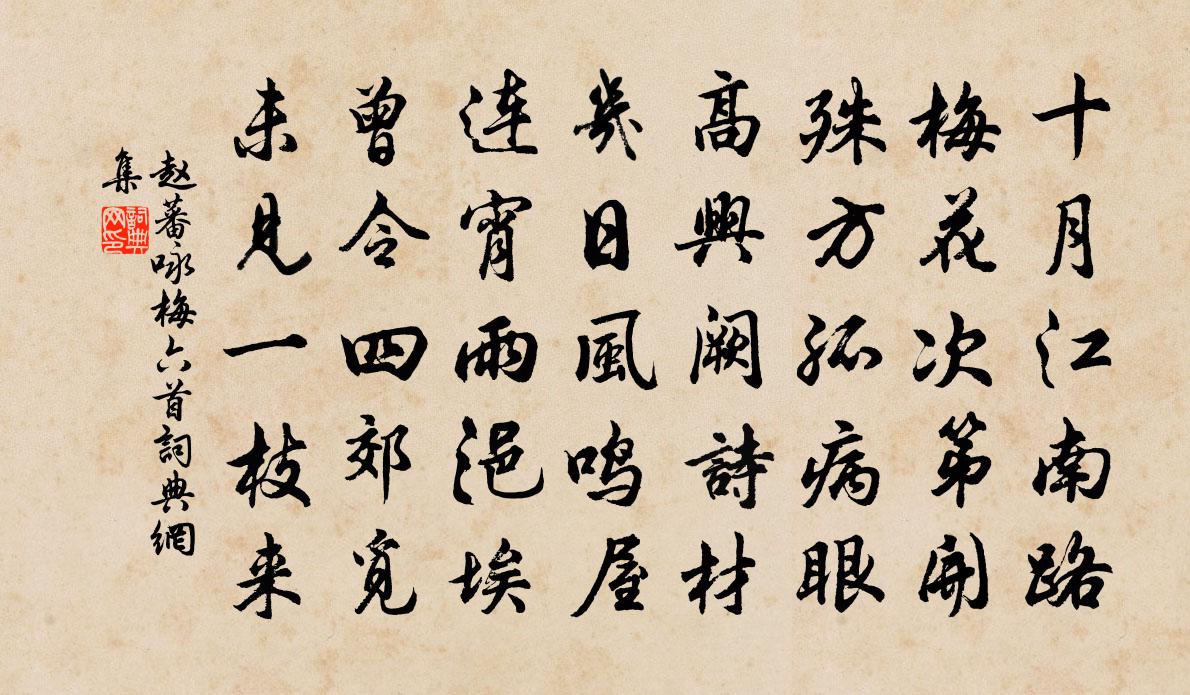 詩詞名句歷史字典書法欣賞書法字典國語詞典說文解字康熙字典古漢語字典標 題 作 者 詩 句 詠梅六首作者:趙蕃 朝代:宋代詠梅六首原文十月江南路,梅花次第開。殊方孤病眼,高興闕詩材。幾日風鳴屋,連宵雨浥埃。曾令四郊覓,未見一枝來。詩詞問答問:詠梅六首的作者是誰?答:趙蕃問:詠梅六首寫於哪個朝代?答:宋代趙蕃詠梅六首書法欣賞詠梅六首書法作品詩詞推薦歸自南華詩朱翌〔宋代〕眾綠揚新楚,初晴中薄寒。行山無闊步,陟巘有遐觀。蕨紫拳猶小,松黃粉漸乾。無嫌一馬瘦,徑度兩重灘。寄小弟許渾〔唐代〕江城紅葉盡,旅思復淒傷。孤夢家山遠,獨眠秋夜長。道存空倚命,身賤未歸鄉。南望空垂淚,天邊雁一行。生查子(簡子似)辛棄疾〔宋代〕高人千丈崖,千古儲冰雪。六月火雲時,一見森毛髮。俗人如盜泉,照眼多昏濁。高處掛吾瓢,不飲吾寧渴。贈零陵僧(一作《懷素上人草書歌》)蘇渙〔唐代〕張顛沒在二十年,謂言草聖無人傳。零陵沙門繼其後,新書大字大如斗。興來走筆如旋風,醉後耳熱心更凶。忽如臨江仙(癸卯次葛魯卿法華山曲水勸酒)葉夢得〔宋代〕山半飛泉鳴玉珮,回波倒卷粼粼。解巾聊濯十年塵。青山應卻怪,此段久無人。行樂應須賢太守,風光過眼逡巡。贈談命陳總屬鄭清之〔宋代〕彈鋏朱門歲月過,生涯安樂遍行窩。談天有口機關別,處世無心笑語多。自是君平忠孝在,其如曼倩滑稽何。一帆朝中措 桃源圖善住〔元代〕桃源傳自武陵翁。遙隔白雲中。漫說人間無路,豈知一棹能通。紅英夾岸,霞蒸遠近,爛漫東風。將謂神仙別境,單于罷戰卻歸題善陽館武元衡〔唐代〕單于南去善陽關,身逐歸雲到處閒。曾是五年蓮府客,每聞胡虜哭陰山。賦豐城劍蘇轍〔宋代〕劍氣夜乾斗,精誠初莫隔。全身寄獄戶,隱約還自得。張雷彼知我,勉為汝一出。腰間雜環佩,亦既報之德。凜凜歸家山行項斯〔唐代〕獻賦才何拙,經時不恥歸。能知此意是,甘取眾人非。遍隴耕無圃,緣溪釣有磯。此懷難自遣,期在振儒衣。春日雜興方岳〔宋代〕漁翁樵叟自行藏,裹飯過從樂未央。撲滿自緣錢作崇,鴟夷聊以酒為鄉。老來願棄人間世,病去欲荒牆下桑。黃犢次韻德孺感興二首黃庭堅〔宋代〕於此吾忘我,從誰尺直尋。事來千萬種,人有兩三心。自守藩籬小,猶能井臼任。過時雖不採,吾與菊花斟。贈元上人杜荀鶴〔唐代〕多少僧中僧行高,偈成流落遍僧抄。經窗月靜灘聲到,石徑人稀蘚色交。垂露竹粘蟬落殼,窣雲松載鶴棲巢。煮茶山寺陸游〔宋代〕路盡初逢寺,行行獨叩扉。民貧稀送供,僧老少完衣。日正樓鍾動,溪深藥草肥。吾衰亦久矣,舍此欲疇依?題大雲寺西閣薛能〔唐代〕閣臨偏險寺當山,獨坐西城笑滿顏。四野有歌行路樂,五營無戰射堂閒。鼙和調角秋空外,砧辦征衣落照間。方擬謝新淦令徐信甫至贛相過曾豐〔宋代〕永嘉之重自晉始,積至本朝始多士。大科異等固其常,文章道德相角掎。淳熙癸卯徐令君,相逢欲執弟子禮。聊將依韻和劉六淮潮梅堯臣〔宋代〕汐潮如有信,時向舊痕生。始覺回波定,還看曲渚平。舞鷗隨下上,寒日共浮傾。後夜人無寐,遙聽入浦聲。次韻子文探梅水西,春已深,猶未開。水西,范成大〔宋代〕孤山山下小斜橋,客魂曾共暗香飄。五年不踏西湖路,想見黃昏清淺處。如今憔悴古江乾,豈有幽芳伴倚欄。臘盡次韻和石學士見寄十首宋庠〔宋代〕榮路徘徊力已疲,保全恩惠劇春熙。須知散櫟無庸日,方到群材構廈時。陪歐陽公燕西湖蘇軾〔宋代〕謂公方壯須似雪,謂公已老光浮頰。朅來湖上飲美酒,醉後劇談猶激烈。湖邊草木新著霜,芙蓉晚菊爭煌煌。插花名句推薦舞殿冷袖,風雨淒淒。杜牧《阿房宮賦》 時節是重陽,菊花牽恨長。徐燦《菩薩蠻·秋閨》 嗜欲不能勞其目,淫邪不能惑其心佚名《黃帝內經·上古天真論》 群芳爛不收,東風落如糝歐陽修《春日西湖寄謝法曹歌》 欲潔何曾潔,雲空未必空。可憐金玉質,終陷淖泥中。曹雪芹《紅樓夢·第五回》 黃雲隴底白雲飛,未得報恩不能歸。李頎《古意》 是以知天欲人相愛相利,而不欲人相惡相賊。墨子《墨子·04章 法儀》 丹陽城南秋海陰,丹陽城北楚雲深。王昌齡《芙蓉樓送辛漸二首》 銜霜當路發,映雪擬寒開。何遜《詠早梅 / 揚州法曹梅花盛開》 築室兮水中,葺之兮荷蓋;屈原《九歌·湘夫人》