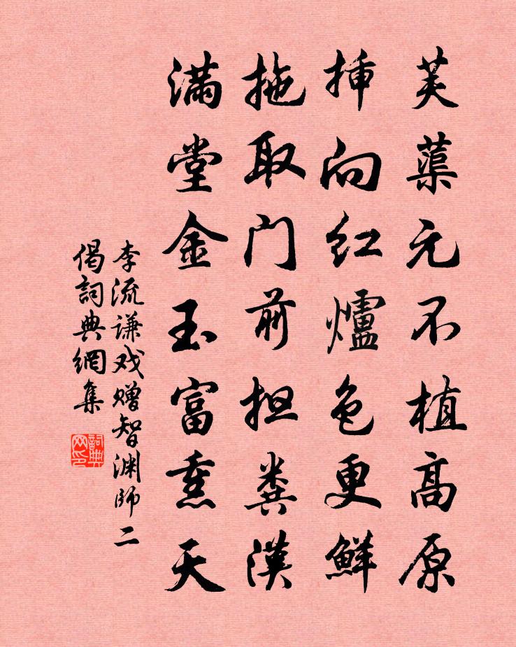 詩詞名句歷史字典書法欣賞書法字典國語詞典說文解字康熙字典古漢語字典標 題 作 者 詩 句 戲贈智淵師二偈作者:李流謙 朝代:宋代戲贈智淵師二偈原文芙蕖元不植高原,插向紅爐色更鮮。拖取門前擔糞漢,滿堂金玉富熏天。詩詞問答問:戲贈智淵師二偈的作者是誰?答:李流謙問:戲贈智淵師二偈寫於哪個朝代?答:宋代李流謙戲贈智淵師二偈書法欣賞戲贈智淵師二偈書法作品詩詞推薦同永叔子聰游嵩山賦十二題其三二室道梅堯臣〔宋代〕度嶺失群山,千峰出天際。方欣左右看,屢改縈迴勢。勝事誰與同,芬然有蘭蕙。閒居十首陳造〔宋代〕桃李爭先不待催,梅花轉首已青苔。即今蜀種胭脂樹,壓倒群芳尚懶開。拋球樂小拋球樂/拋球樂佚名〔宋代〕兩行花竅占風流。縷金羅帶系拋球。玉纖高指紅絲網,大家著意勝頭籌。人日六言五首王邁〔宋代〕誦詩心醉六義,讀易夢吞三爻。毛鄭寸長我取,羲文千載神交。和雪獅兒趙希逢〔宋代〕雪獅塑出對瓊卮,玉筍纖纖露手兒。掩口樽前還笑我,指頭皴破作霜皮。送鄭公績赴試金陵朱翌〔宋代〕昨日天子詔,痛念屏州兒。儻有長轂動,何憂折箠笞。似聞當寧嘆,頗牧今何之。豈惟一方痛,其勢又類腓。策士初八日立壬戌春董嗣杲〔宋代〕臘盡春猶客,春來病轉多。孤樽洗塊礧,萬事付無何。雨杜甫〔唐代〕山雨不作泥,江雲薄為霧。晴飛半嶺鶴,風亂平沙樹。明滅洲景微,隱見岩姿露。拘悶出門游,曠絕經目趣。消中劉伯壽秘校張耒〔宋代〕將軍卷金甲,獨臥嵩山阿。千金買蛾眉,晝夜飲且歌。時平武庫鎖,賂買戎狄和。不復用英雄,惜哉雙鬢皤。延我寄桃源尉趙謙之陽枋〔宋代〕桃源洞口送春歸,欲換漁蓑傍釣磯。火著高林鴉又散,弦鳴中澤雁還飛。蕭蕭空雨晨光潤,耿耿籠燈夜色微。休對挽趙通判五首彭龜年〔宋代〕春風千里下屏星,荊棘叢中稻眼青。凋瘵已肥身已瘠,丹砂還解此公靈。寄楚萍上人齊己〔唐代〕北面香爐秀,南邊瀑布寒。自來還獨去,夏滿又秋殘。日影松杉亂,雲容洞壑寬。何峰是鄰側,片石許相安。寶祐二年皇子冠二十首佚名〔宋代〕吉圭休成,其日南至。天子有詔,冠爾皇嗣。為國之本,隆邦之記。拜而受之,式共敬止。登相國寺閣劉商〔唐代〕晴日登臨好,春風各望家。垂楊夾城路,客思逐楊花。答林昌宗詩筌韻劉翼〔宋代〕經鋤小暇弄詩筌,老去仍知默是祥。滄海移舟盡琴趣,雖然終不似無弦。胡文定公輓詩三首劉子翬〔宋代〕有意扶名教,躬行語默中。楷模陶士器,藥石補天聰。衡岳鄰新卜,伊川道已東。傳經知有子,接武大明宮。宮詞宋白〔宋代〕裡頭宮女淺妝梳,選入昭陽奉玉輿。一曲新聲春稱旨,賜緋教賜小金魚。秋嘆晁說之〔宋代〕為起秋風有所懷,江頭秋色信多哉。孔明何歲荊州去,樂毅即時燕國來。今古悠悠共涕淚,江山寂寂盡塵埃。麒麟和趙華顛梅花陳紀〔宋代〕起舞簪花老尚狂,梅花應記舊高陽。蕊宮仙子無塵韻,幽谷佳人有靚妝。斜月半檐微弄影,斷橋深夜忽聞香。真成三禽言江心宇〔宋代〕燕燕尾不齊,撇裂侵泥滓,翻飛煙雨里。轉眼朱門委榛杞,權門如市止復止,天際翻飛鷹斂翅。名句推薦算韶華,又因循過了,清明時候。王雱《倦尋芳慢·露晞向晚》 春色三分,二分塵土,一分流水。蘇軾《水龍吟·次韻章質夫楊花詞》 結交在相知,骨肉何必親。佚名《箜篌謠》 花落家童未掃,鶯啼山客猶眠。王維《田園樂七首·其六》 新人雖言好,未若故人姝。佚名《上山采蘼蕪》 澗戶寂無人,紛紛開且落。王維《辛夷塢》 可憐繡戶侯門女,獨臥青燈古佛旁。曹雪芹《紅樓夢·第五回》 誠者,不勉而中不思而得:從容中道,聖人也。子思《中庸·第二十章》 又莫是東風逐君來,便吹散眉間一點春皺蘇軾《洞仙歌·詠柳》 晨起動征鐸,客行悲故鄉。溫庭筠《商山早行》