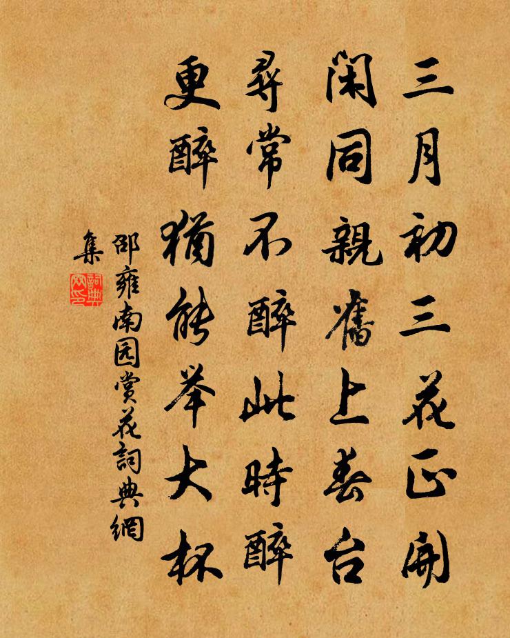 詩詞名句歷史字典書法欣賞書法字典國語詞典說文解字康熙字典古漢語字典標 題 作 者 詩 句 南園賞花作者:邵雍 朝代:宋代南園賞花原文三月初三花正開,閒同親舊上春台。尋常不醉此時醉,更醉猶能舉大杯。詩詞問答問:南園賞花的作者是誰?答:邵雍問:南園賞花寫於哪個朝代?答:宋代邵雍南園賞花書法欣賞南園賞花書法作品詩詞推薦別湯升伯真德秀〔宋代〕二十年前忝舊遊,論交今日始從頭。我如潦盡寒潭水,君似天空明月秋。夜雨幾時重話舊,故人聞早共歸休。臨岐西湖會同年和巫子先韻黃公度〔宋代〕一鸇獨立鳥群空,寂寞誰憐漢閣雄。雁塔他年曾接武,烏台今日自生風。平湖入座搖寒碧,返照催人墮晚紅。目斷送皎中庵住廣壽釋法薰〔宋代〕名字馨香滿道途,挽將洞水注南湖。他時把杖來輕探,莫謂從前一滴無。發合江數里,寄楊商卿諸公范成大〔宋代〕臨分滿意說離愁,草草無言祗淚流。船尾竹林遮縣市,故人猶自立沙頭。即心是佛頌張伯端〔宋代〕佛即心兮心即佛,心佛從來皆妄物。若知無佛復無心,始是真如法身佛。法身佛,沒模樣,一顆圓光含萬象。無體滿江紅(席間和洪舍人兼簡司馬漢章太監)辛棄疾〔宋代〕天與文章,看萬斛、龍文筆力。聞道是、一詩曾賜,千金顏色。欲說又休新意思,強啼偷笑真訊息。算人人、合與宗道者贊釋心月〔宋代〕一雙破草鞋,無跟又無耳。袈裟包不得,拄杖挑不起。只知赤腳下桐城,不免桐城人笑你。金縷曲朱彝尊〔清代〕枕上閒商略,記全家元夜看燈,小樓簾幕。暗裡橫梯聽點屐,知是潛回香閣。險把個玉清追著。徑仄春衣風漸逼,贈醫齒道人宋自適〔宋代〕病欺年去故相加,要害先攻兩輔車。解後神工如掇拾,愧無樽酒對榴花。孟子養小失小陳普〔宋代〕為堯為舜配三才,功用都從此處來。顛倒反為饑渴想,迷輕失重亦堪哀。宮詞楊皇后〔宋代〕角黍冰盤飣餖裝,酒闌昌歜泛瑤觴。近臣夸賜金書翁,御侍爭傅佩帶香。十六夜見月吳芾〔宋代〕連宵待月屢登城,特地遮藏不肯明。過了佳辰方皎潔,嫦娥何事太無情。我輩小年端午給假蒲酒奉親這外日游村田間致馬廷鸞〔宋代〕香羅細葛端陽節,絳帳青衿少小詩。曩以彈丸俘晉孽,今於筒黍吊湘纍。千年感舊慵開卷,一酌銷憂強把卮。蒲酒四賢一不肖詩右尹師魯蔡襄〔宋代〕君子道合久以成,小人利合久以傾。世道下衰交以利,遂使周雅稱嚶鳴。煌煌大都足軒冕,綽有風采為名卿。高名贈知命弟離戎州黃庭堅〔宋代〕道人終歲學陶朱,西子同舟泛五湖。船窗臥讀書萬卷,還有新詩來起予。醉中偶題李若水〔宋代〕小人拙直頗近真,放論動取兒曹嗔。何似飲醇澆舌本,醉來臥唱江南春。疏影陳允平〔宋代〕千峰翠玉。送孤雲伴我,羅窗清宿。拂曉憑虛,春碧生寒,衣單瘦倚筇竹。東風不解吹愁醒,但芳草、溪城南北。調二舉子石延年〔宋代〕司空憐汝汝須知,月下敲門更有誰。叵耐一雙窮相眼,得便宜是落便宜。從軍行張玉娘〔宋代〕三十遴驍勇,從軍事北荒。流星飛玉彈,寶劍落秋霜。書角吹楊柳,金山險馬當。長驅空朔漠,馳捷報明王。贈野逸周弼〔宋代〕悠悠行路雪侵頭,擬出重關洗弊裘。堤上忽逢憔悴客,背花停酒說通州。名句推薦正江令恨別,庾信愁賦劉辰翁《蘭陵王·丙子送春》 士有妒友,則賢交不親。荀子《荀子·大略》 可憎者,人情冷暖;可厭者,世態炎涼。程登吉《幼學瓊林·卷一·歲時》 敗莫大於不自知。呂不韋《呂氏春秋·論·不苟論》 牛困人飢日已高,市南門外泥中歇。白居易《賣炭翁》 玉屏風冷愁人。醉爛漫、梅花翠雲。吳文英《柳梢青·與龜翁登研意觀雪懷癸卯歲臘朝斷橋並馬之游》 北風夜卷赤亭口,一夜天山雪更厚。岑參《天山雪歌送蕭治歸京》 草色青青柳色黃,桃花歷亂李花香。賈至《春思二首·其一》 有情不管別離久。情在相逢終有。晏幾道《秋蕊香·池苑清陰欲就》 莫買沃洲山,時人已知處。劉長卿《送方外上人/送上人》