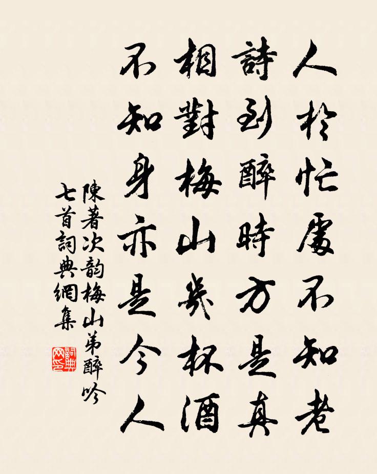 詩詞名句歷史字典書法欣賞書法字典國語詞典說文解字康熙字典古漢語字典標 題 作 者 詩 句 次韻梅山弟醉吟七首作者:陳著 朝代:宋代次韻梅山弟醉吟七首原文人於忙處不知老,詩到醉時方是真。相對梅山幾杯酒,不知身亦是今人。詩詞問答問:次韻梅山弟醉吟七首的作者是誰?答:陳著問:次韻梅山弟醉吟七首寫於哪個朝代?答:宋代陳著次韻梅山弟醉吟七首書法欣賞次韻梅山弟醉吟七首書法作品詩詞推薦和三兄晚飲韓維〔宋代〕乍去炎氛濁暑中,高懷幽事不如窮。乍憐老竹梢雲碧,已見新梨著露紅。回雪舞腰來洛浦,仰天歌韻有秦風。雄圖緣識宋太宗〔宋代〕如來千百億,化身本是真。駈駈煩惱不解嗔,我不能談說,沿舊卻知新。和韓侍郎題楊舍人林池見寄白居易〔唐代〕渠水暗流春凍解,風吹日炙不成凝。鳳池冷暖君諳在,二月因何更有冰?監中直舍種竹同沖卿鄰幾探韻賦得風字韓維〔宋代〕職事惰不理,種竹養疏慵。愛此炎暵辰,獨抱霜雪容。清陰動脩架,秀色如本叢。日落眾客散,蕭蕭庭戶風。浣溪沙(壽晁元默)韓淲〔宋代〕湖海相逢更日邊。槐風蓮雨壽杯前。琴書圖畫水沈煙。共指金鑾當儤直,不應彭澤尚迴旋。今年初度想超然。明道親享先農十首佚名〔宋代〕稼政之本,民食惟天。甫田兆幾,后稷其先。靈壇既祀,黛耜攸虔。乃聖能享,億萬斯年。幽居歲暮陸游〔宋代〕卻醫翻少疾,辭祿不加貧。嘉木移俱活,村醪釀輒醇。悠悠還過日,盎盎又逢春。狂舞君毋笑,梅花插滿巾。次韻翟元卿陳造〔宋代〕我困枘投鑿,君才瓴建高。要之同臭吵,政以借薰陶。觴詠聊真樂,媸妍付爾曹。能來緩詩頰,芋火薦松醪。仙涌山方信孺〔宋代〕龍伯何年釣巨鰲,兩峰漂蕩入洪濤。人間靈跡無尋處,仙涌羅浮相對高。小寺劉克莊〔宋代〕小寺無蹊逕,行時認蘚痕。犬寒鳴似豹,僧老瘦於猿。澗水來旋磨,山童出閉門。城中梅未見,已有數株繁。沁園春(甲辰壽王總侍)李曾伯〔宋代〕北固台端,南渡後來,無此偉人。自從容佐鼎,光華攬轡,幾年中外,屬目經綸。萬灶炊煙,千艘漕雪,手整江淮宿鹿門寺宋庠〔宋代〕寶剎翔鴛地,靈祠刻鹿門。天風奏林籟,海日破岩昏。轉眩三休閣,莊嚴兩足尊。峰迴徒覺秀,瀑遠不知源。花拂倦尋芳陳允平〔宋代〕杏檐轉午。青漏沈沈,春夢無據。鳳錦龜紗,空閉酒塵香霧。流水行雲天四遠,玉簫聲斷人何處。倦尋芳,鎮情尖徐文長傳袁宏道〔明代〕余少時過里肆中,見北雜劇有《四聲猿》,意氣豪達,與近時書生所演傳奇絕異,題曰“天池生”,疑為元人作。劉屯田墓壯節亭尤袤〔宋代〕西澗當年卜考槃,便於神武掛衣冠。後生無復知前輩,故老猶能說長官。三尺荒墳埋玉冷,百年壯節倚天寒。表章甲子春晴久三月晦得頻雨喜而為二絕句鄭剛中〔宋代〕春晚鬱蒸如溽暑,朝來蕭颯似清秋。千山雨後陰雲凝,三日樓前野水流。生查子洪适〔宋代〕正月到盤洲,解凍東風至。便有浴鷗飛,時見潛鱗起。高柳送青來,春在長林里。綠萼一枝梅,端是花中瑞。中秋夜八絕蘇轍〔宋代〕明入庭陰白,寒侵酒氣微。夜深看更好,樓上漸人稀。南柯子劉志淵〔元代〕體若虛空淨,心如泰華安。萬緣妄想不相干。正住無思,觸處得安閒。覺海神珠瑩,禪天性月寒。圓明不昧顯**寒食清明十首劉克莊〔宋代〕唐朝知制誥,多付與詩人。豈有飛花句,虛為起草臣。名句推薦萬里嬋娟,幾許霧屏雲幔。吳文英《玉漏遲·瓜涇度中秋夕賦》 非意相干,可以理遣。房玄齡《晉書·列傳·第六章》 勞歌一曲解行舟,紅葉青山水急流。許渾《謝亭送別》 封侯非我意,但願海波平。戚繼光《韜鈐深處》 朱門酒肉臭,路有凍死骨。杜甫《自京赴奉先縣詠懷五百字 / 自京赴奉先詠懷五百字》 遊子乍聞征袖濕,佳人才唱翠眉低。鄭谷《鷓鴣》 誠者自成也,而道自道也。子思《中庸·第二十五章》 長條別有風流處,密映錢塘蘇小家。寇準《柳·曉帶輕煙間杏花》 濃似春雲淡似煙,參差綠到大江邊。紀昀《富春至嚴陵山水甚佳》 四邊伐鼓雪海涌,三軍大呼陰山動。岑參《輪台歌奉送封大夫出師西征》