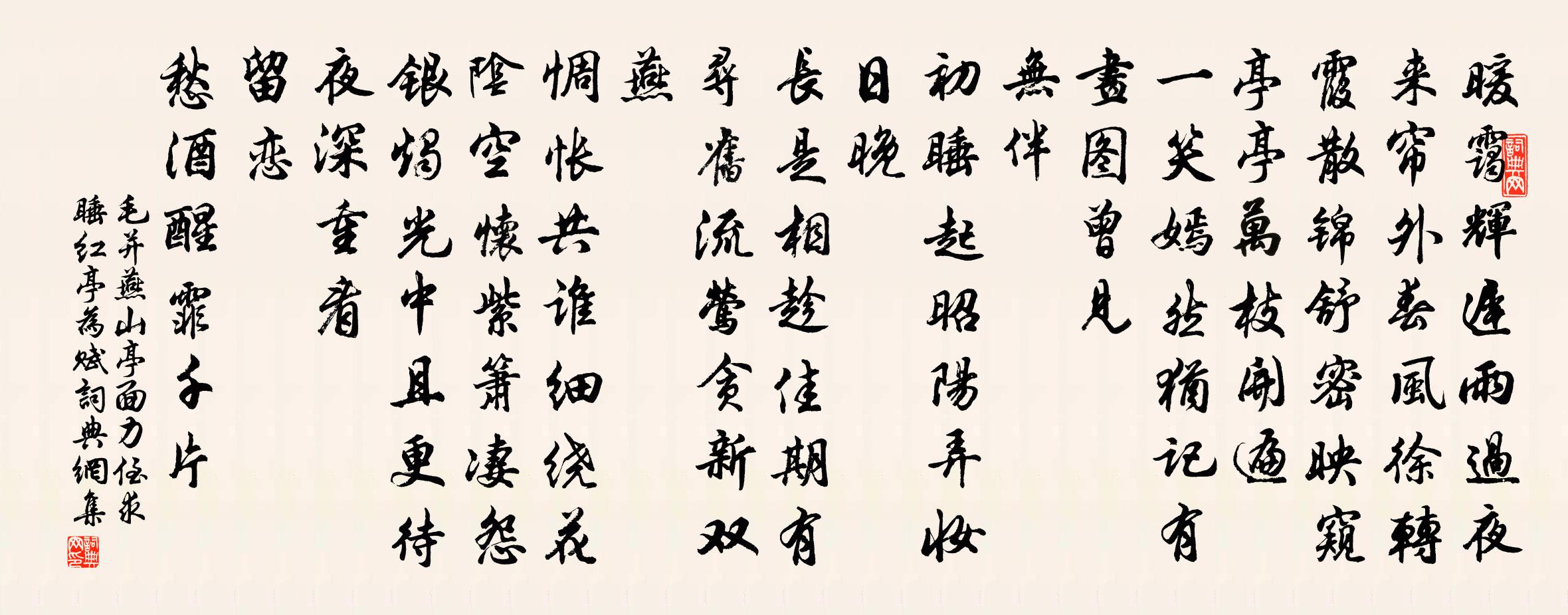 詩詞名句歷史字典書法欣賞書法字典國語詞典說文解字康熙字典古漢語字典標 題 作 者 詩 句 燕山亭(面力·侄求睡紅亭為賦)作者:毛並 朝代:宋代原文暖靄輝遲,雨過夜來,簾外春風徐轉。霞散錦舒,密映窺,亭亭萬枝開遍。一笑嫣然,猶記有、畫圖曾見。無伴。初睡起,昭陽弄妝日晚。長是相趁佳期,有尋舊流鶯,貪新雙燕。惆悵共誰,細繞花陰,空懷紫簫悽怨。銀燭光中,且更待、夜深重看。留戀。愁酒醒、霏千片。詩詞問答問:《燕山亭(面力·侄求睡紅亭為賦)》的作者是誰?答:毛並問:該詩寫於哪個朝代?答:宋代問:該詩是什麼體裁?答:詞書法欣賞燕山亭(面力·侄求睡紅亭為賦)書法作品詩詞推薦喜雪六首陳造〔宋代〕淮春之樓高突兀,憑欄小耐寒如割。平湖穹山兩西子,愛此鮮妝巧塗抹。回首斜陽照屋樑,玉際坤輿尚摧壓。今宵和王鞏六首並次韻蘇軾〔宋代〕君談陽朔山,不作一錢直。岩藏兩頭虺,瘴落千仞翼。雅宜驩兜放,頗訝虞舜陟。暫來已可畏,覽鏡憂面黑。況子更漏子晏殊〔宋代〕菊花殘,梨葉墮。可惜良辰虛過。新酒熟,綺筵開。不辭紅玉杯。蜀弦高,羌管脆。慢颭舞娥香袂。君莫笑,醉鄉學書陸游〔宋代〕九月十九柿葉紅,閉門學書人笑翁。世間誰許一錢直?窗底自用十年功。老蔓纏松飽霜雪,瘦蛟出海拏虛空。即今寄賈島,時任普州司倉姚合〔唐代〕長沙事可悲,普掾罪誰知。千載人空盡,一家冤不移。吟寒應齒落,才峭自名垂。地遠山重疊,難傳相憶詞。臂痛謁告作三絕句示四君子蘇軾〔宋代〕公退清閒如致仕,酒餘歡適似還鄉。不妨更有安心病,臥看縈簾一炷香。心有何求遣病安,年來古井不生瀾。只愁回文二絕陳棣〔宋代〕衣沾暗淚香凝怨,錦織新詩遠寄愁。園減帶銷紅玉瘦,粉慵妝淺翠蛾羞。妙庭觀傅誠〔宋代〕天風萬里擁霓旌,紫鳳青鸞上玉京。故宅一區千古在,夜深惟有月華明。句謝希孟〔宋代〕句牽主人衣,一步行不得。訪舊所游服膺齋悵然有懷度正〔宋代〕當年志氣盡豪英,便把文章作六經。堪笑從前大昏草,十年方見服膺人。題畫冊花草四首墨竹宋高宗〔宋代〕墨花垂免頴,千古尚漓漓。翠羽風前葉,秋聲雨一枝。詩題春粉節,繃脫玉嬰兒。湘浦人何在,空聞鳳管吹。梅花釋文珦〔宋代〕梅花如隱人,不與群芳競。別塢春風多,寒流照清影。巫山一段雲 勸世尹志平〔元代〕道顯清虛妙,釋明智慧深。仲尼仁義古通今。三聖一般心。不認忘名默悟。只解分門別戶。一朝合眼見前程。悔恨晚征趙汝鐩〔宋代〕回首家山已十程,搖鞭自笑苦勞生。雲先帶暝岩邊宿,月獨伴人溪上行。草屋停驂難可意,店翁叱犬不容聲。明朝游長安諸寺聯句。大同坊雲華寺。偶聯句段成式〔唐代〕共入夕陽寺,因窺甘露門。 ——升上人清秋朝覽鏡薛稷〔唐代〕客心驚落木,夜坐聽秋風。朝日看容鬢,生涯在鏡中。六月六日小集二首楊萬里〔宋代〕新蟬聲澀亦無多,強與嬌鶯和好歌。盡日舞風渾不倦,無人柰得柳條何。賀新郎(題君用山園)辛棄疾〔宋代〕曾與東山約。為倏魚、從容分得,清泉一勺。堪笑高人讀書處,多少松窗竹閣。甚長被、遊人占卻。萬卷何言達時同二三子步溪上李處權〔宋代〕已恨春風過,猶欣夏日長。鶯喧桑已葚,燕乳麥初芒。白髮悲如許,青鞋樂未央。歸來安客舍,更有北窗涼。餛鈍釋慧開〔宋代〕寬著肚皮急叉手,鑊湯裡面翻筋斗。渾身糜爛轉聲香,那個禪和不開口。名句推薦天憐客子鄉關遠。借與花消遣。蔣捷《虞美人·梳樓》 獨立小橋風滿袖,平林新月人歸後。馮延巳《鵲踏枝·誰道閒情拋擲久》 桂棹兮蘭枻,斵冰兮積雪;屈原《九歌》 梨花最晚又凋零,何事歸期無定準。歐陽修《玉樓春·去時梅萼初凝粉》 天道無親,常與善人。老子《老子·德經·第七十九章》 萬物靜觀皆自得,四時佳興與人同。程顥《秋日》 山際見來煙,竹中窺落日。吳均《山中雜詩》 四月十七,正是去年今日,別君時。韋莊《女冠子·四月十七》 九月九日望鄉台,他席他鄉送客杯。王勃《蜀中九日 / 九日登高》 歸來報名主,恢復舊神州。岳飛《送紫岩張先生北伐》