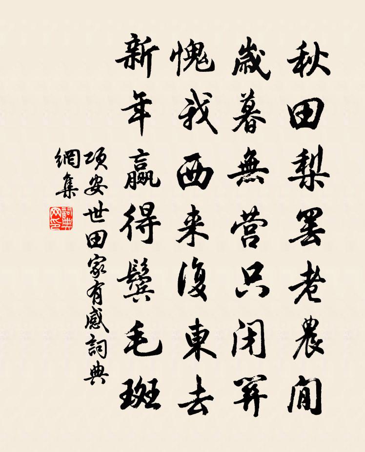 詩詞名句歷史字典書法欣賞書法字典國語詞典說文解字康熙字典古漢語字典標 題 作 者 詩 句 田家有感作者:項安世 朝代:宋代田家有感原文秋田梨罷老農閒,歲暮無營只閉關。愧我西來復東去,新年贏得鬢毛斑。詩詞問答問:田家有感的作者是誰?答:項安世問:田家有感寫於哪個朝代?答:宋代項安世田家有感書法欣賞田家有感書法作品詩詞推薦秋意次林致甫宗丞韻樓鑰〔宋代〕河漢秋來淨,飛星一點過。好風吹暑盡,疎雨送涼多。紈扇收團月,桃笙捲細波。自知恩到骨,欹枕夢無何。郊廟歌辭。梁太廟樂舞辭。登歌佚名〔唐代〕於赫我皇,建中立極。動以武功,靜以文德。昭事上帝,歡心萬國。大報嚴禋,四海述職。巫山一段雲 秋陽觀作尹志平〔元代〕十九遊仙子,隨師歷八荒。西臨回紇大城隍。到處見農桑。一種靈瓜甚美。赤縣幾人知味。大千沙界有多般。鶴駕示恩藏主釋如珙〔宋代〕道在目前無變易,只緣體悉有親疎。黃梅夜半傳衣缽,七百人中一老盧。雜詩 其四陶淵明〔魏晉〕裊裊松標崖,婉孌柔童子。年始二五間,喬柯何可倚。養色含津氣,粲然有心理。如夢令吳文英〔宋代〕春在綠窗楊柳。人與流鶯俱瘦。眉底暮寒生,簾額時翻波皺。風驟。風驟。花徑啼紅滿袖。雜題陳師道〔宋代〕亂水交如線,群山翠作屏。寒輕春稍稍,雪盡麥青青。霜草猶疑滑,風林漸喜聽。生涯鞍馬上,歲月短長亭。洞庭春色/沁園春程垓〔宋代〕錦字親裁,淚巾偷裛,細說舊時。記笑桃門巷,妝窺寶靨,弄花庭前,香濕羅衣。幾度相隨遊冶去,任月細風尖猶謝兩知縣送鵝酒羊面二首陳造〔宋代〕僧樣齋廚冰樣官,飢憑脫粟食無單。不因同里兼同姓,肯念先生苜蓿盤。題李子權江月亭曾豐〔宋代〕太陰元是水之精,與水相宜妙莫名。霽夜懸芒翻浪白,澄秋逗彩涌流清。冰輪影里山河見,玉鑒光中星斗明。萬象奉使契丹二十八首其十三神水館寄子瞻兄四絕蘇轍〔宋代〕虜廷一意向中原,言語綢繆禮亦虔。顧我何功慚陸賈,橐裝聊復助歸田。西園歐陽修〔宋代〕落日叩溪門,西溪復何所。人侵樹里耕,花落田中雨。平野見南山,荒台起寒霧。歌舞昔雲誰,今人但懷古。送裴如晦即席分題三首王安石〔宋代〕十月潁水冰,問君行何為。行不顧斗米,自與五湖期。平生湖上游,幽事略能知。此後君最樂,窮年得游嬉。彩鯨和蒙尉見寄林逋〔宋代〕開尊且醉聖賢酒,理棹時乘旦暮風。懶為躬耕詠梁甫,敢將高臥敵隆中。睢水范成大〔宋代〕一戰填河擁漢屯,拔山意氣已鯨吞。直南即是陰陵路,兵果難將勝負論。寄圓老聞欲移住他院趙汝鐩〔宋代〕妄動生於念,禪床坐不牢。舊窠元自好,新剎有何高。去住身如寄,賓士足謾勞,挑包聞已決,應笑我忉忉。送林學正愛梅二首方回〔宋代〕平生自號愛梅人,家住江南野水濱。屋角暫辭千樹雪,馬頭猶帶一枝春。馨香事業終須在,酸苦工夫盍少伸。莫學西齋小飲贈別陝州沖卿學士歐陽修〔宋代〕今日胡不樂,眾賓會高堂。坐中瀛洲客,新佩太守章。豈無芳◇酒,笑語共一觴。亦有嘉菊叢,新苞弄微黃。所嗟又登碧雲亭感懷三十首吳芾〔宋代〕晚上危亭興未窮,仰看星斗已懸空。可憐熠炔飛撩亂,也欲爭光迥野中。句駱仲舒〔宋代〕張鴻詩在楞伽峽,韓愈碑留燕喜亭。名句推薦廬山煙雨浙江潮,未至千般恨不消。蘇軾《廬山煙雨浙江潮》 書不盡言,言不盡意。佚名《易傳·繫辭傳上·第十二章》 材愨者常安利,盪悍者常危害荀子《荀子·榮辱》 欲說還休,卻道“天涼好個秋”!辛棄疾《醜奴兒·書博山道中壁》 風驅急雨灑高城,雲壓輕雷殷地聲。劉基《五月十九日大雨》 勾引東風,也知芳思難禁。韓疁《高陽台·除夜》 君子務修其內而讓之於外。荀子《荀子·儒效》 山驛淒涼,燈昏人獨寢。陸游《清商怨·葭萌驛作》 今我來思,雨雪載途。佚名《出車》 去年戰桑乾源,今年戰蔥河道。李白《戰城南》